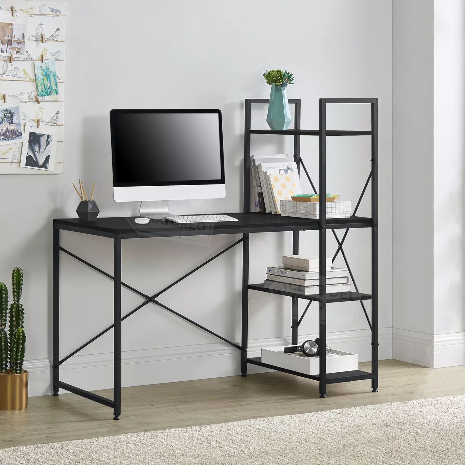 Práctico escritorio ideal para oficina, escuela, casa, etc. Su mesa mide un área de 120 x 60 cm, grande para realizar cualquier tarea administrativa. Cuenta con un estante lateral con una altura de hasta 122 cm, que se puede colocar en cualquier lado del escritorio que usted desee. Fabricado en material de acero color negro en su estructura, estable y duradero. La mesa esta fabricada en madera industrializada con melamina tipo madera natural color negro. La altura de la mesa es de 74 cm cabe perfectamente un silla de oficina.