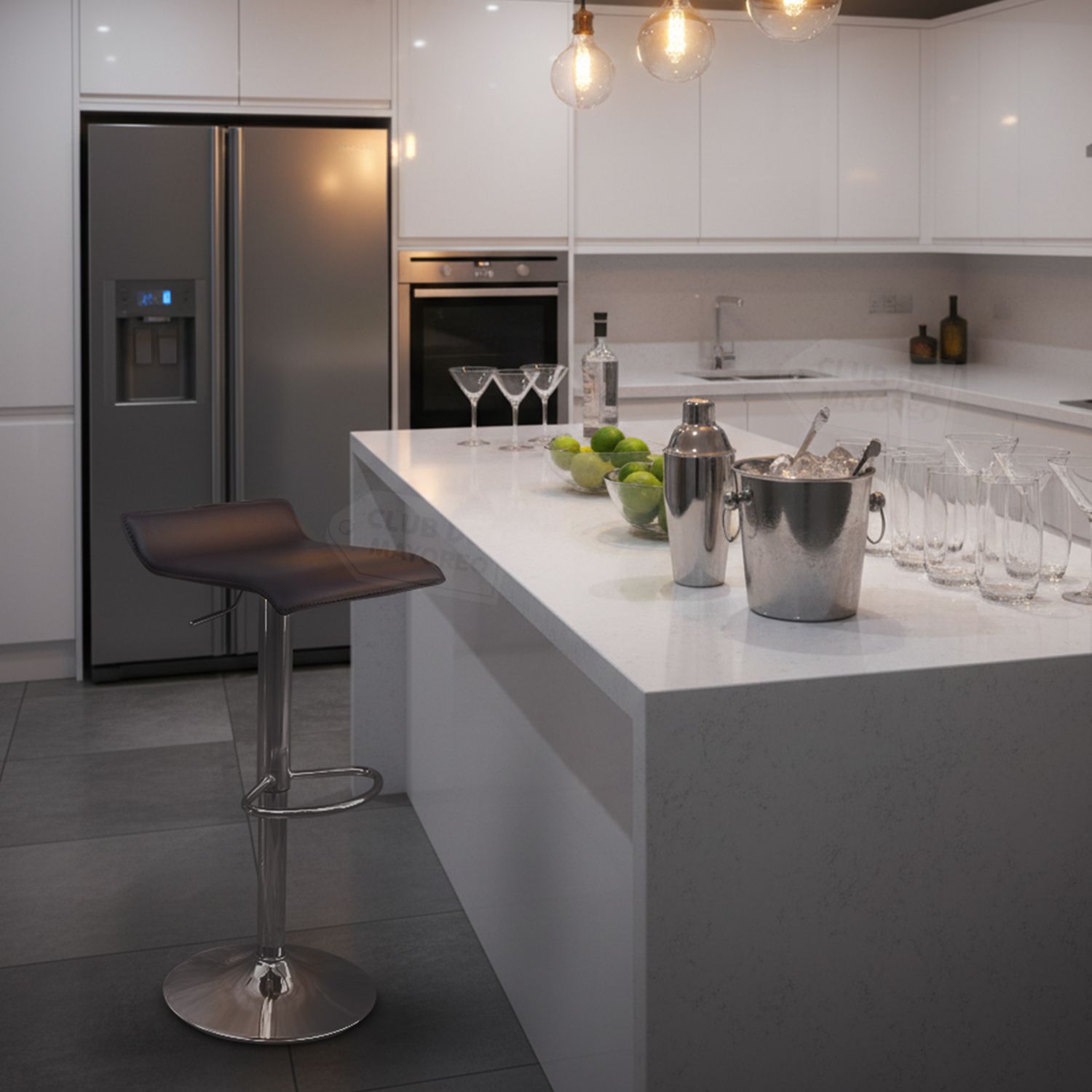 Banco de cocina de diseño moderno con asiento plano tapizado en vinipiel color café, ideal para barras, islas y desayunadores. Su tono cálido aporta elegancia y combina fácilmente con espacios modernos, industriales o contemporáneos.