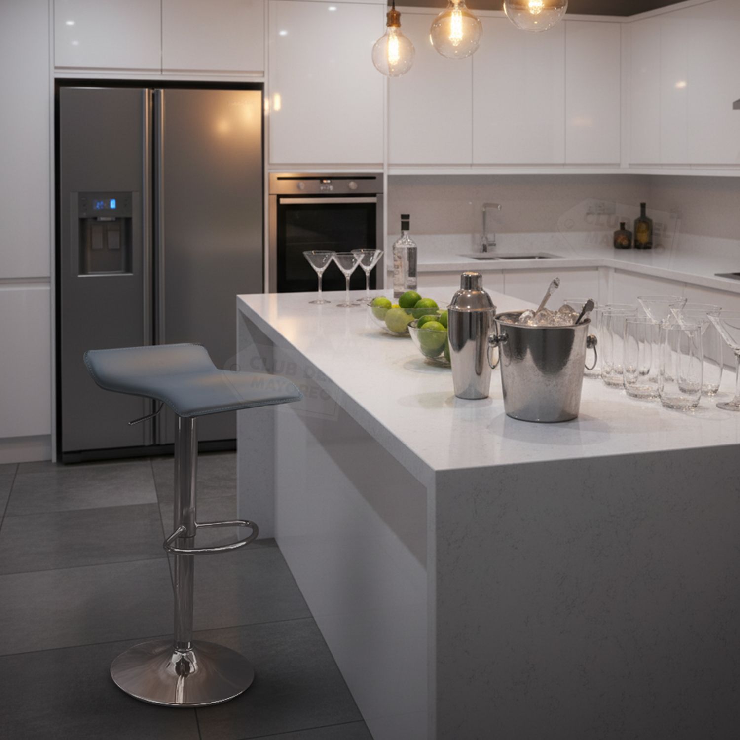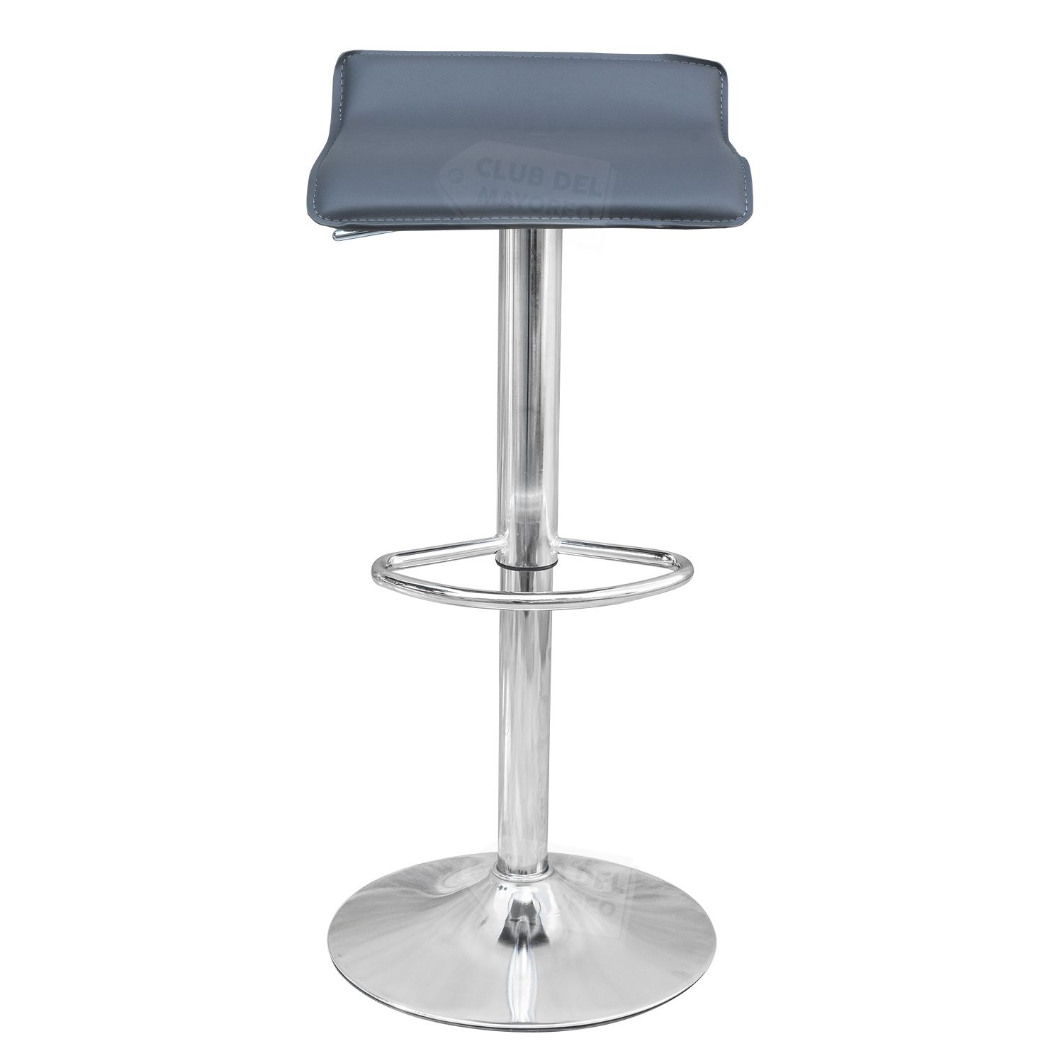 Banco de cocina con asiento plano tapizado en vinipiel color gris, de estilo moderno y versátil que se adapta fácilmente a distintos tipos de decoración. Su color neutro lo hace ideal para cocinas contemporáneas y minimalistas.