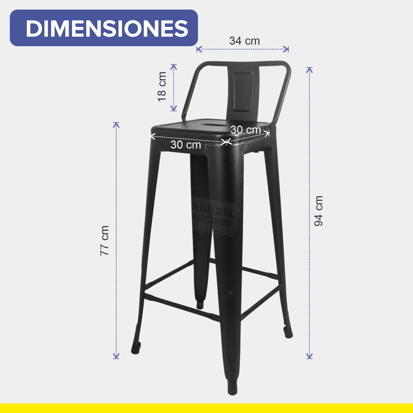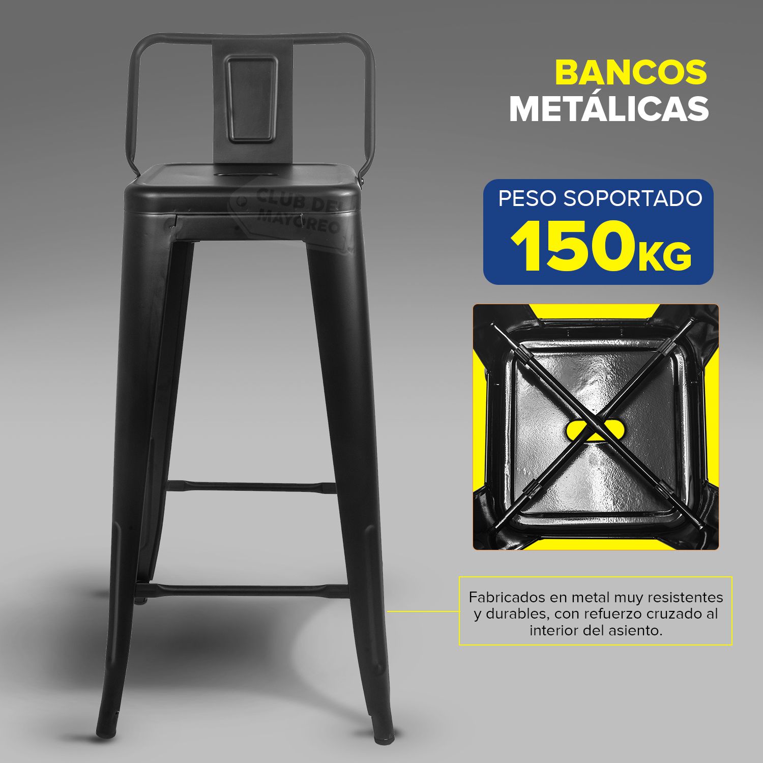 Banco alto para barra o bar metalico diseño tolix ideal para exteriores, cafeterías, restaurantes, fondas, jardín, cocina, barra, bar, patio, etc. Fabricado en resistente material de metal ligero. Estructura color negro brillante con asiento comodo y respaldo anatómico. El banco puede soportar un peso de 150 Kgs.