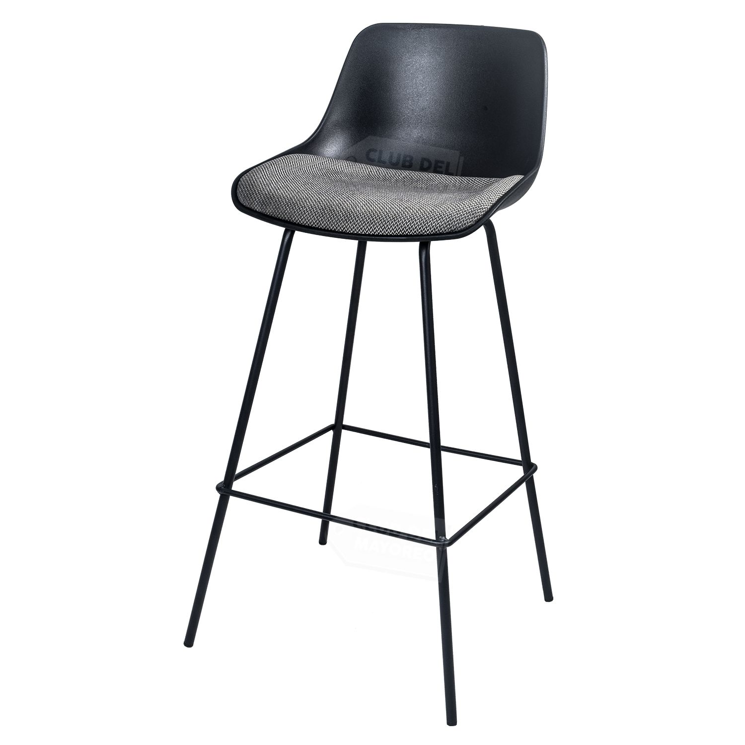 Banco alto para barra, bar, restaurante, comidas, etc. Moderno estilo eames color negro con cojinete acolchado en asiento. Estructura metalica color negro, resistente que puede soportar un peso de hasta 100 kg.
