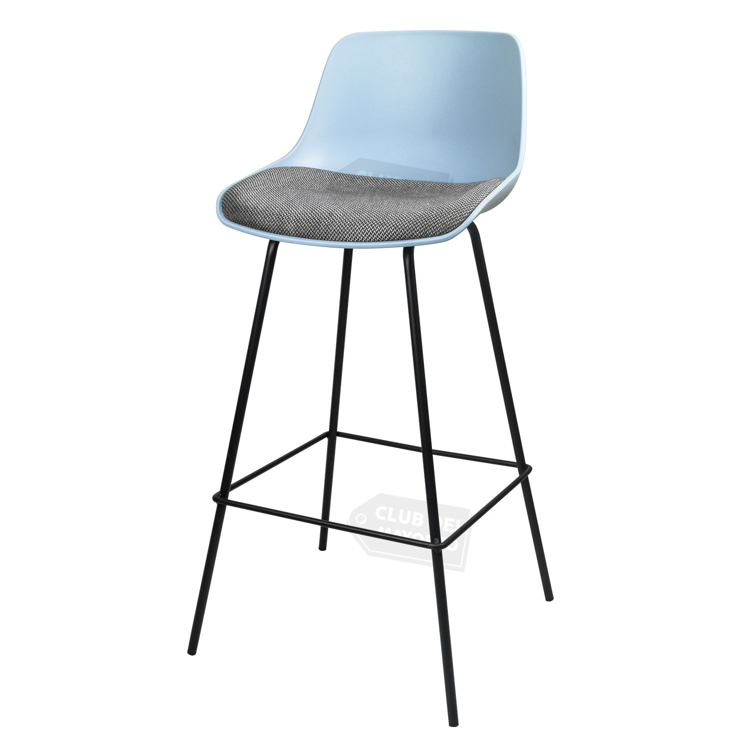 Banco alto para barra, bar, restaurante, comidas, etc. Moderno estilo eames color gris azulado con cojinete acolchado en asiento. Estructura metalica color negro, resistente que puede soportar un peso de hasta 100 kg.