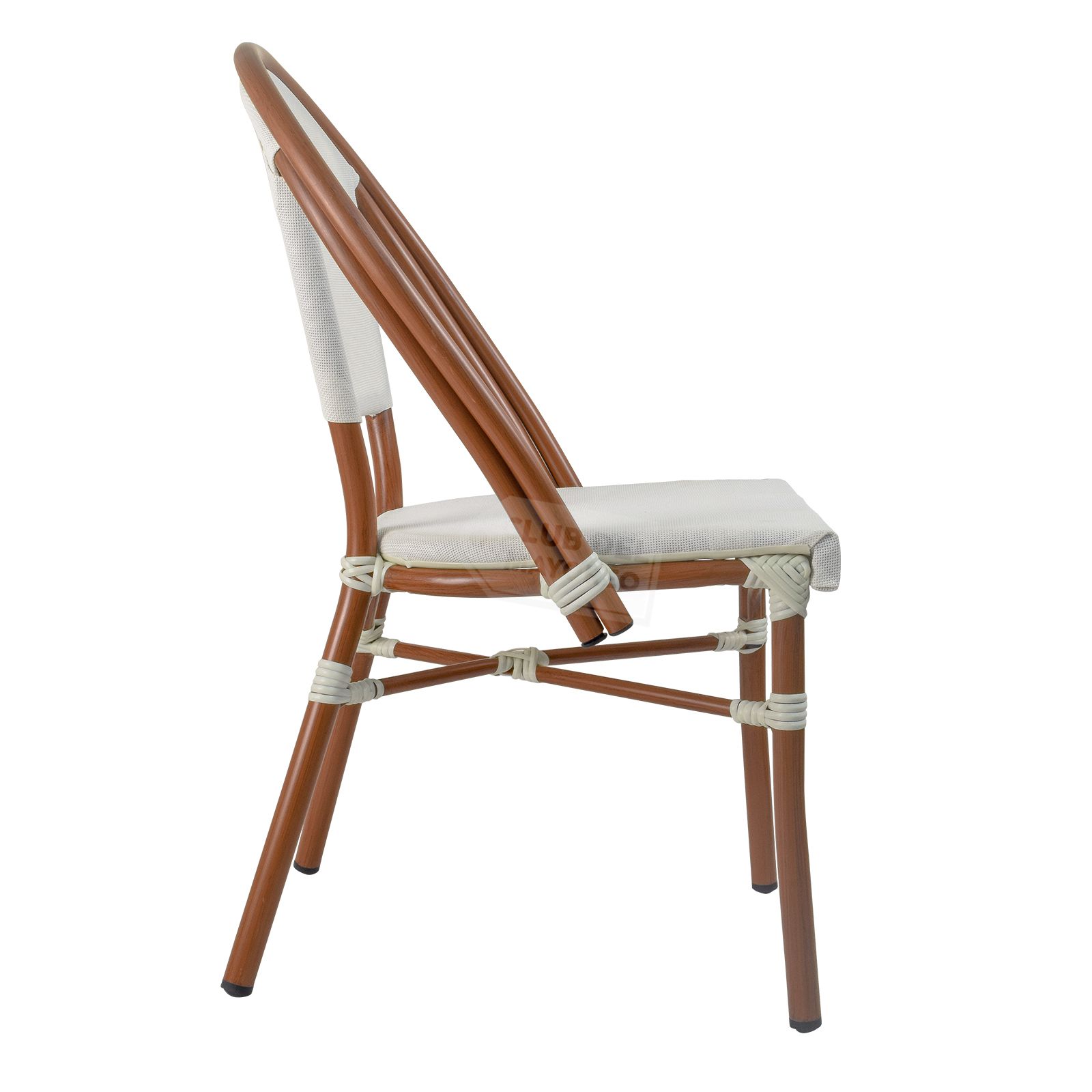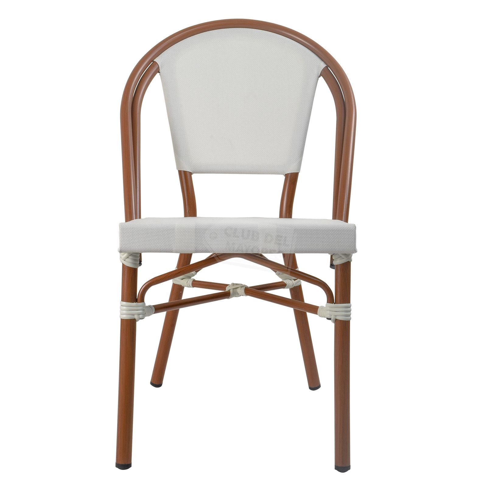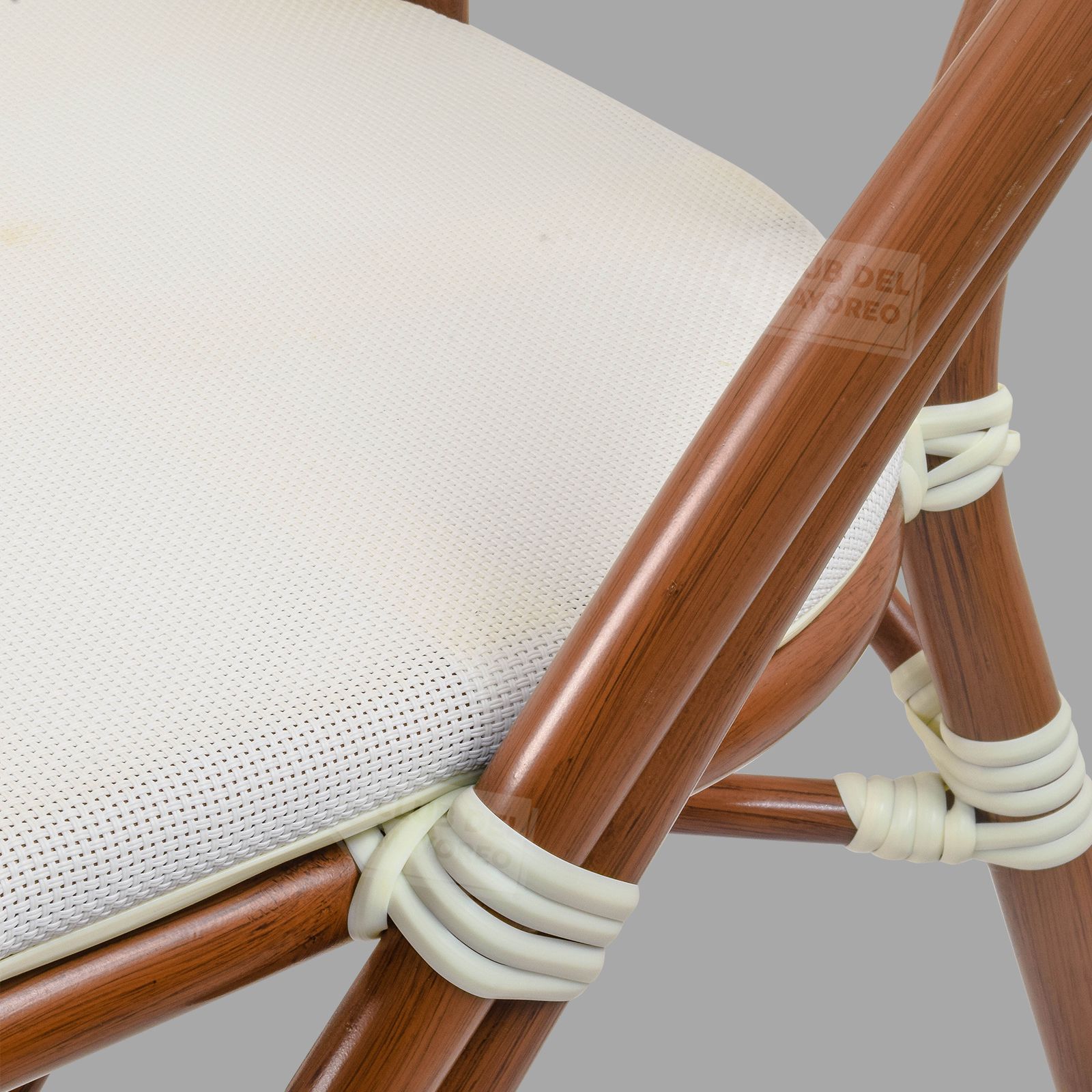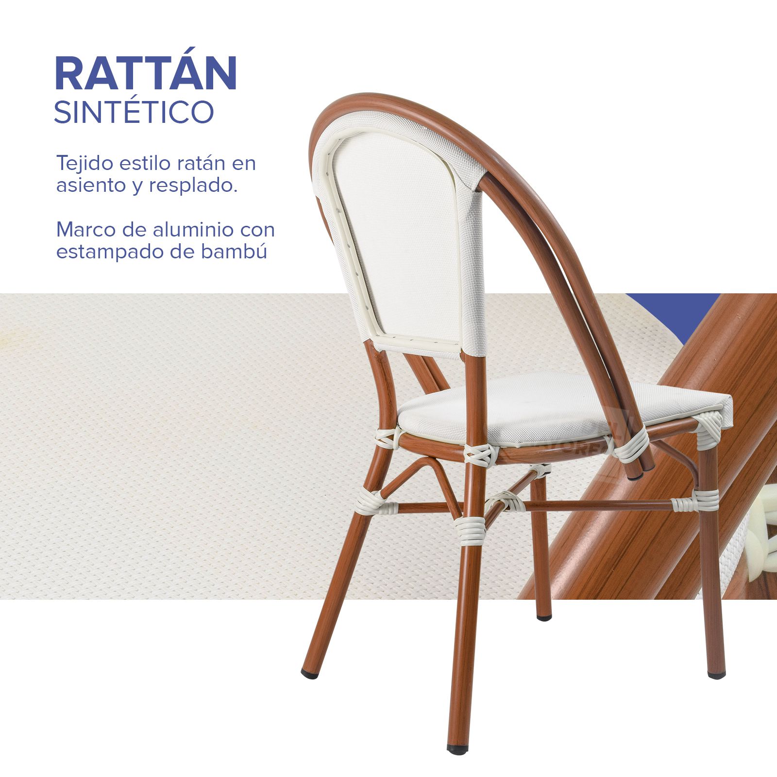 Inspirada en las cafeterías exteriores francesas pensadas en un ambiente al aire libre y en la calle, color sutil y elegante con diseño ovalado en respaldo para mejor comodidad y relajación. Fabricadas en estructura de aluminio las convierten en ligeras y nada pesadas. Texturizadas en tipo madera bambú oscuro con imitacion de amarre en cada estructura. Asiento y respaldo en malla entretejido estilo rattan sintético de gran durabilidad. La silla puede soportar un peso máximo de 130 kg.