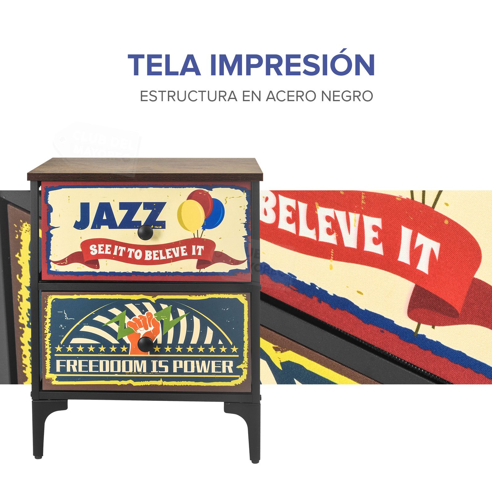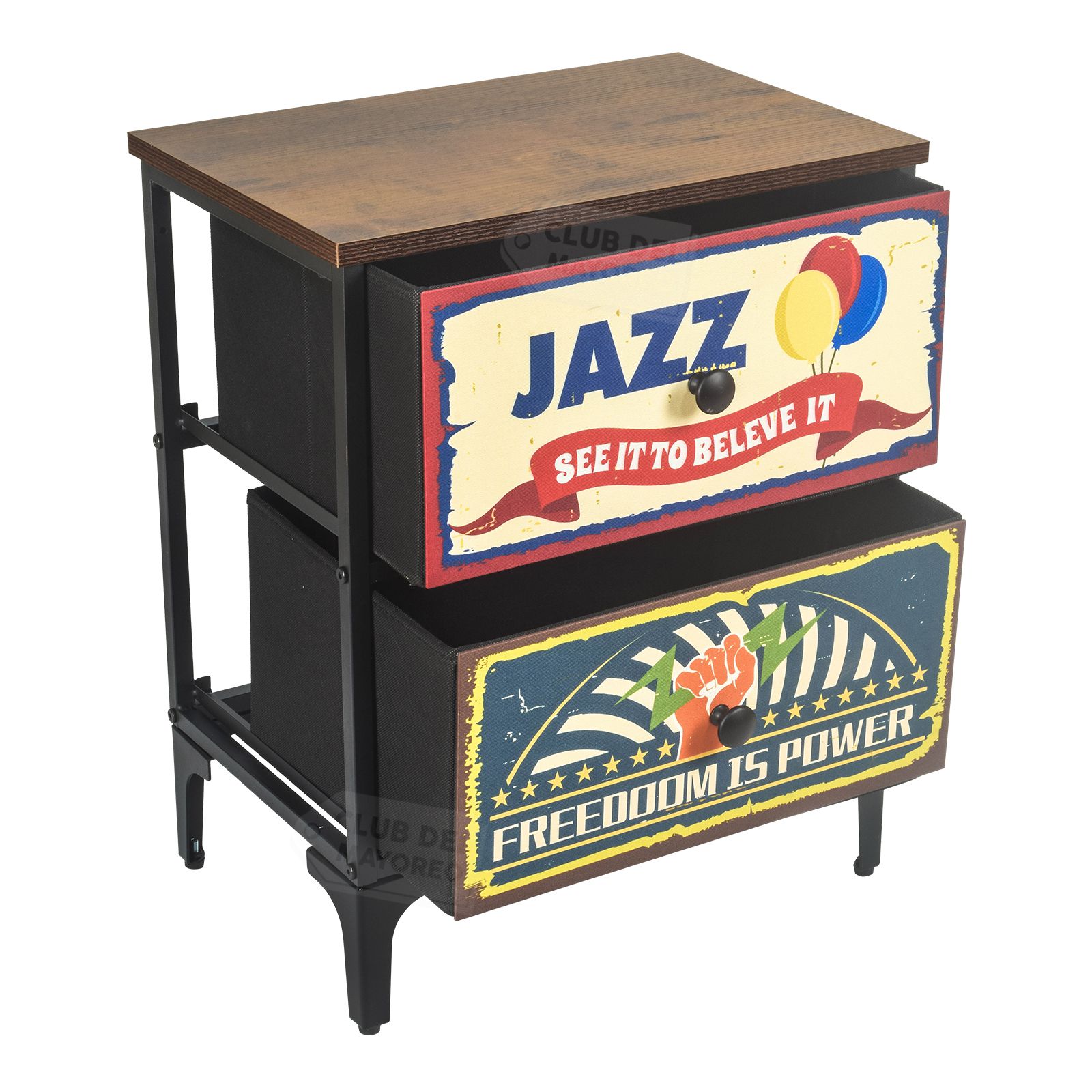 Moderno y sencillo buro de la coleccion New York con dos cajones en tela impresa con diseño diferentes, interior con tapas en MDF y tela no tejida color negro. Fabricado con estructura metálica resistente y repisa superior en madera industrializada con melamina tipo madera roble. Ideal para combinar con cualquier ambiente de tu recámara. Puede soportar hasta 30 kg en la repisa y entre 8 y 10 Kg en cada cajon. Fácil de armar en solo 20 minutos.