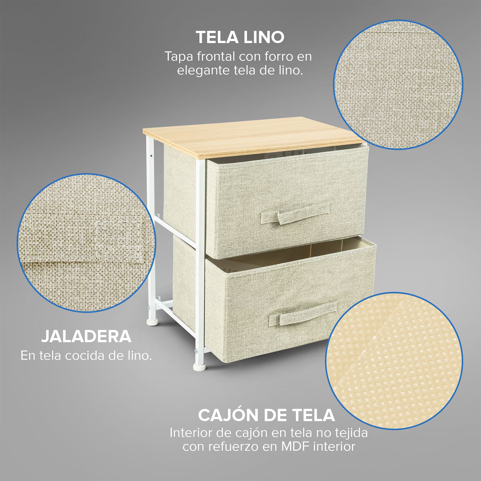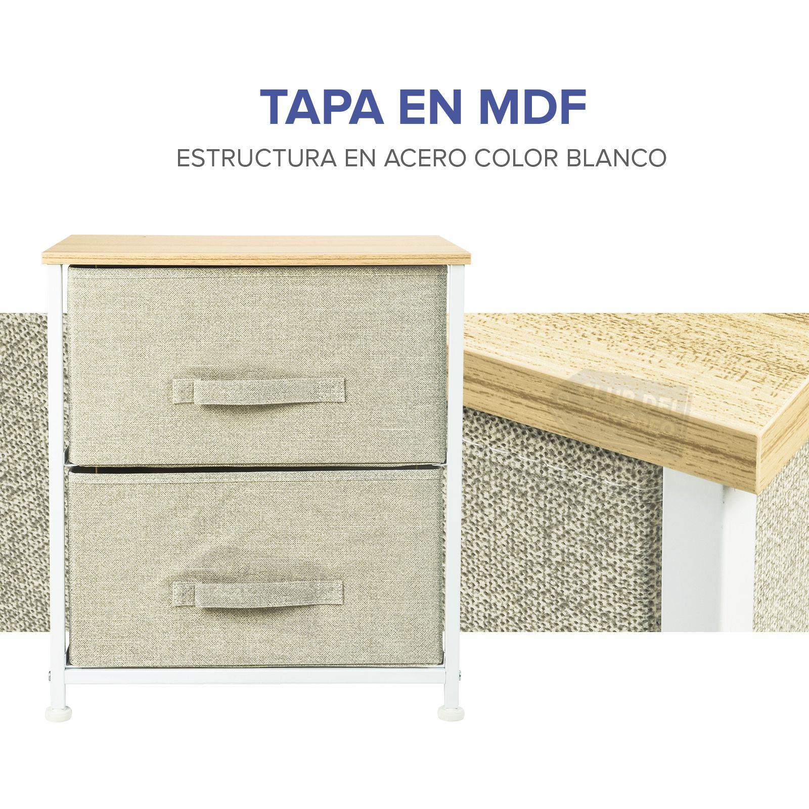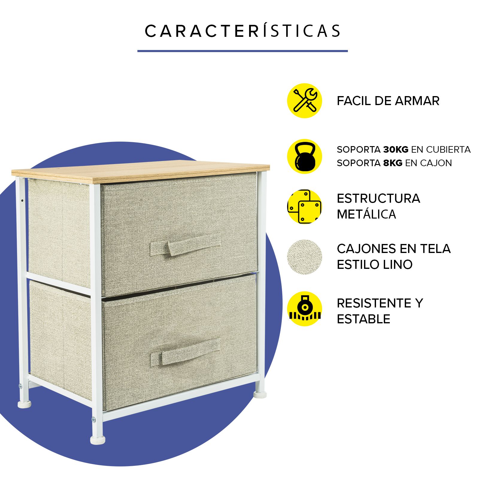 Moderno y sencillo buro de la coleccion Paris con dos cajones en tela de lino color beige, interior con tapas en MDF y tela no tejida color beige. Fabricado con estructura metálica resistente y repisa superior en madera industrializada con melamina tipo madera natural. Idea para combinar con cualquier ambiente de tu recámara. Puede soportar hasta 30 kg en la repisa y entre 8 y 10 Kg en cada cajon. Fácil de armar en solo 20 minutos.