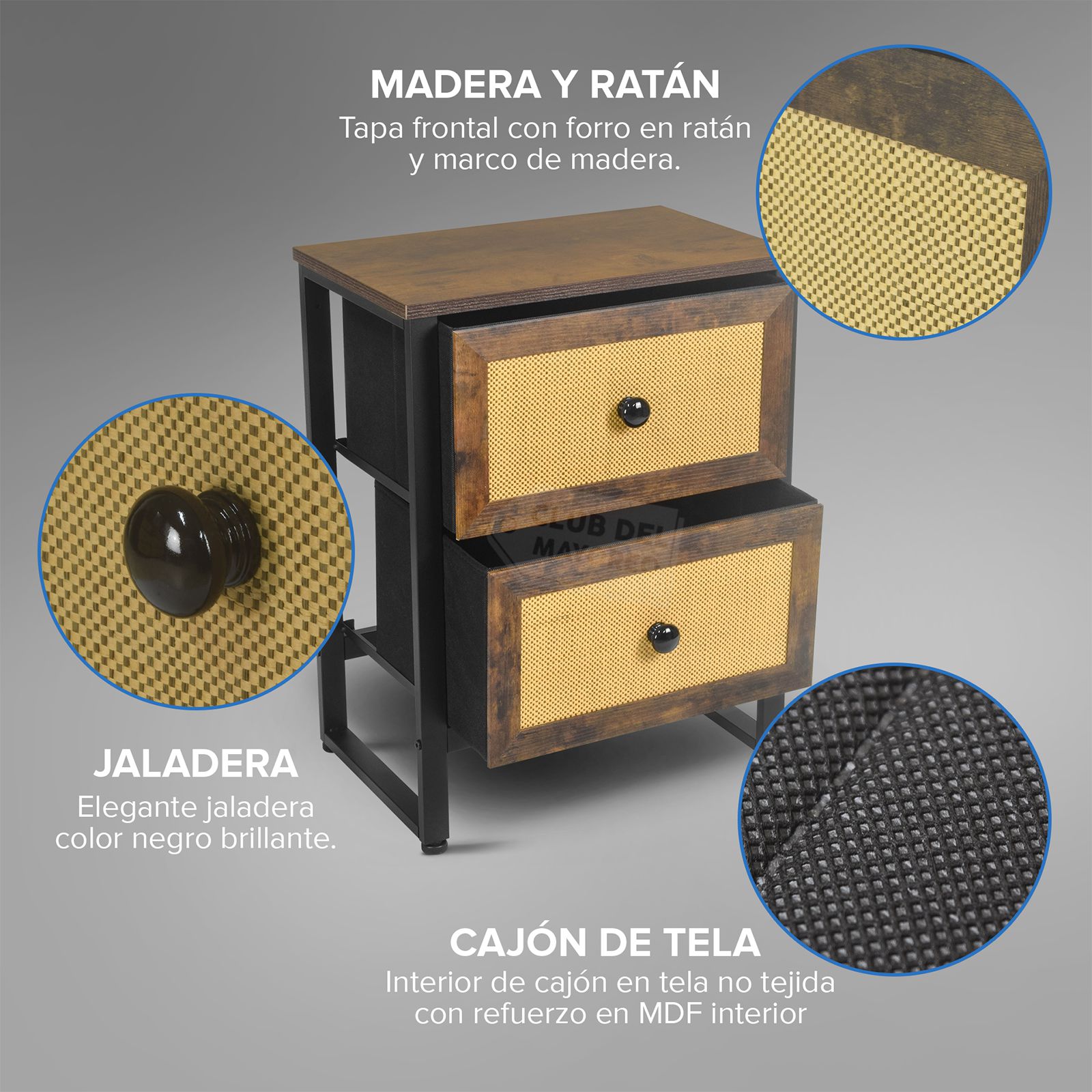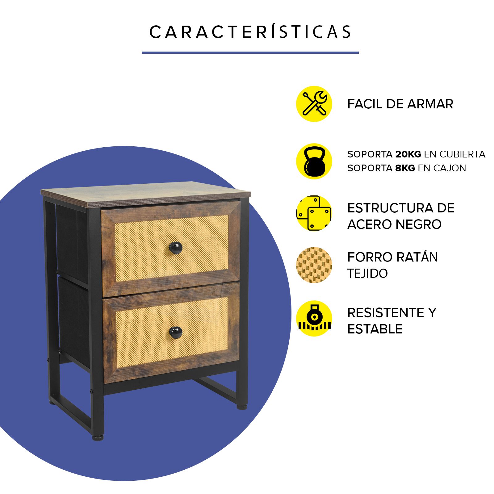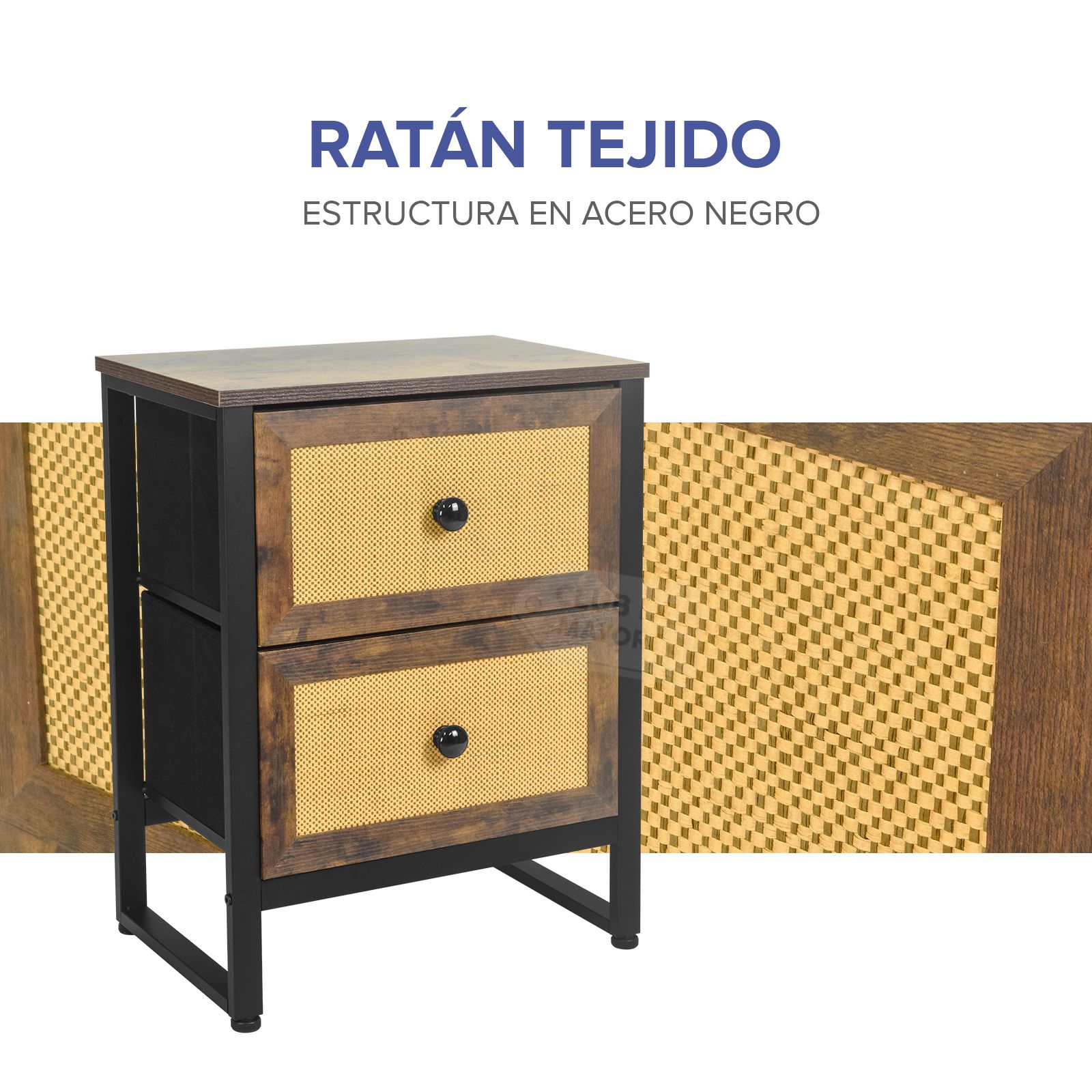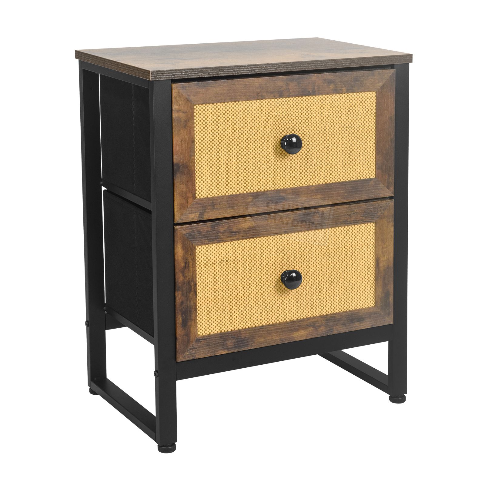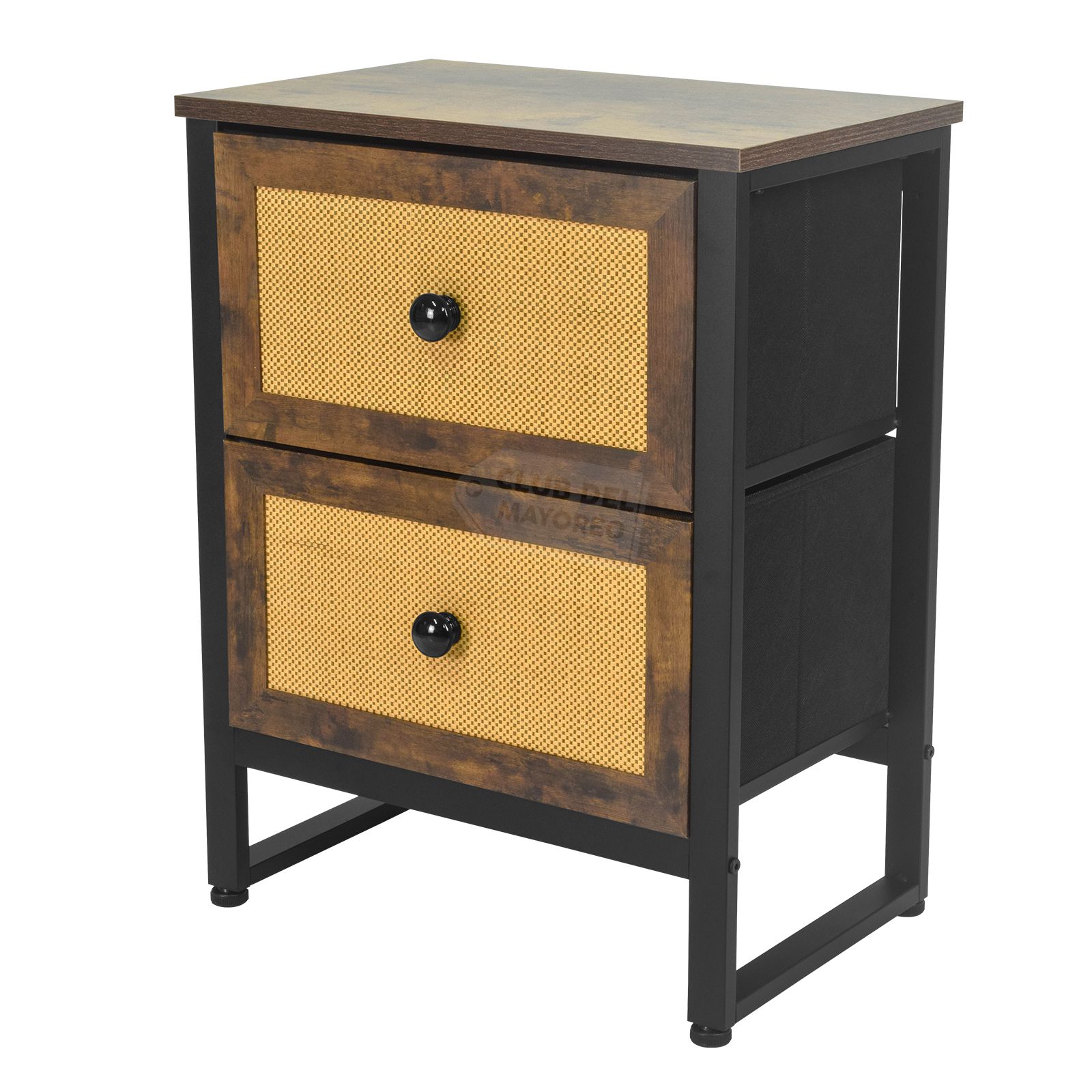 Moderno buro de la coleccion Budapest con dos cajones en marco de madera tipo roble y diseño estilo ratán color beige, interior con tapas en MDF y tela no tejida color negro. Fabricado con estructura metálica resistente y repisa superior en madera industrializada con melamina tipo madera roble. Ideal para combinar con cualquier ambiente de tu recámara. Puede soportar hasta 30 kg en la repisa y entre 8 y 10 Kg en cada cajon. Fácil de armar en solo 20 minutos.