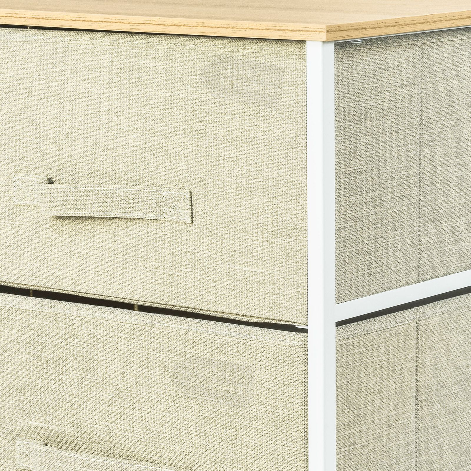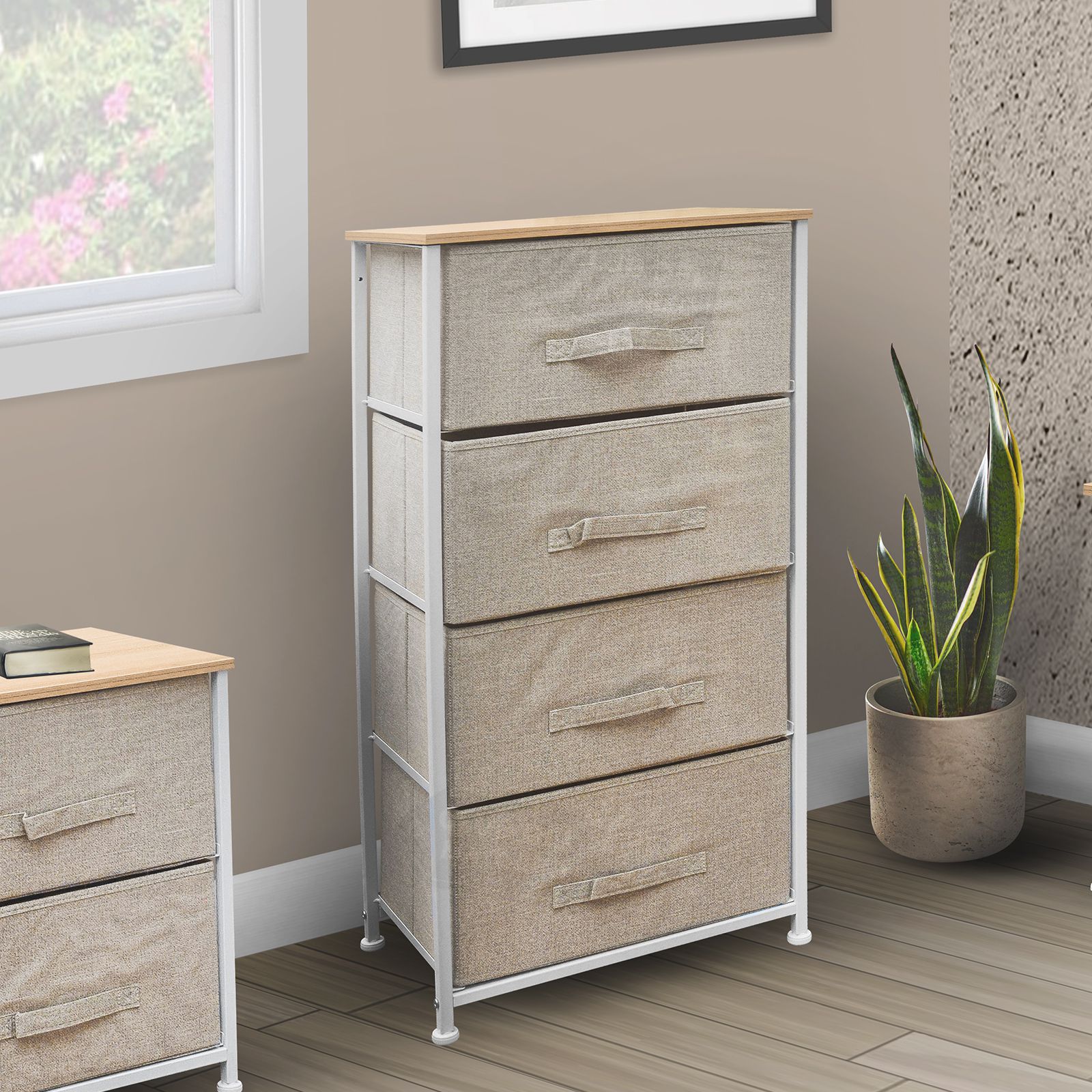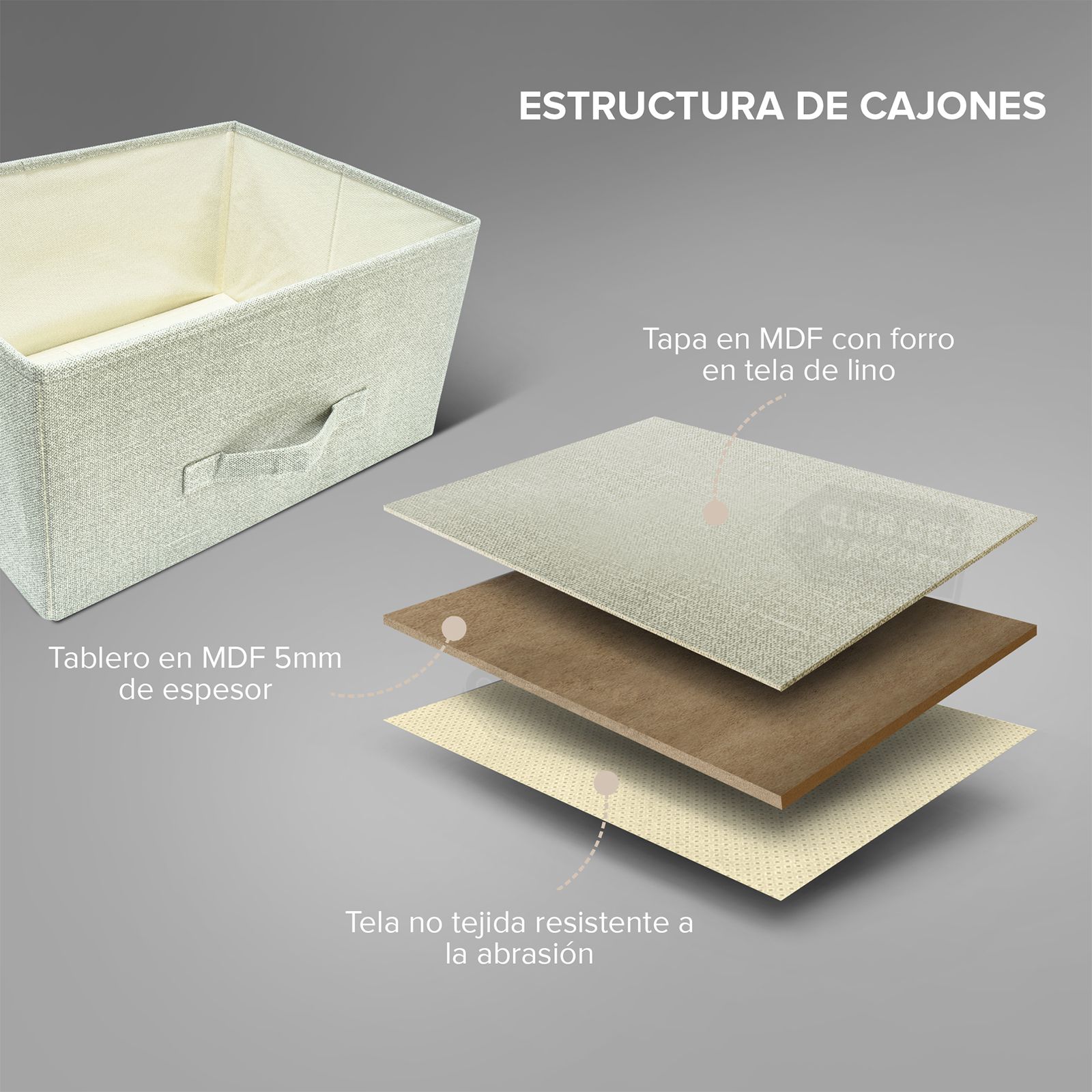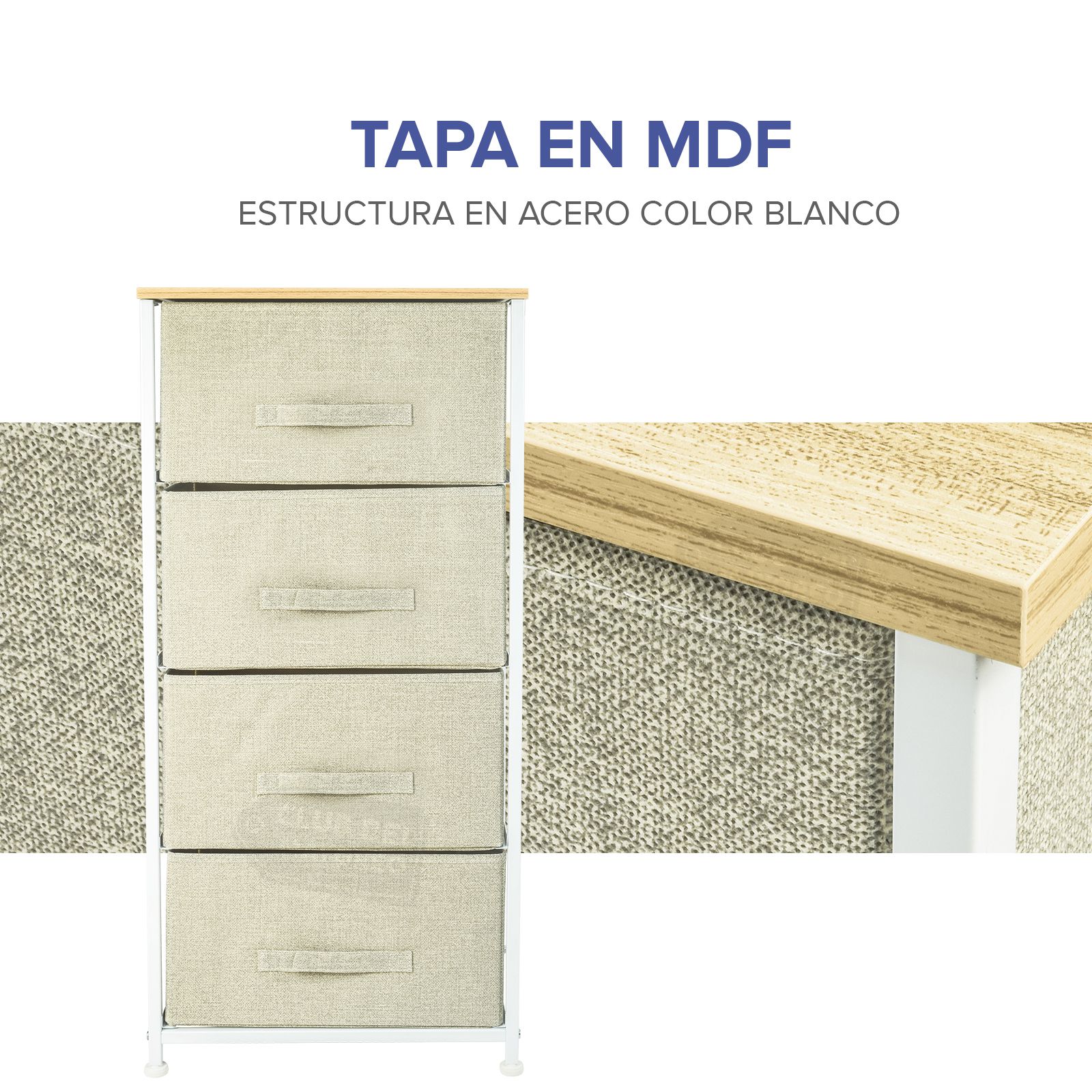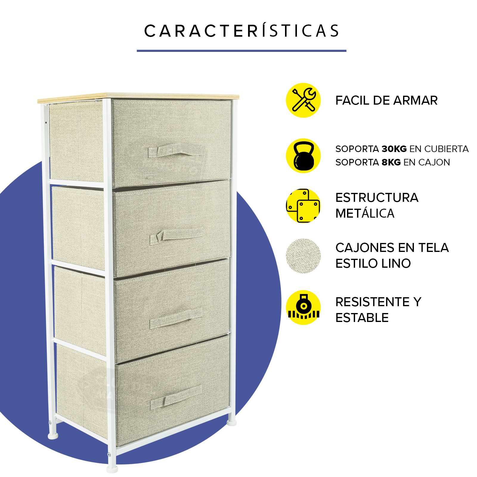 Moderna cajonera vertical de la coleccion Paris con cuatro cajones en tela de lino color beige, interior con tapas en MDF y tela no tejida color beige. Fabricado con estructura metálica resistente y repisa superior en madera industrializada con melamina tipo madera natural. Idea para combinar con cualquier ambiente de tu recámara. Puede soportar hasta 30 kg en la repisa y entre 8 y 10 Kg en cada cajon. Fácil de armar en solo 20 minutos.