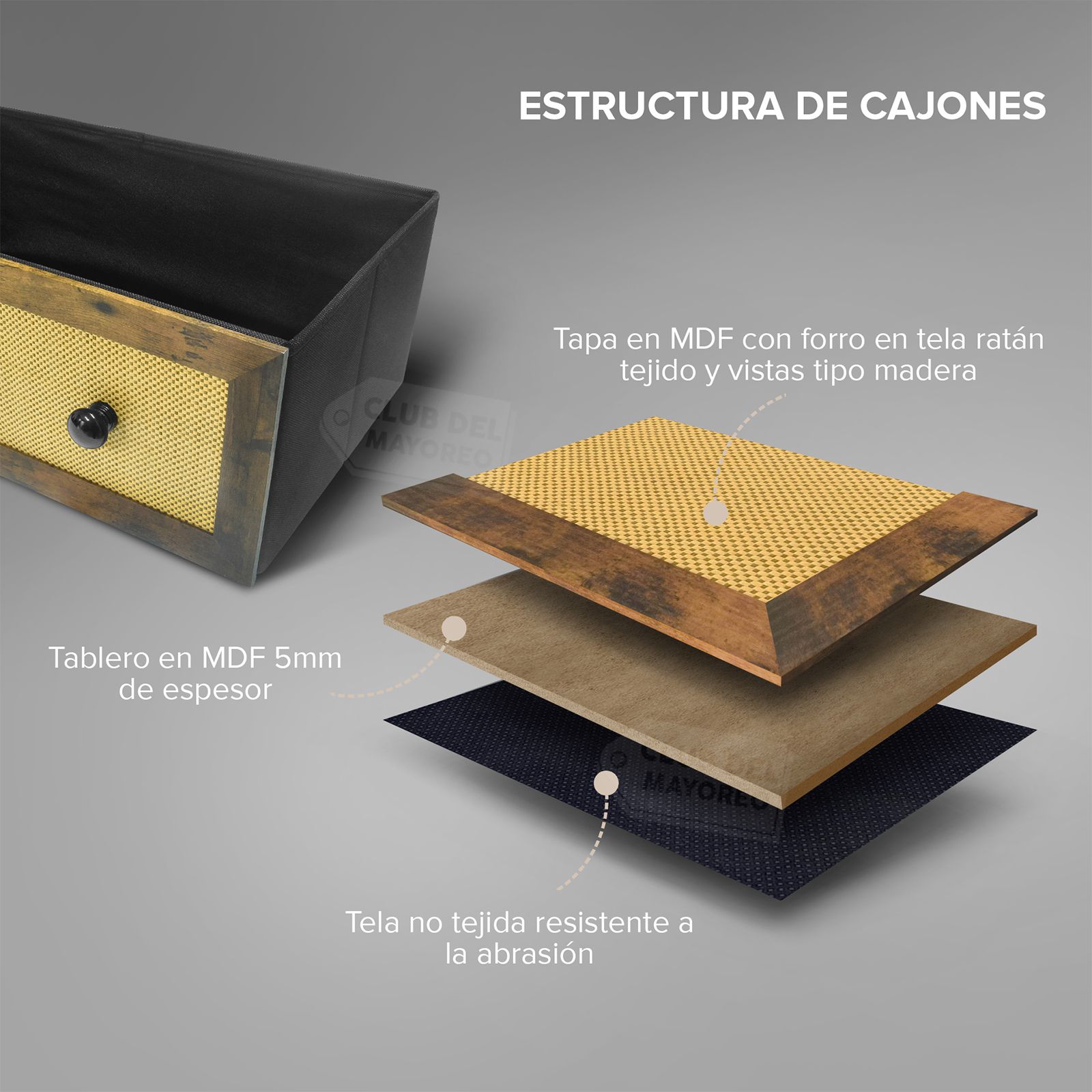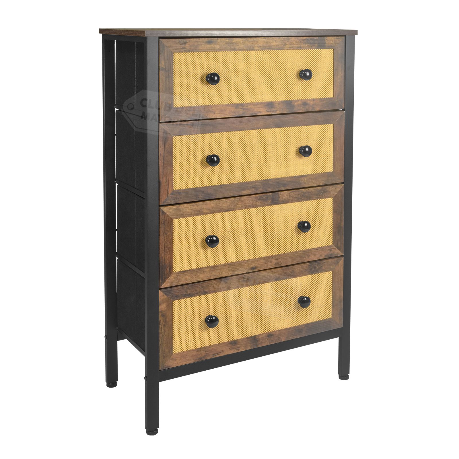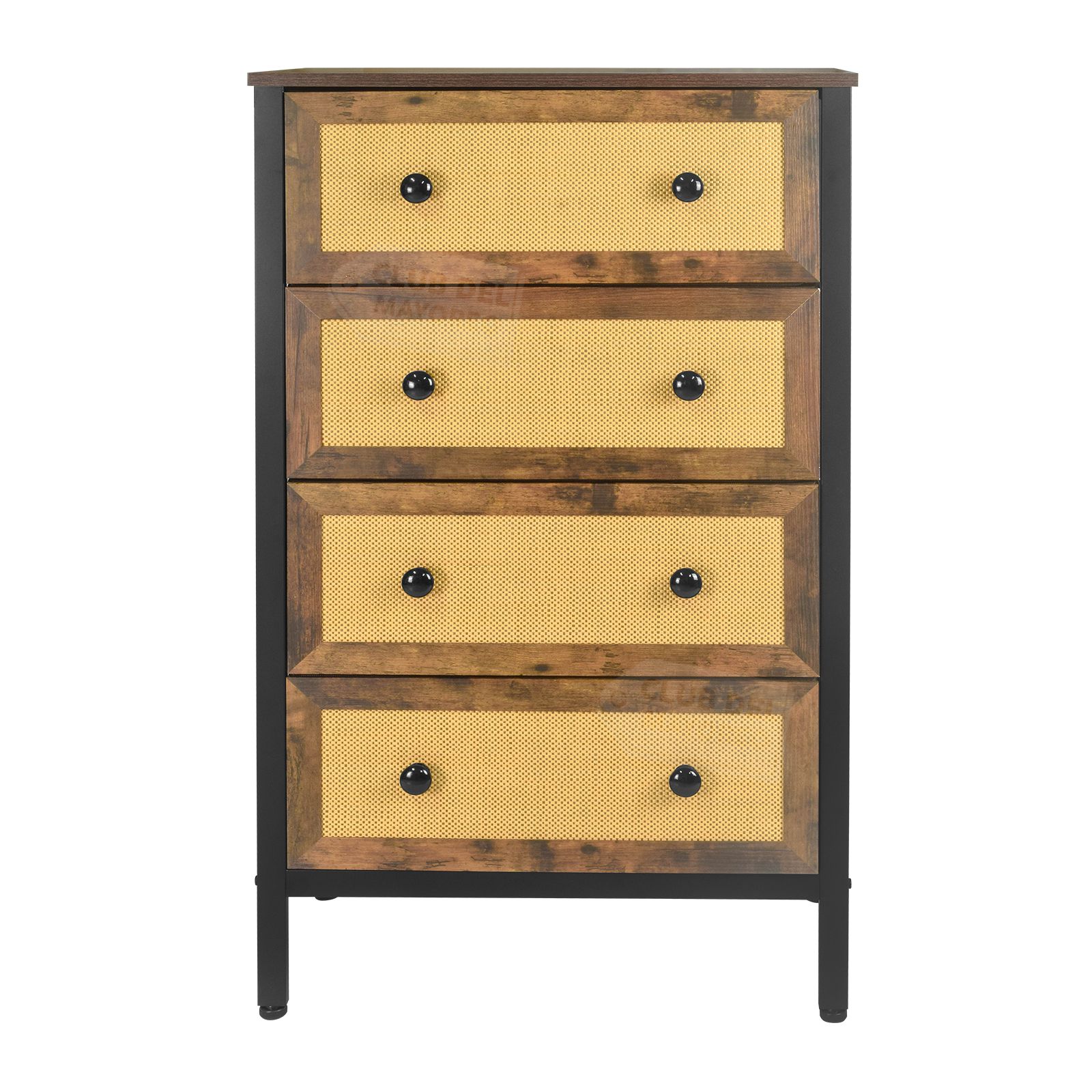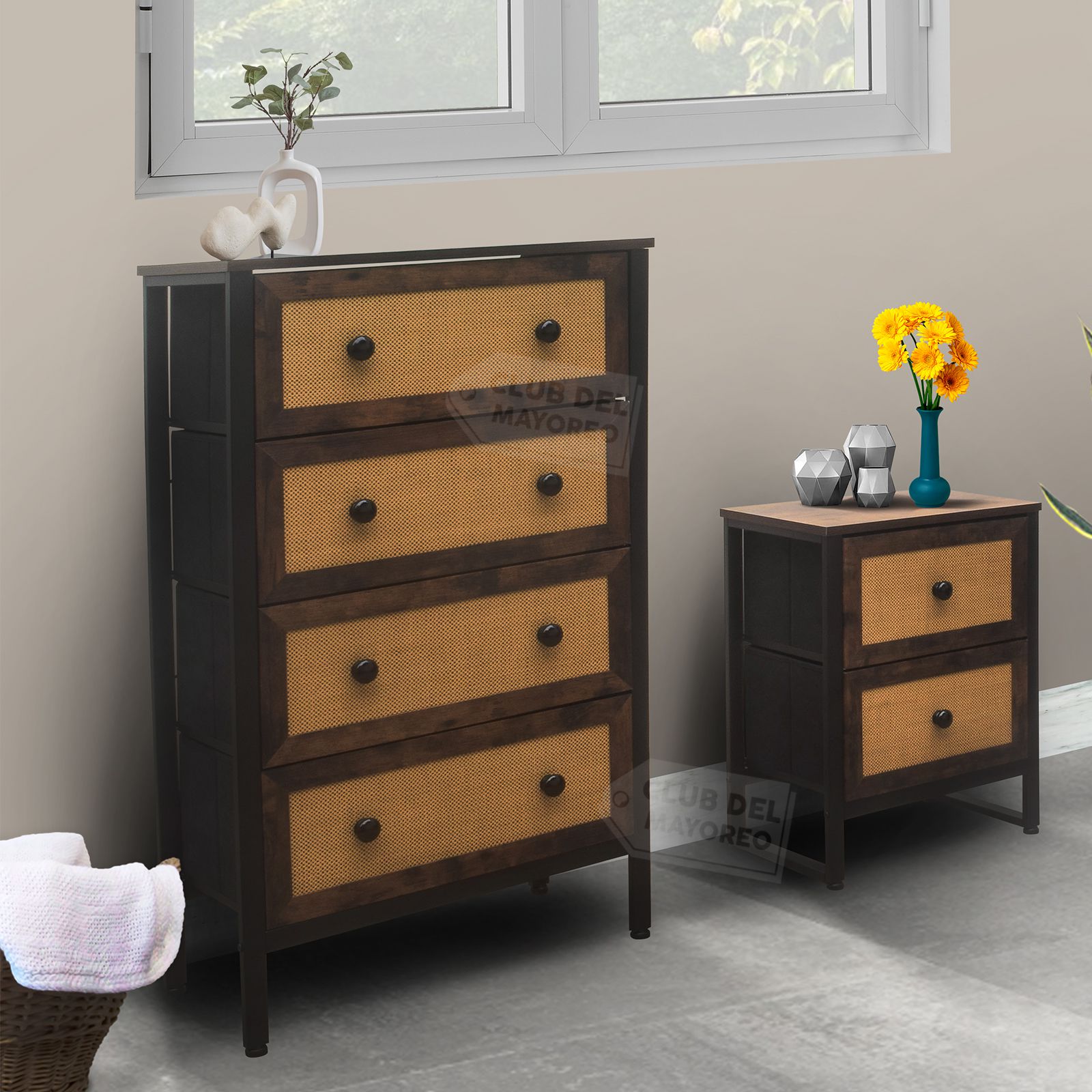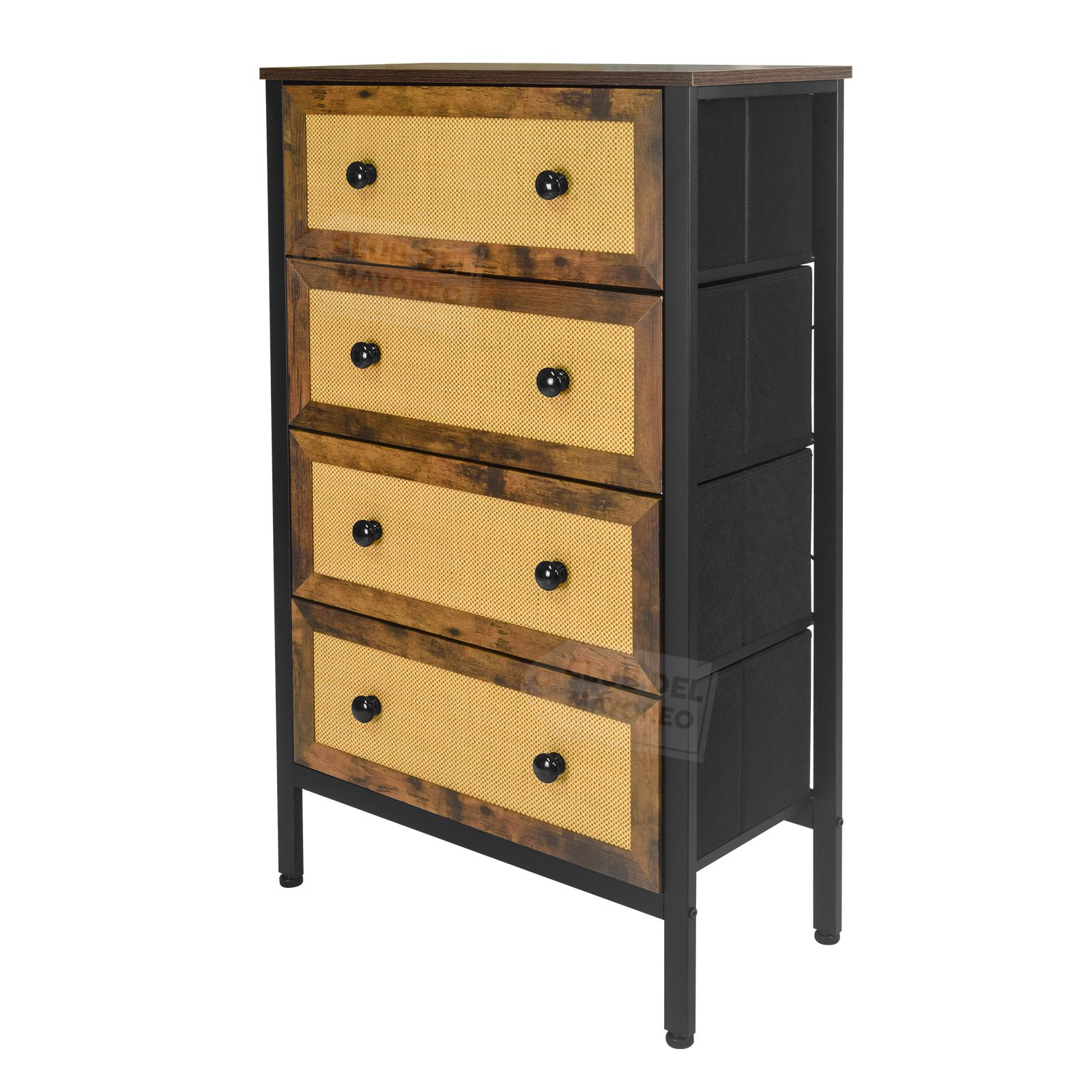 Gran cajonera vertical ancha de la coleccion Budapest con cuatro cajones en marco de madera tipo roble y diseño estilo ratán color beige, interior con tapas en MDF y tela no tejida color negro. Fabricado con estructura metálica resistente y repisa superior en madera industrializada con melamina tipo madera roble. Ideal para combinar con cualquier ambiente de tu recámara. Puede soportar hasta 50 kg en la repisa y entre 8 y 10 Kg en cada cajon. Fácil de armar en solo 20 minutos.