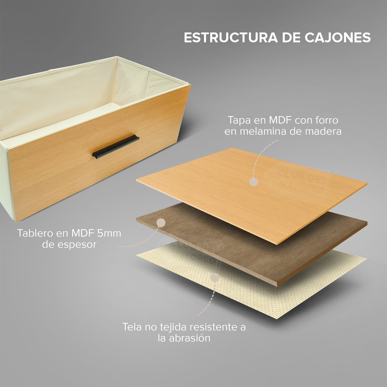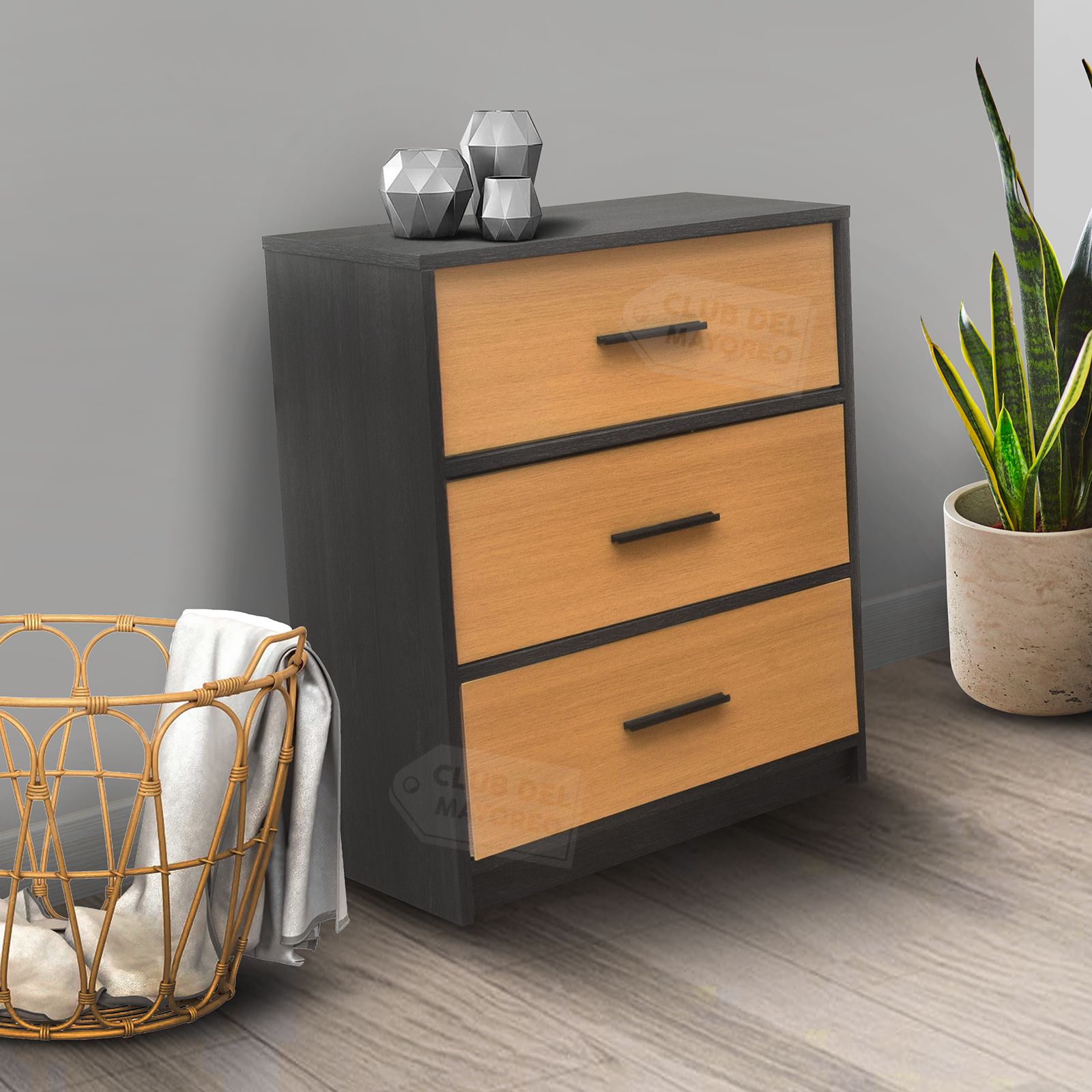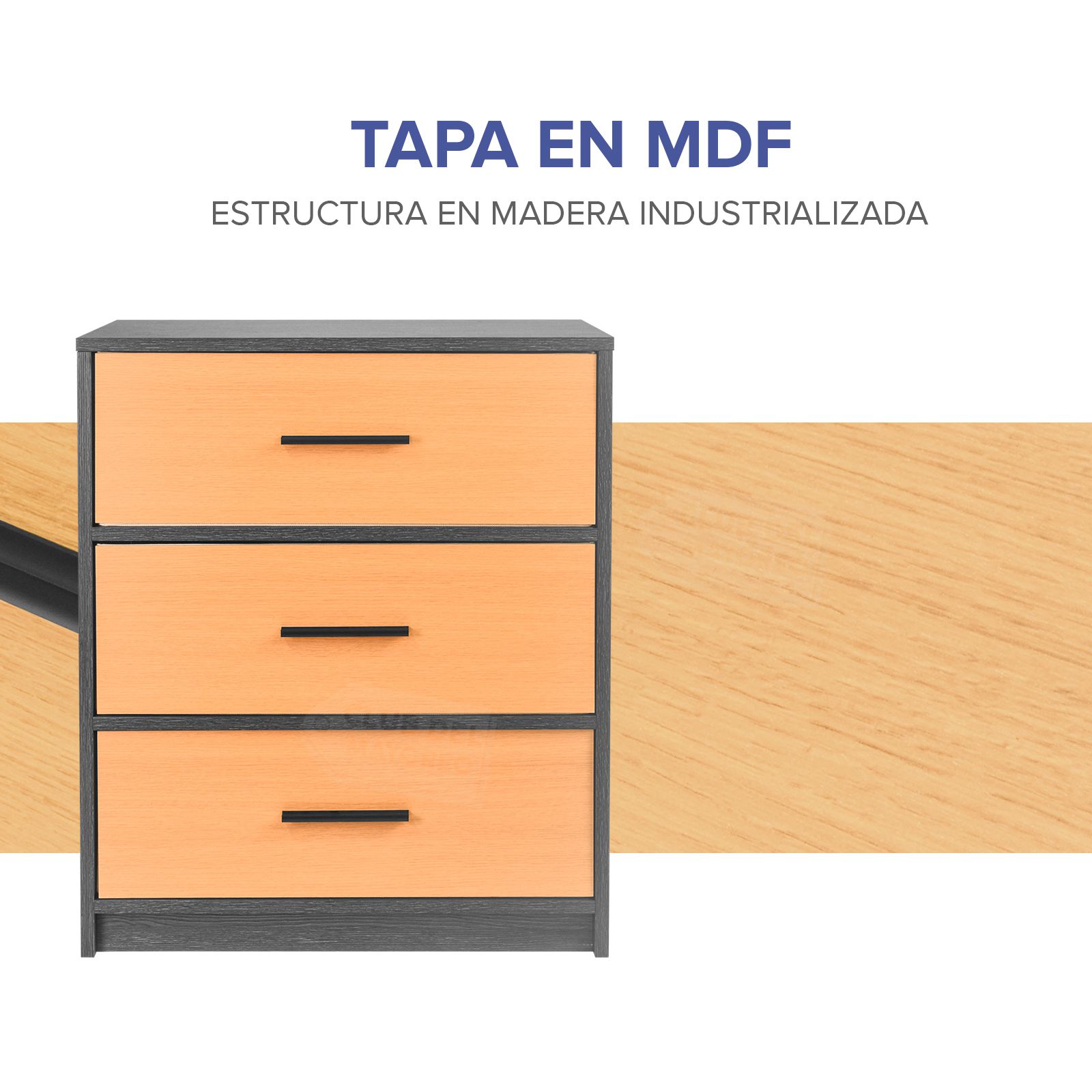 Moderna cajonera vertical de la coleccion Oslo con 3 cajones en tela con tapa frontal en MDF y melamina tipo madera de pino natural, interior con tapas en MDF y tela no tejida color beige. Fabricado con estructura en madera industrializada resistente y con melamina tipo madera gris. Ideal para combinar con cualquier ambiente de tu recámara. Puede soportar hasta 40 kg en la repisa y entre 10 y 15 Kg en cada cajon. Fácil de armar en solo 30 minutos.