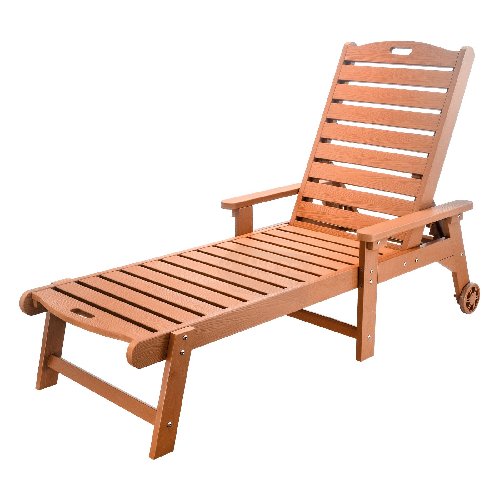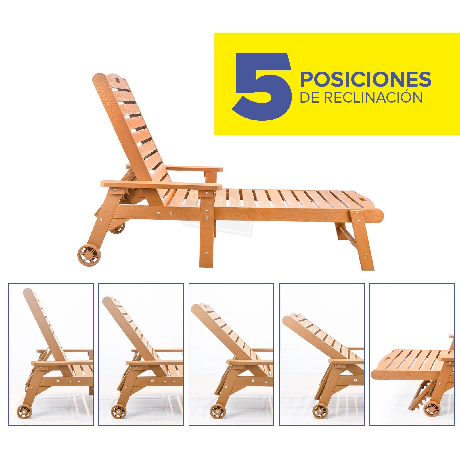 Relajese completamente y disfrute de un día soleado al exterior de una piscina, playa, jardin u hotel, ya que tiene un resplado reclinable en hasta 5 posiciones para disfrutar del ángulo perfecto para descansar. Fabricado en resina de polietileno resistente a cualquier clima por periodos prolongados y con diseño tipo de madera en roble natural. Es ligero y fácil de mover gracias a sus ruedas. Puede soportar hasta un peso máximo de 170 kg. Fácil de limpiar y libre de mantenimiento.