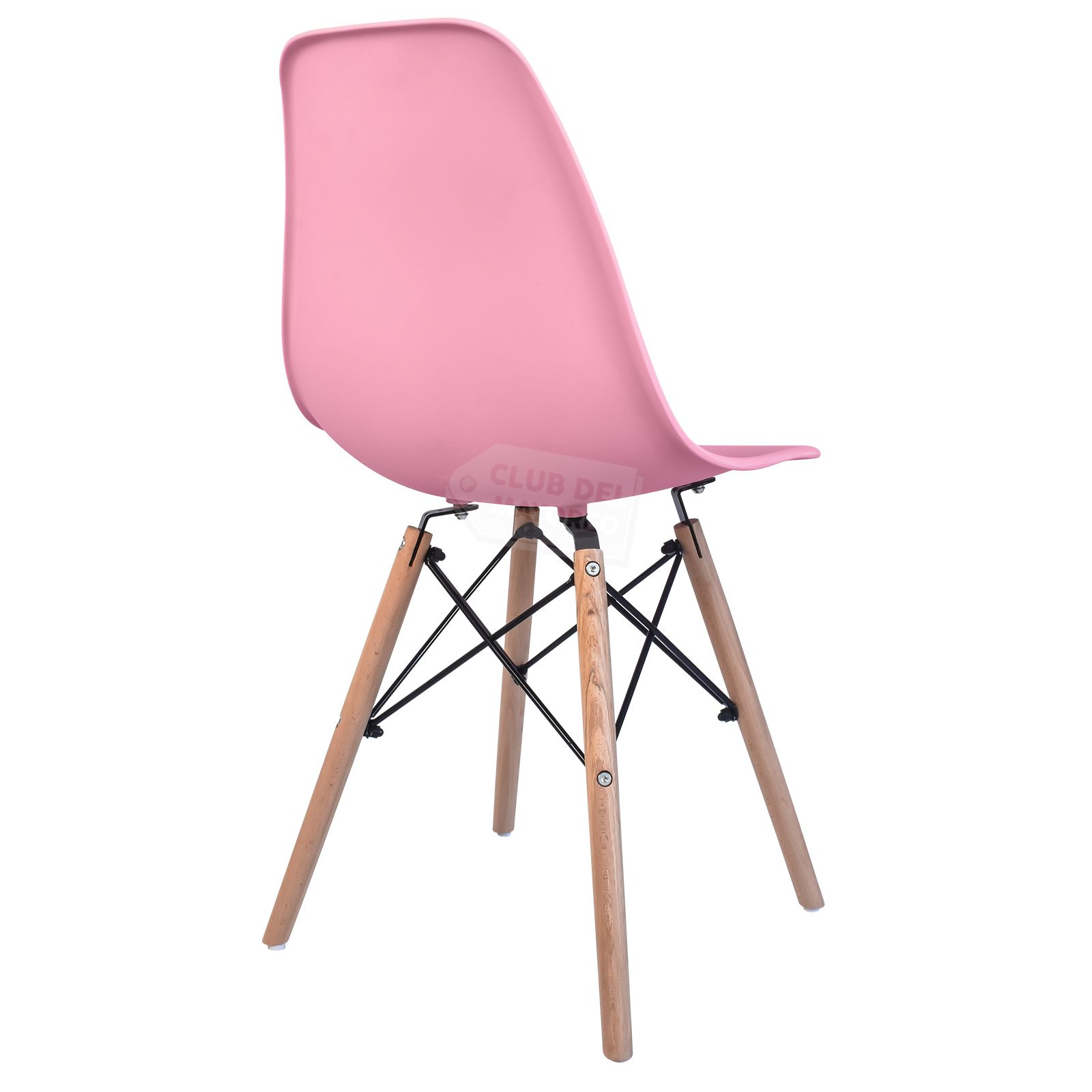 Silla moderna estilo eames color rosa, asiento en plastico resistente. Estructura de patas en madera, con estructura entrelazada que puede soportar un peso de hasta 100 kg.