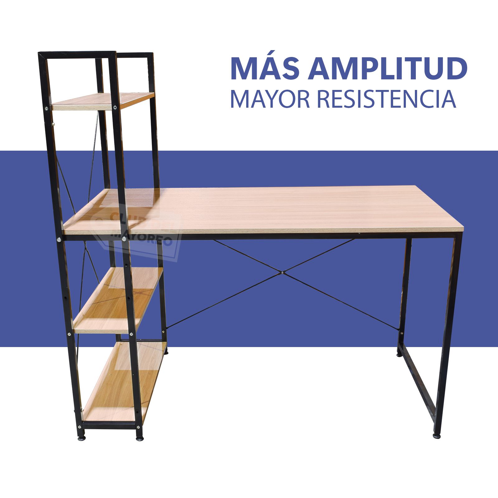 Práctico y funcional escritorio ideal para oficina, escuela, casa, etc. Su mesa mide un área de 120 x 60 cm, amplio para realizar cualquier tarea administrativa. Cuenta con un estante lateral con una altura de hasta 121 cm, que se puede colocar en cualquier lado del escritorio que usted desee. Fabricado en material de acero color negro en su estructura, estable y duradero. La mesa esta fabricada en madera industrializada con melamina tipo madera natural. La altura de la mesa es de 75 cm cabe perfectamente un silla de oficina.