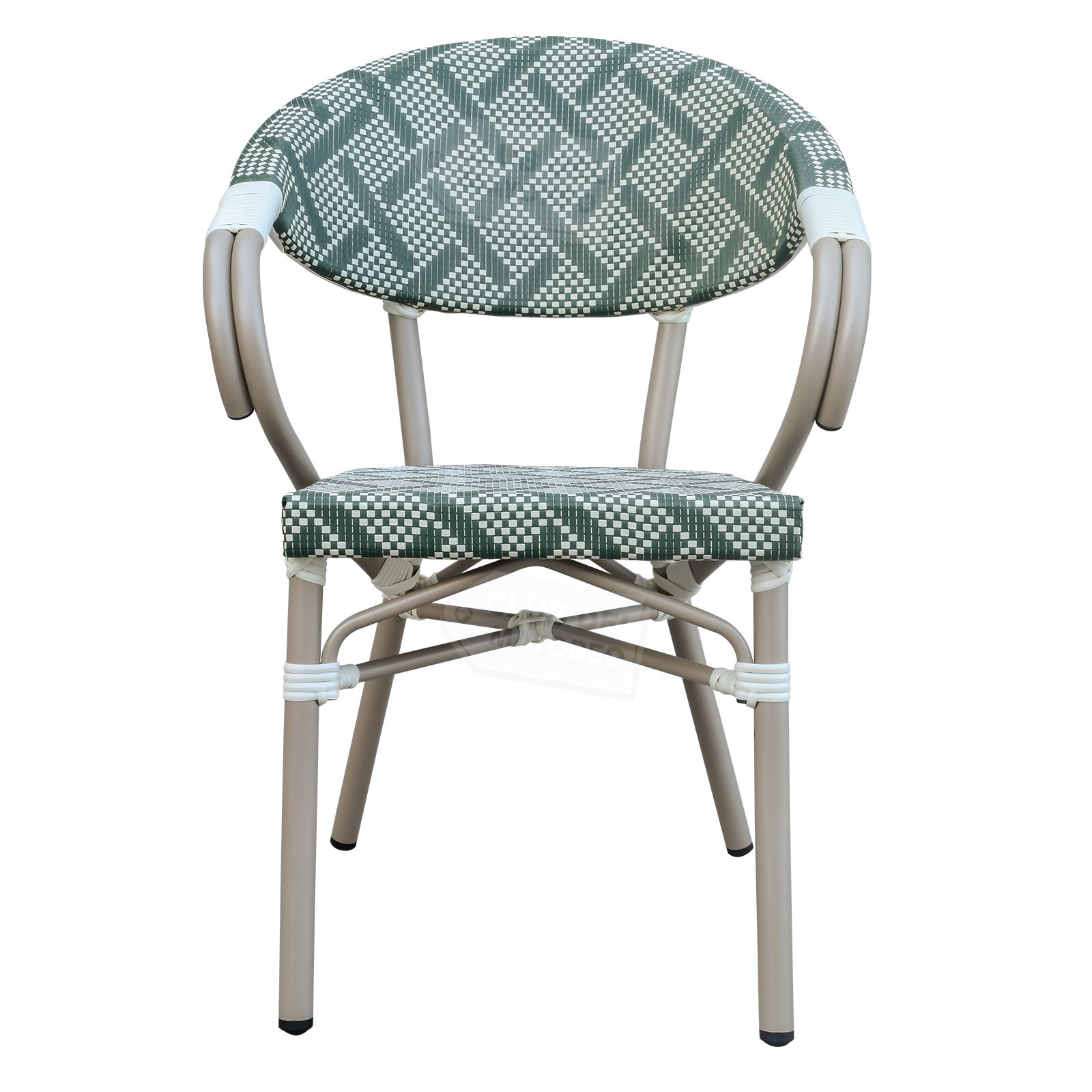 Inspirada en las cafeterías exteriores francesas pensadas en un ambiente al aire libre y en la calle, color sutil y elegante con diseño ovalado y curvo en respaldo para mejor comodidad y relajación. Fabricadas en estructura de aluminio las convierten en ligeras y nada pesadas. Con imitacion de amarre en cada estructura. Asiento y respaldo en malla entretejido estilo rattan sintético de gran durabilidad. La silla puede soportar un peso máximo de 130 kg.