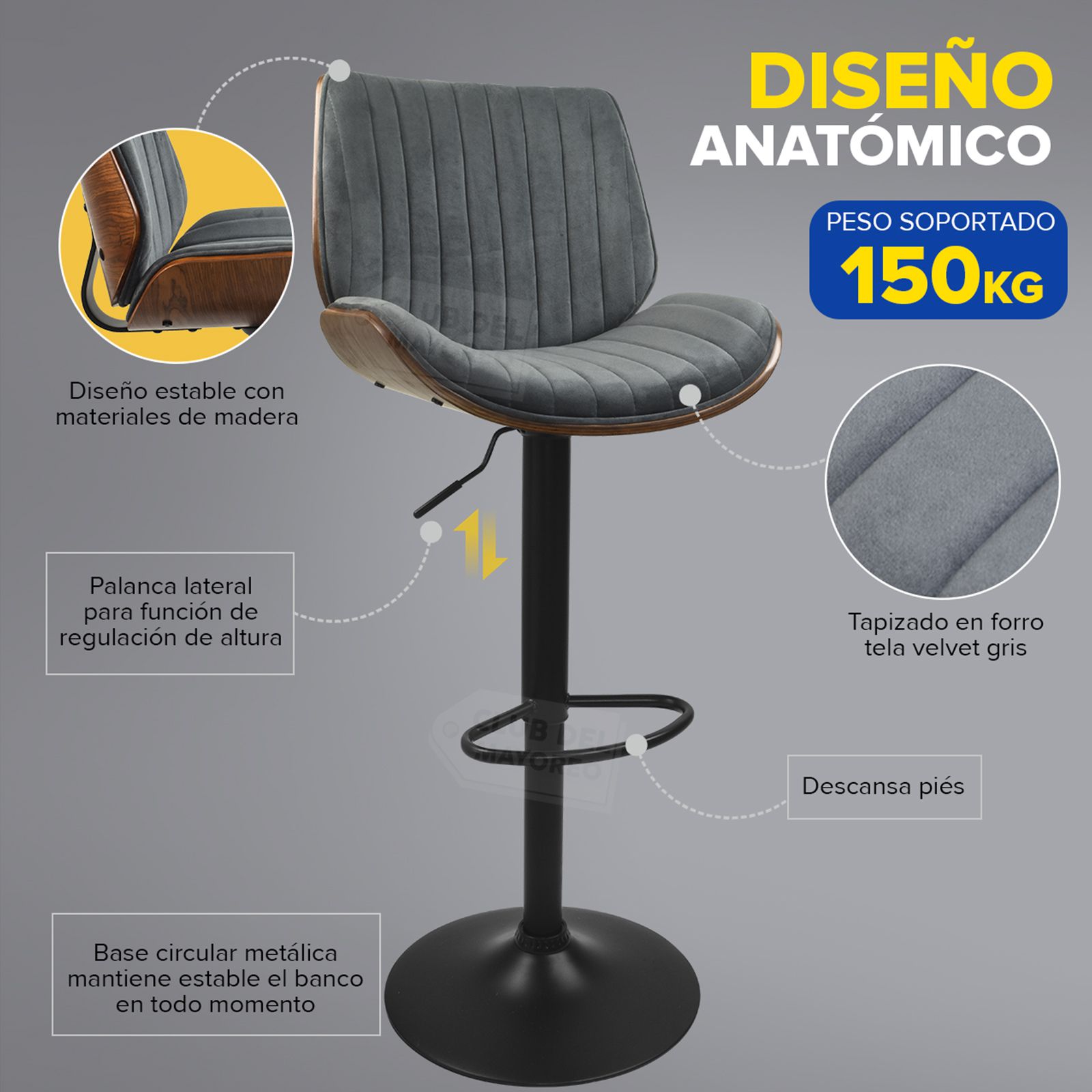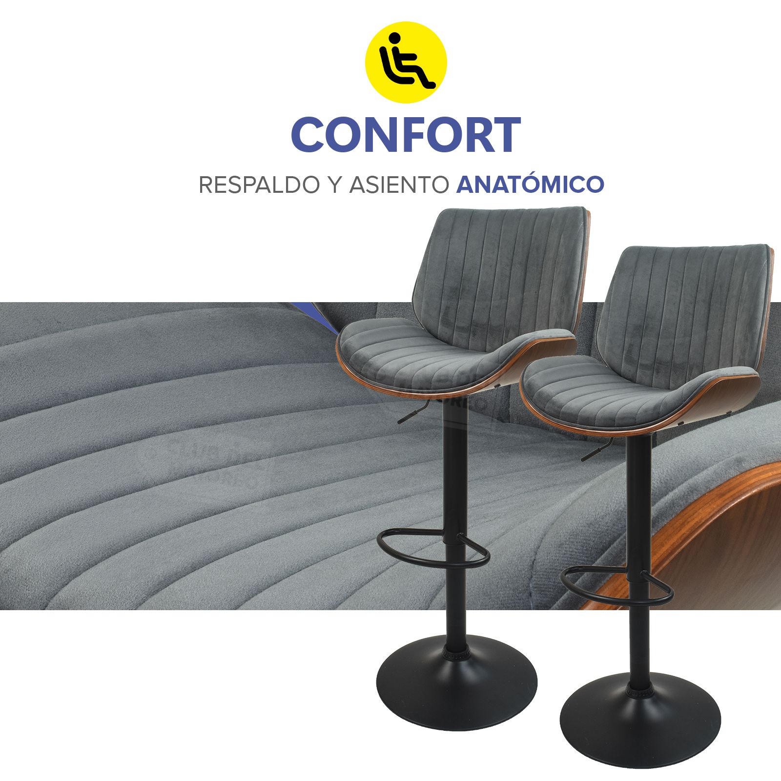 Con el Par de Bancos para Barra Alto Giratorio Velvet Gris 120kg, llevarás confort, resistencia y un toque de elegancia a tu hogar u oficina, creando un ambiente moderno y acogedor.