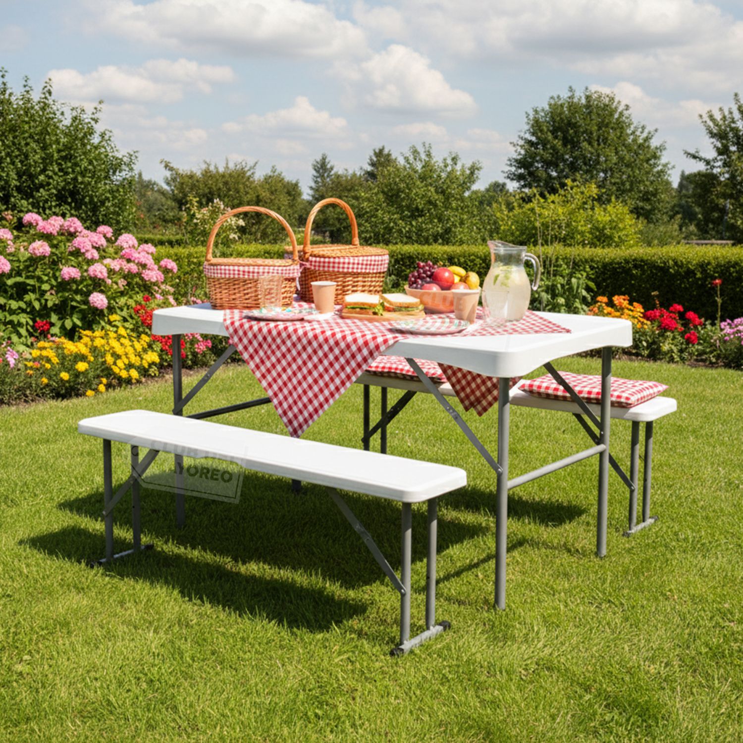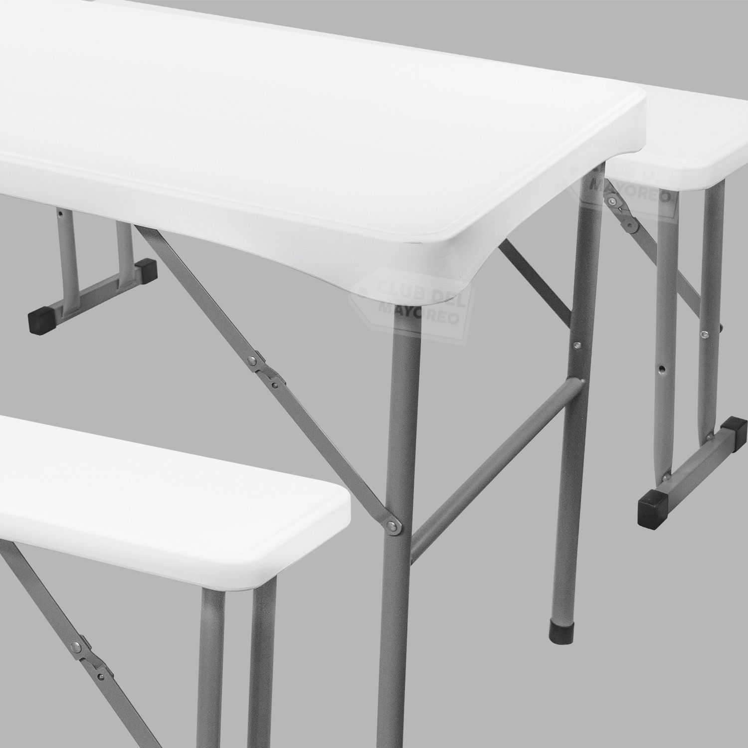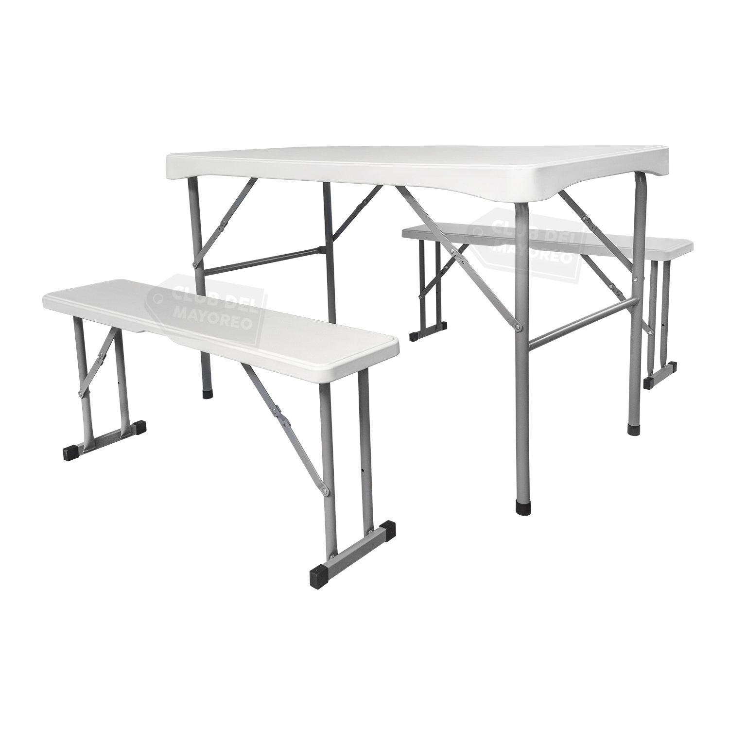 Mesa tipo pic nic ideal para reuniones al aire libre, jardines, patios, parques y eventos. Incluye 2 bancas plegables integradas, ofreciendo una solución práctica y cómoda para compartir en familia o con amigos.