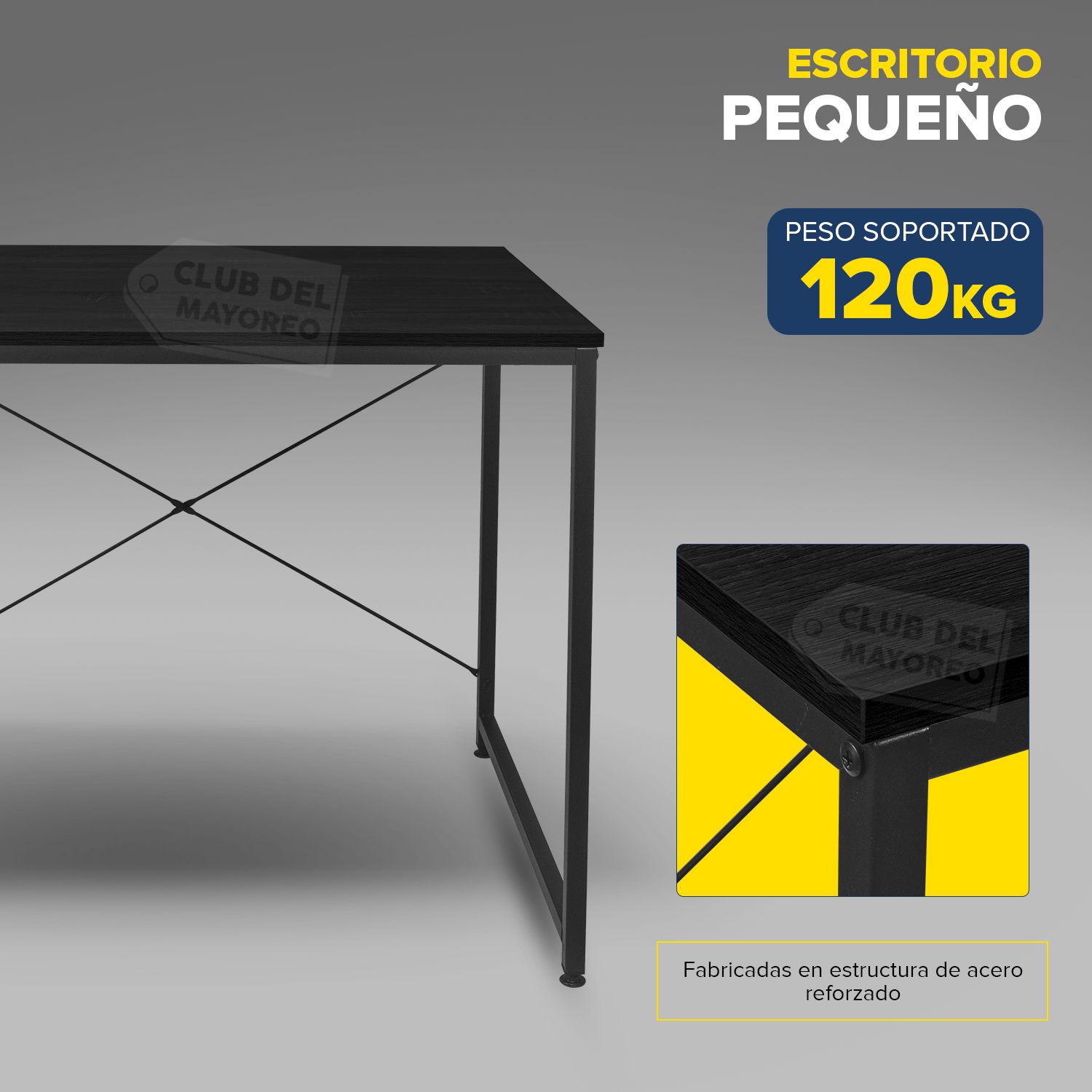 Práctico y pequeño escritorio ideal para escuela, casa, etc. Su mesa mide un área de 80 x 60 cm, grande para realizar cualquier tarea escolar y administrativa. Fabricado en material de acero color negro en su estructura, estable y duradero. La mesa esta fabricada en madera industrializada con melamina tipo madera color negro. Su altura es de 74 cm cabe perfectamente un silla de oficina.