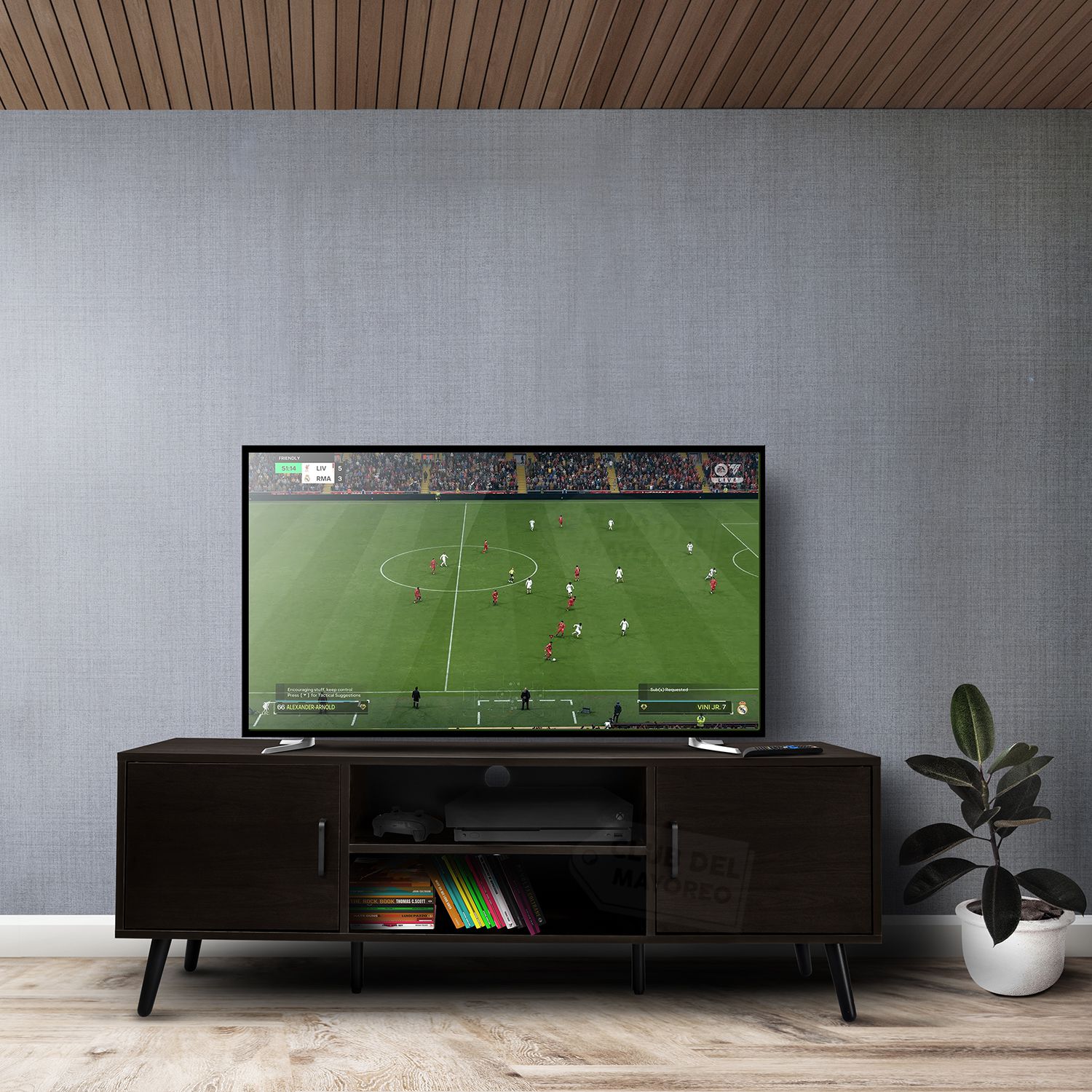 Organiza tu entretenimiento y dale un plus y aspecto a tu hogar. Moderno mueble para television con dos entrepaños centrales y dos puertas laterales frontales para ahorrar espacio o mantener una sala de entretenimiento ordenanda. Cuenta con dos orificios posteriores pasa cables para conectar todos tus equipos sin cables a la vista. Fabricado en madera industrializada con melamina color nuez oscuro. Es resistente puede soportar una televisión de hasta 55 pulgadas.