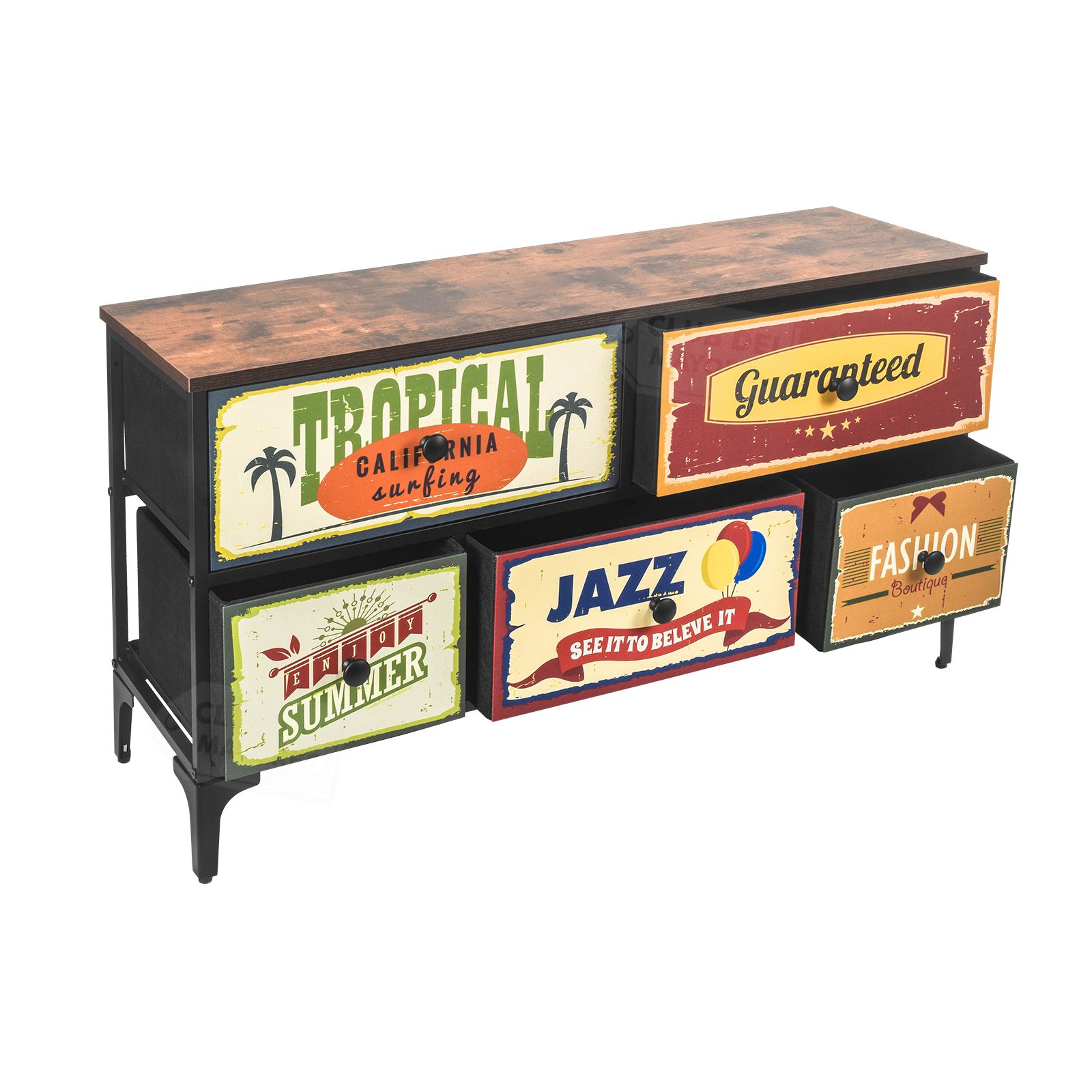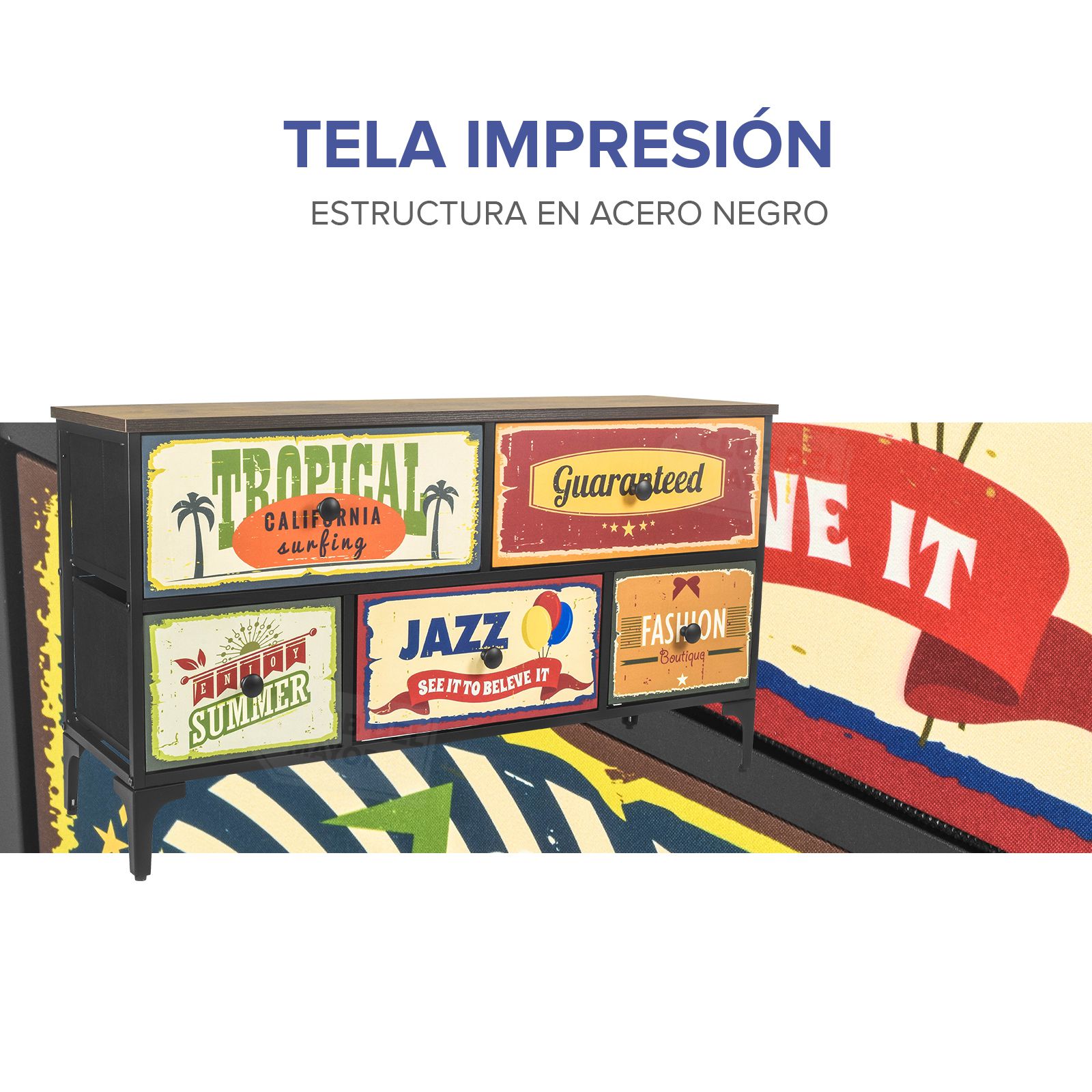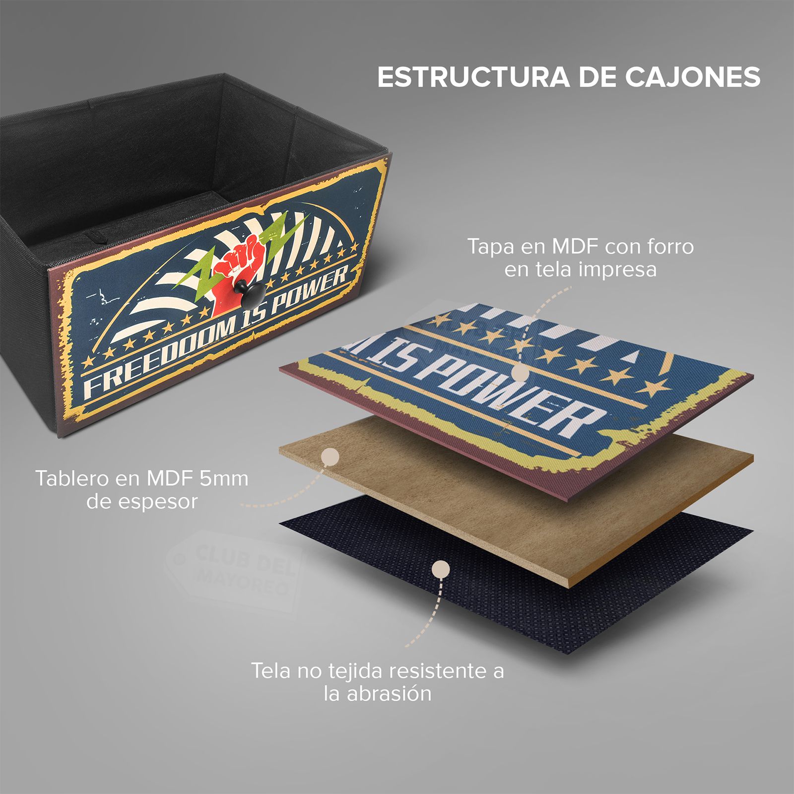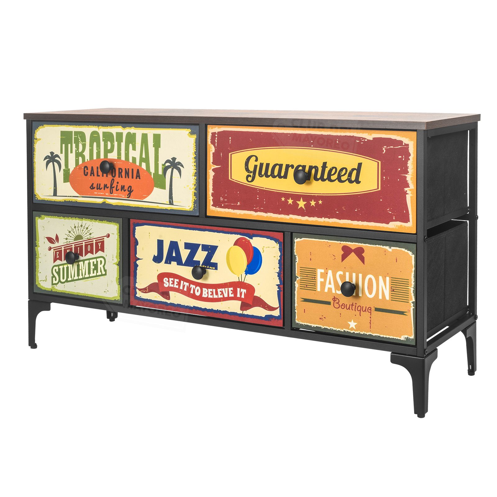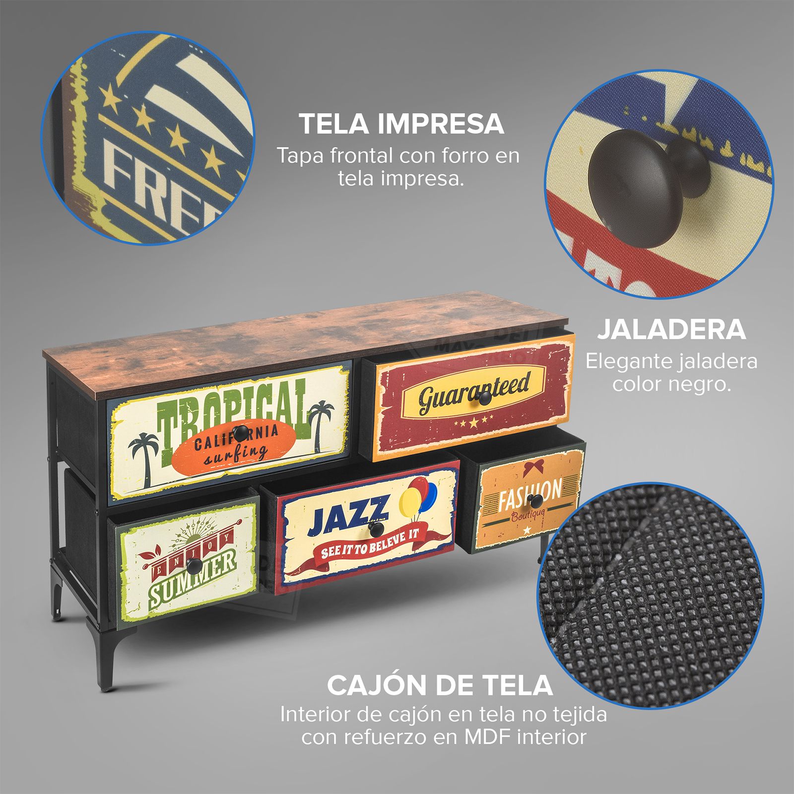 Moderno mueble para televisión de la coleccion New York con cinco cajones en tela impresa diseño diferente para cada uno, interior con tapas en MDF y tela no tejida color negro. Fabricado con estructura metálica resistente y repisa superior en madera industrializada con melamina tipo madera roble. Ideal para combinar con cualquier ambiente de tu recámara. Puede soportar hasta 75 kg en la repisa y entre 8 y 15 Kg en cada cajon. Fácil de armar en solo 20 minutos.