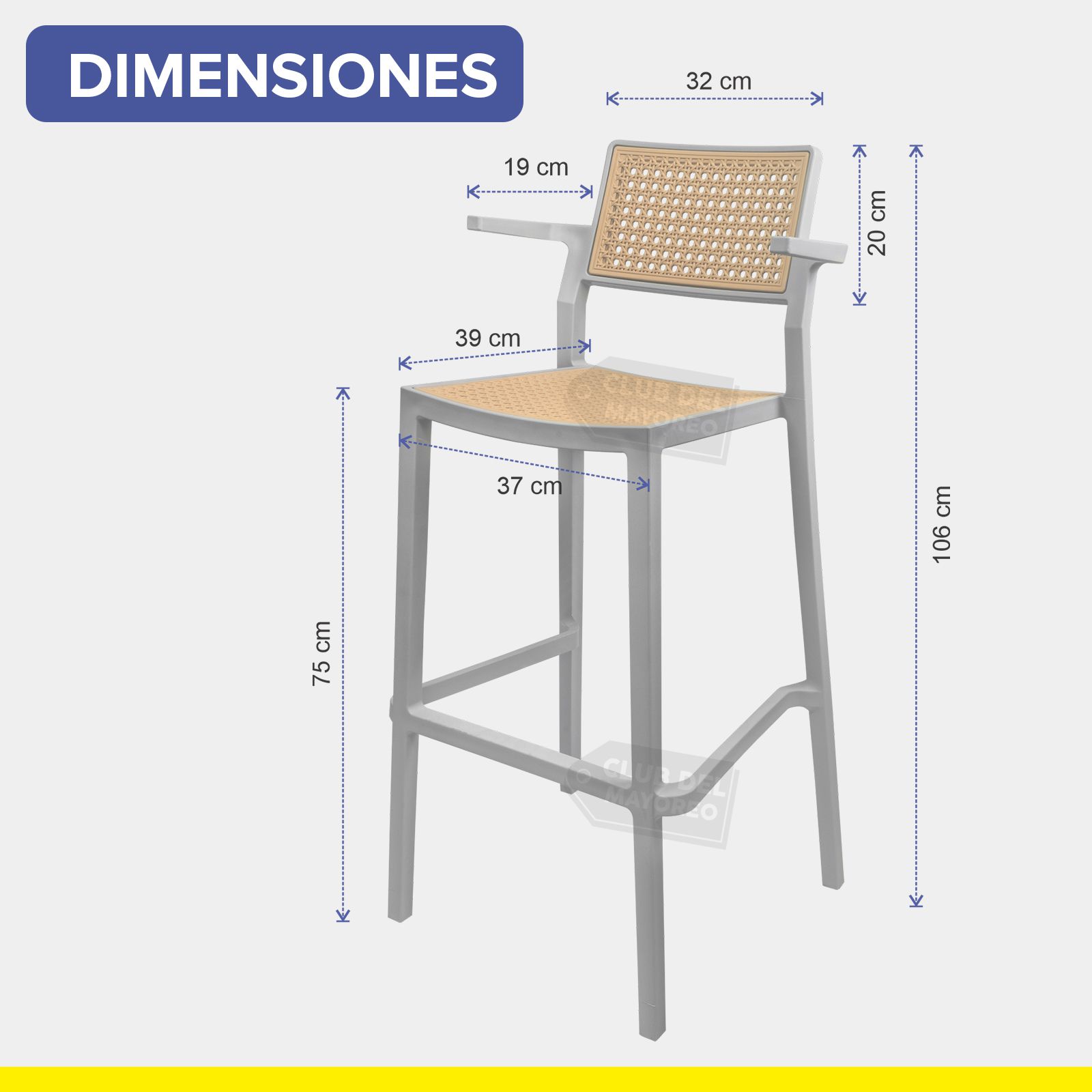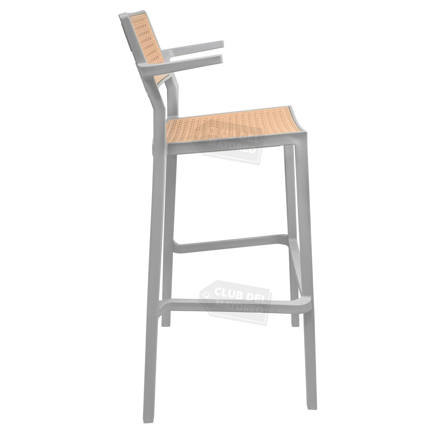 Banco alto con descansa brazos pequeños para barra, bar, restaurante, comidas, etc. Estilo moderno minimalista color gris y asiento con respaldo moldeado semi curvo estilizado ratan para mayor comodidad. Estructura en polimero resistente a golpes, caidas, etc, puede soportar un peso de hasta 130 kg.