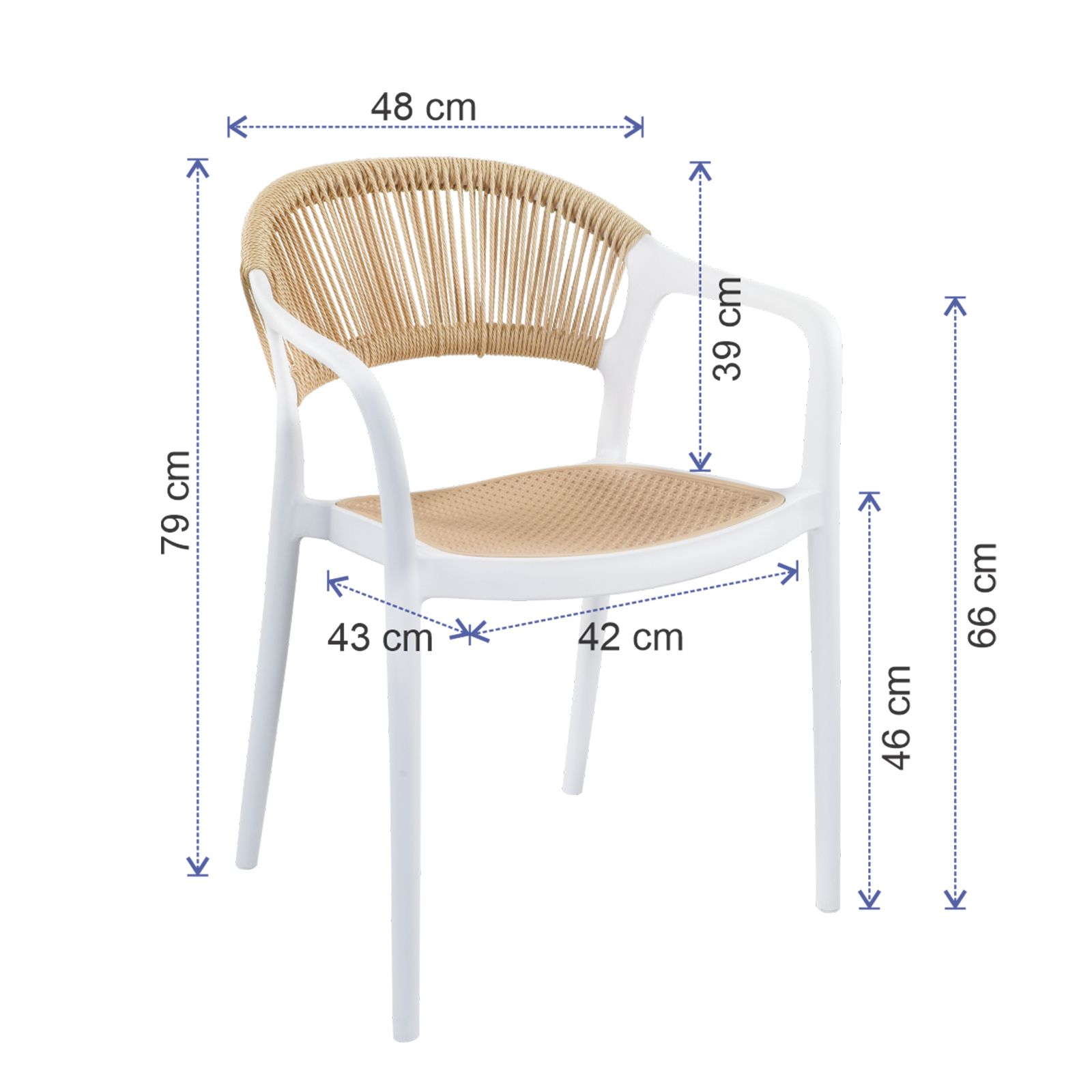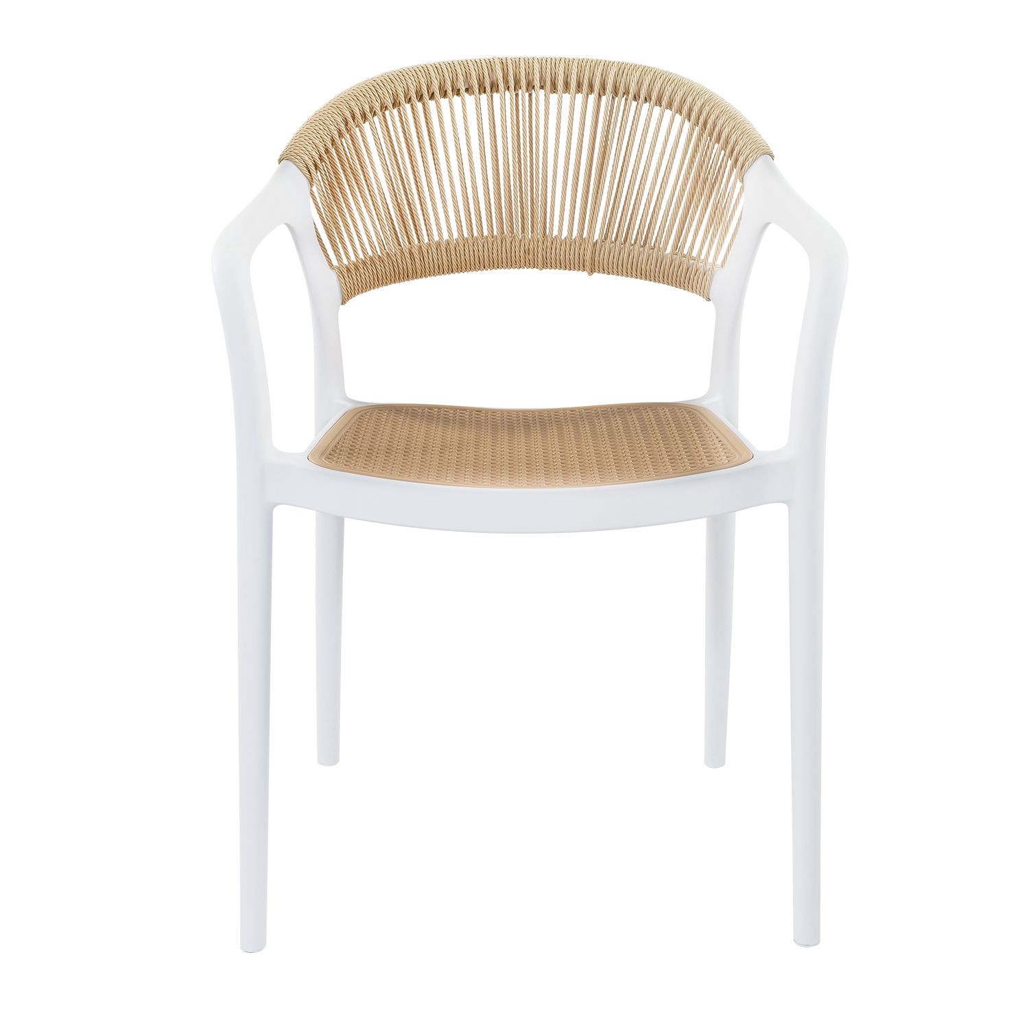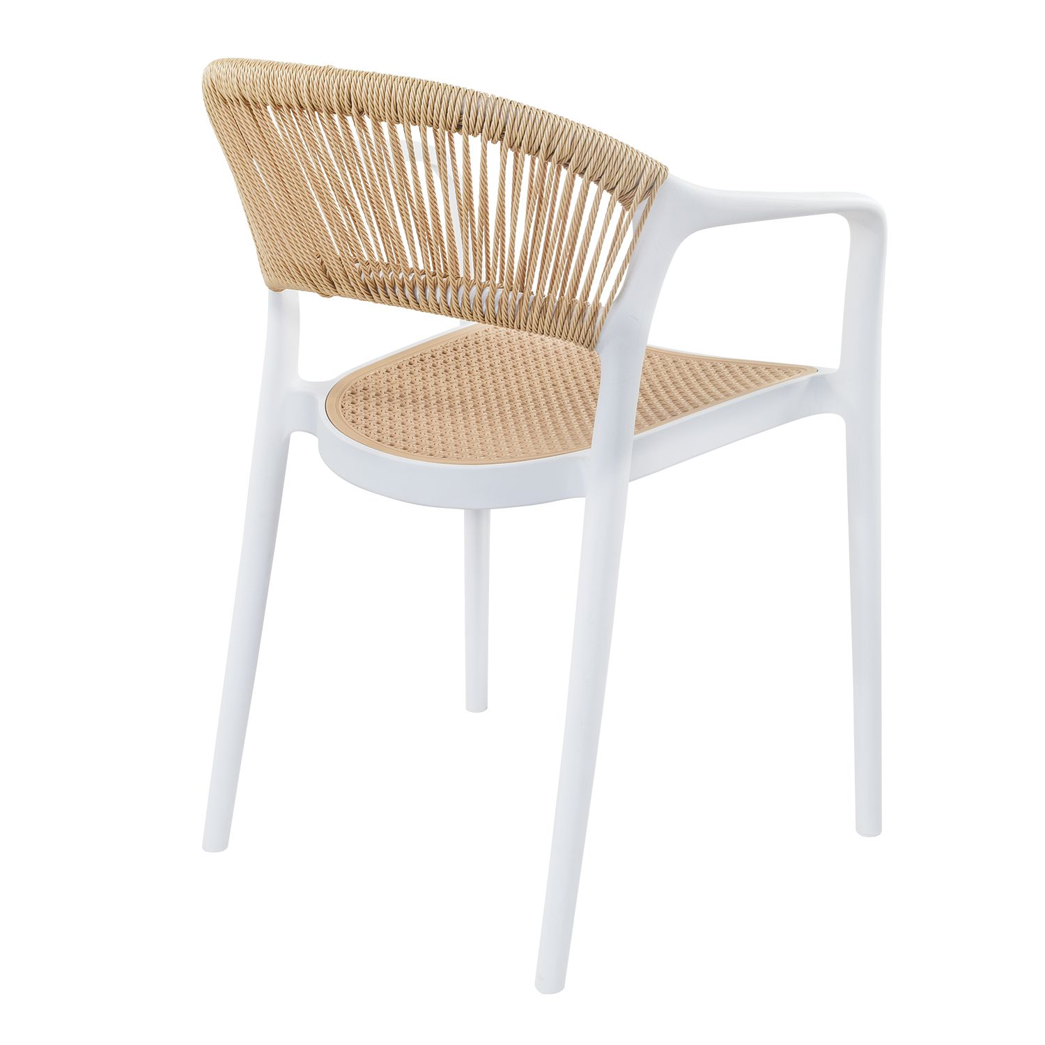 Práctica, funcional y ligera silla ideal para exteriores, cafeterías, restaurantes, fondas, jardín, patio, etc. Fabricadas en resistente plástico tipo polipropileno para convertirlas en sillas ligeras para fácil transporte. Estructura color blanco mate y rejilla en asiento y respaldo estilo hilos de ratán entrtejido roble natural para mayor confort. Se pueden apilar para ahorrar espacio en el almacenaje. La silla puede soportar un peso de 120 Kgs.
