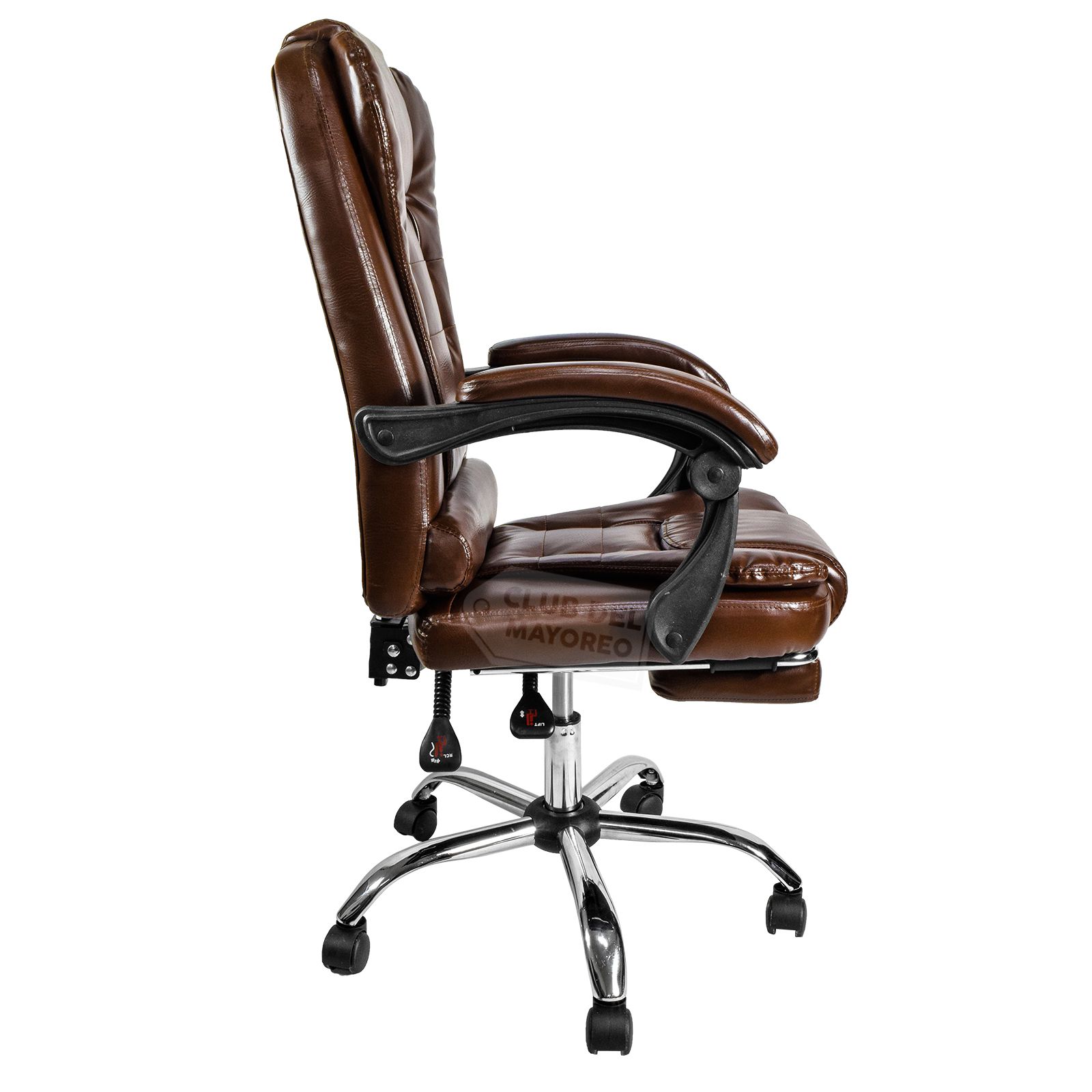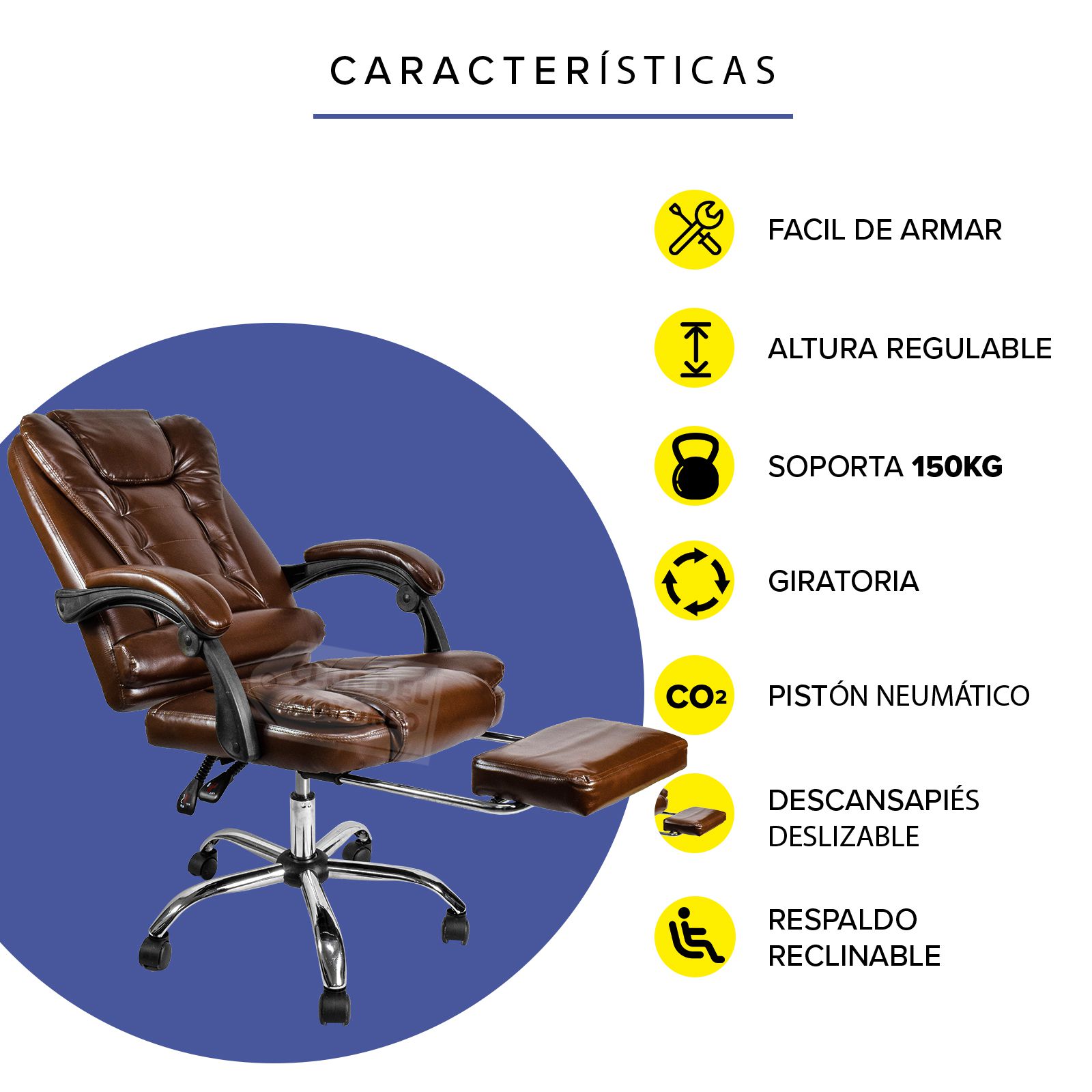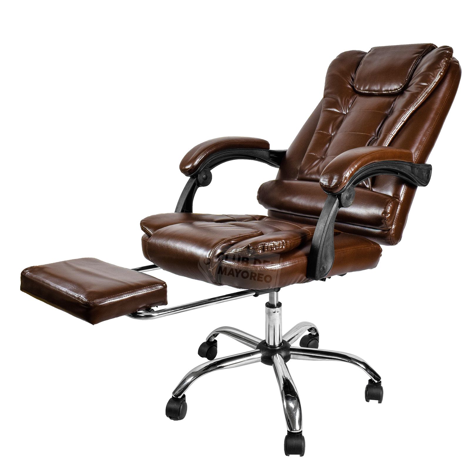 Hermosa silla para oficina modelo ejecutivo con descansa pies integrado que se puede guardar debajo del asiento, se puede reclinar en un ángulo de hasta 145 grados, respaldo y asiento en forro de vinipiel color cafe, respaldo acolchado con soporte en zona lumbar para mayor confort, ruedas silenciosas giratorias independientes cada una, base giratoria en metal tipo cromado, palanca para regular la altura de la silla, brazos en plástico rígido con colchonetas superiores. La silla puede soportar un peso máximo de 150 Kg.