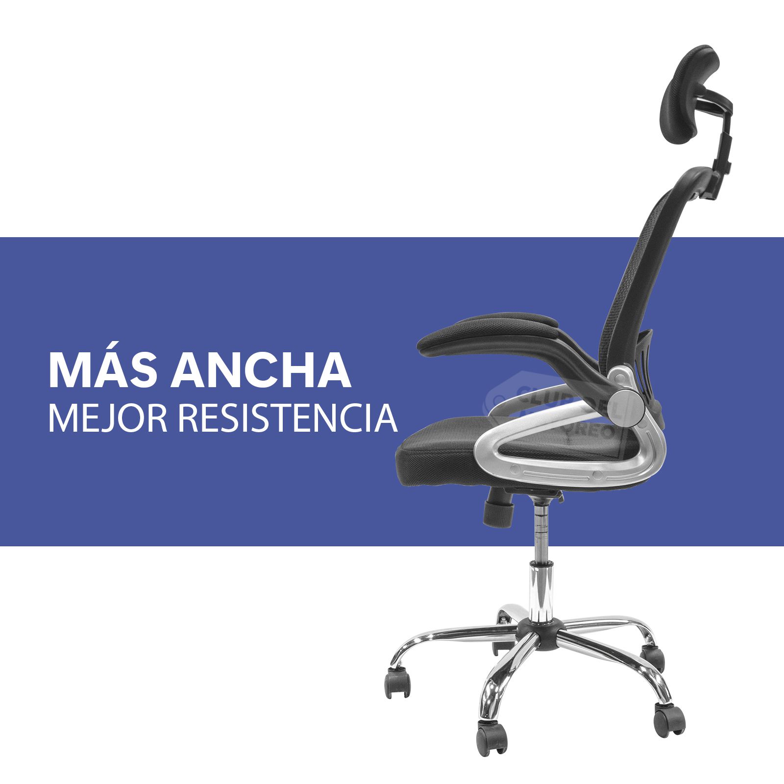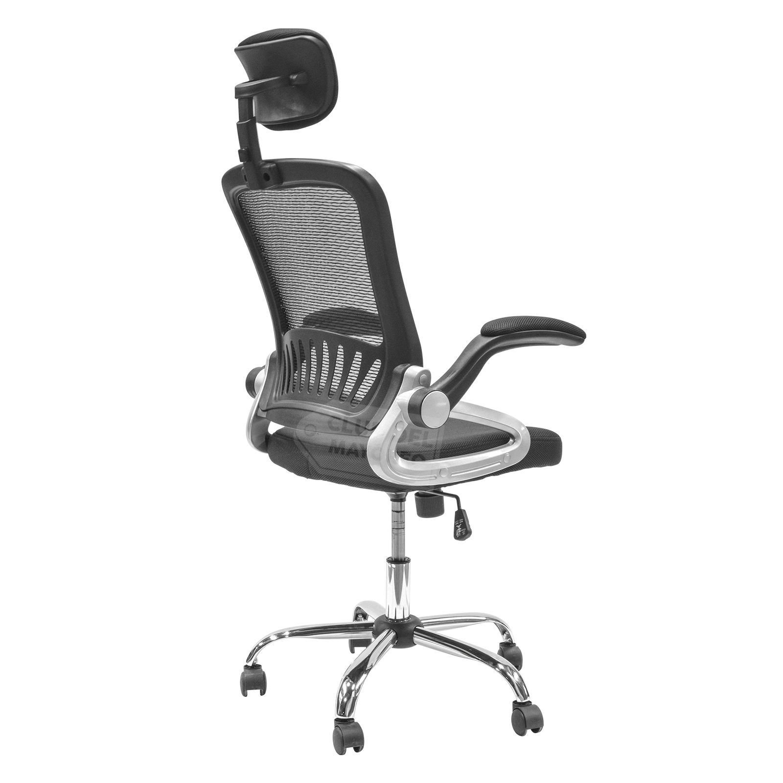 Silla de oficina estilo gerencial con cabecera de buena calidad en acabados y materiales. Cuenta con cabecera ajustable en altura y posición de cabeza. Sus brazos se puede abatir. Función de ajustar la altura deseada para trabajar. Forrada en malla para el respaldo y en asiento, evita la transpiración, su base giratoria es giratoria y acabado en cromado con ruedas suaves con giro independiente cada una. La silla puede soportar un peso máximo de hasta 170 Kg.