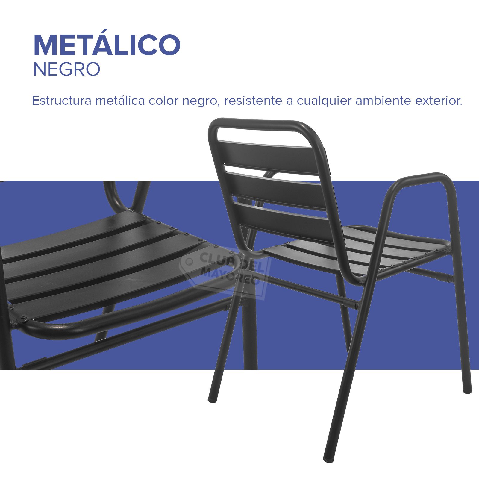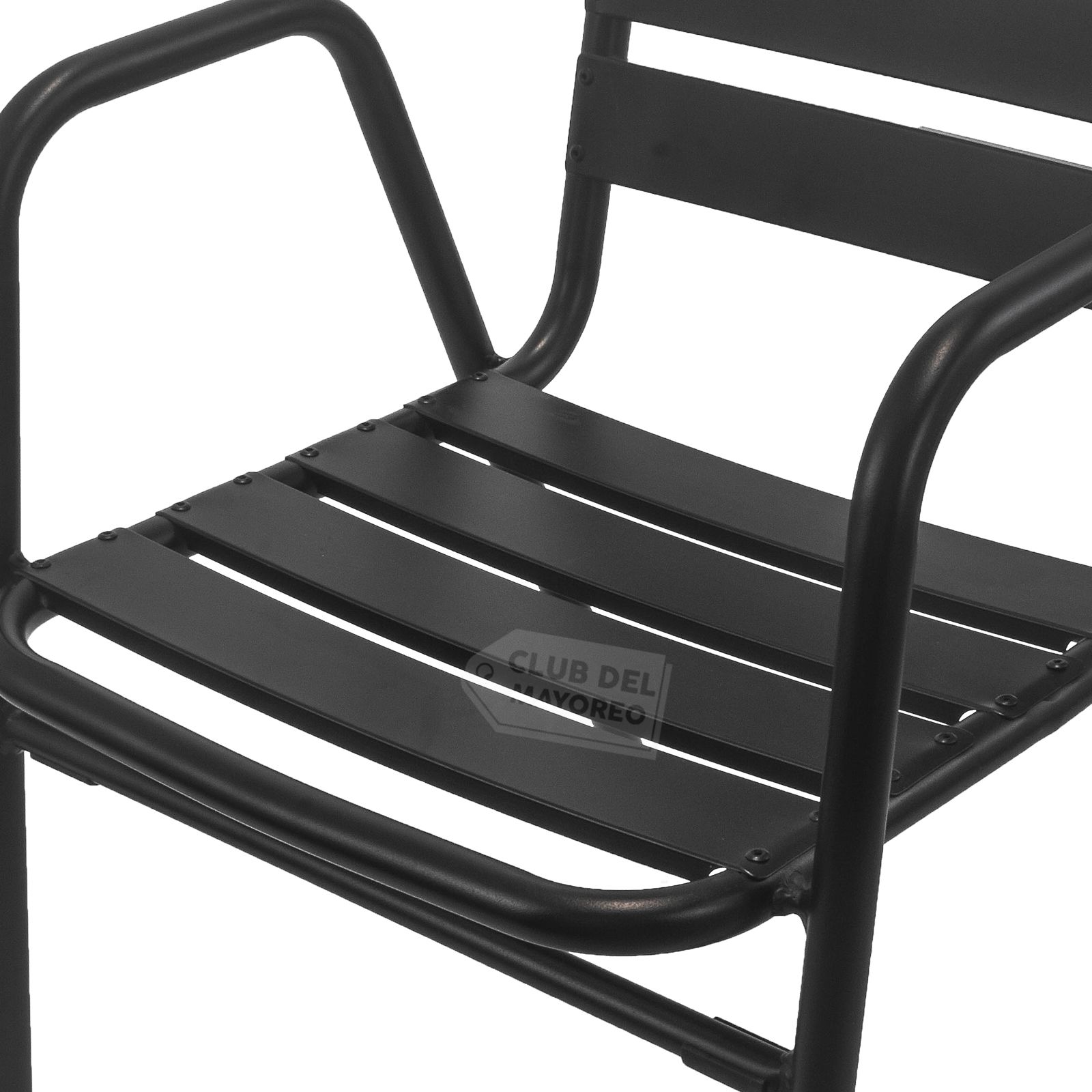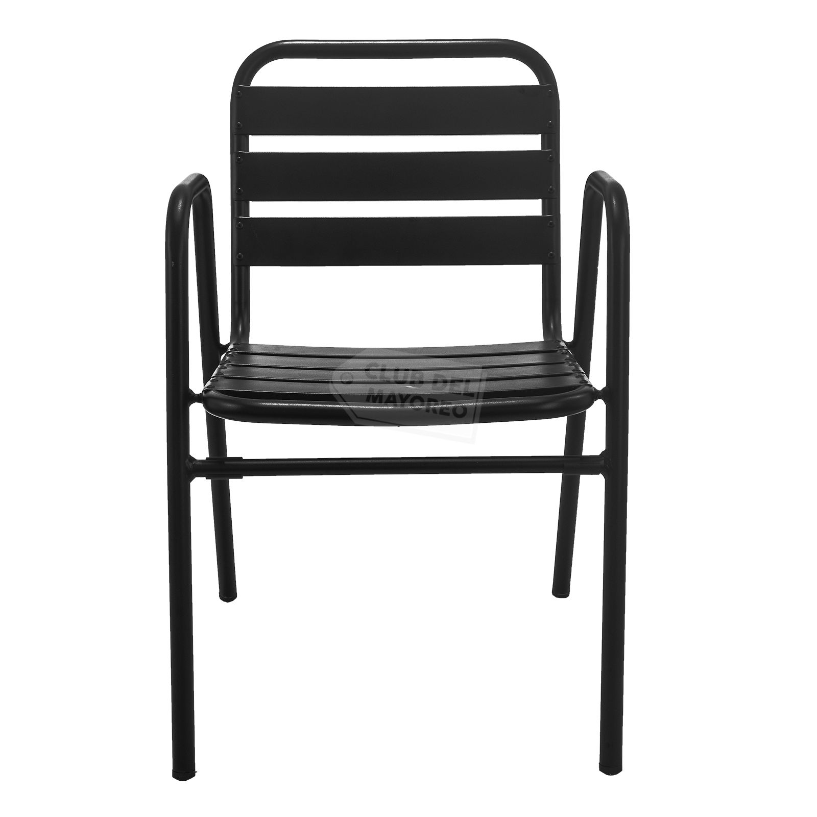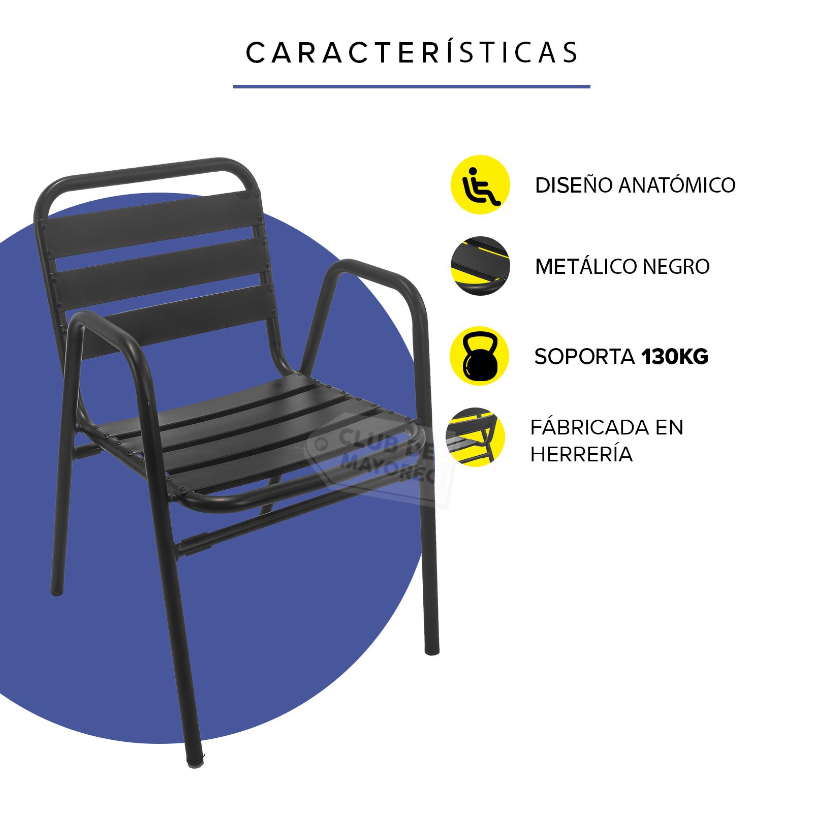 Práctica, funcional y ligera silla ideal para exteriores, cafeterías, restaurantes, fondas, jardín, patio, etc. Fabricadas en aluminio para convertirlas en sillas ligeras para fácil transporte. Estructura pintada en color negro mate y tubo redondo con laminas horizontales para mayor confort. Se pueden apilar para ahorrar espacio en el almacenaje. La silla puede soportar un peso de 130 Kgs.