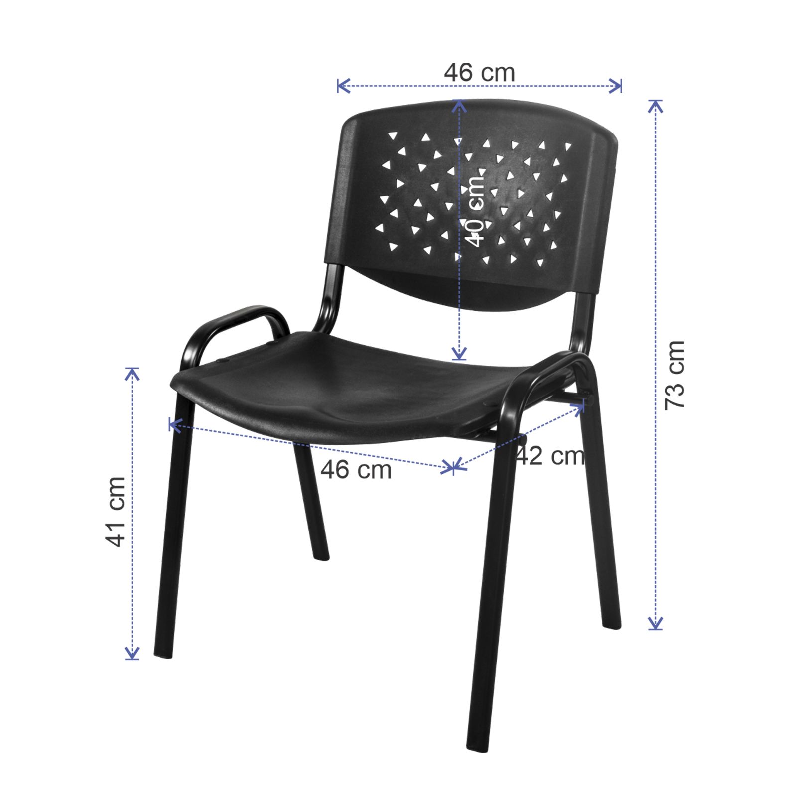 Cuenta con asiento y respaldo de plástico perforado, lo que permite una mejor ventilación y fácil limpieza, además de una estructura metálica que brinda estabilidad y durabilidad.