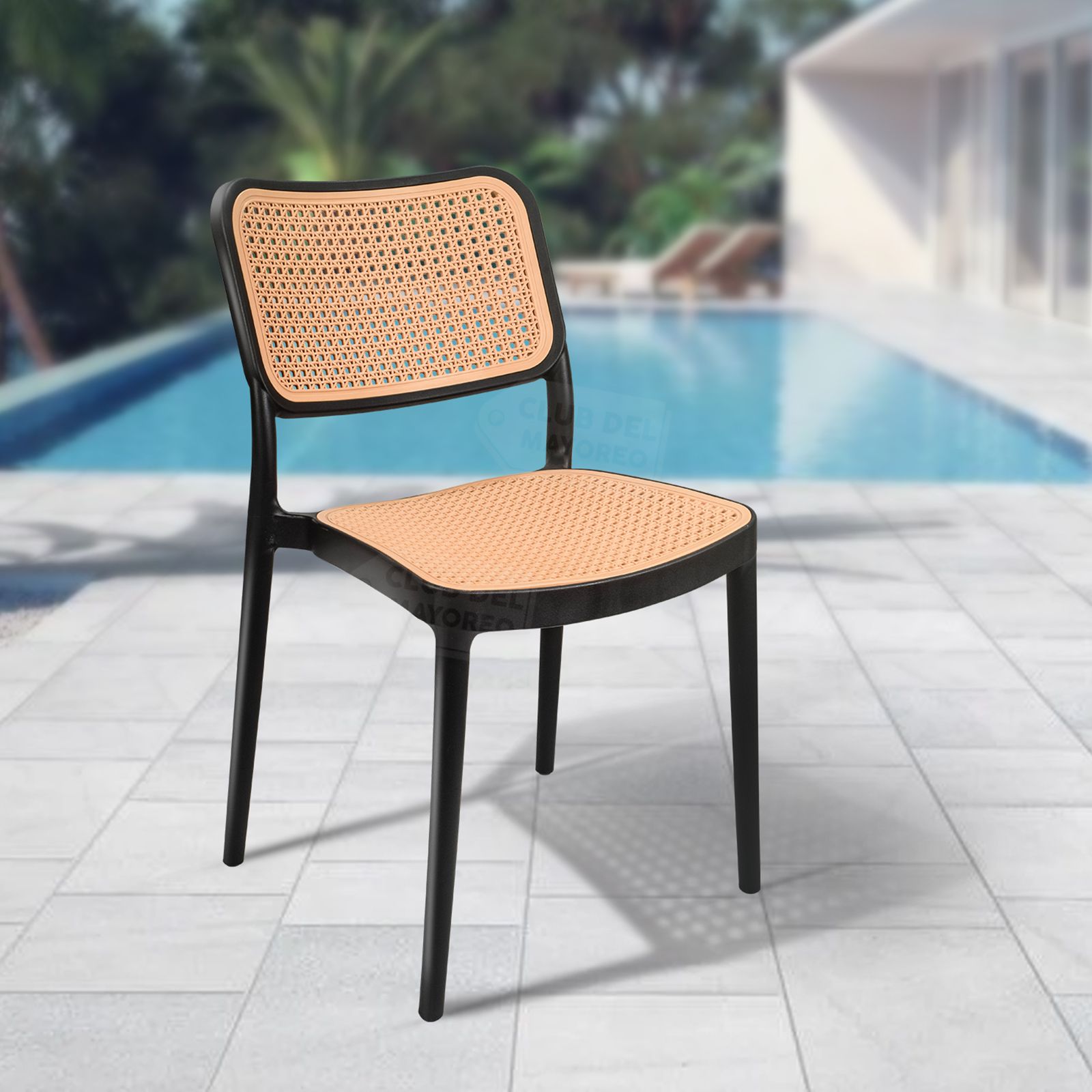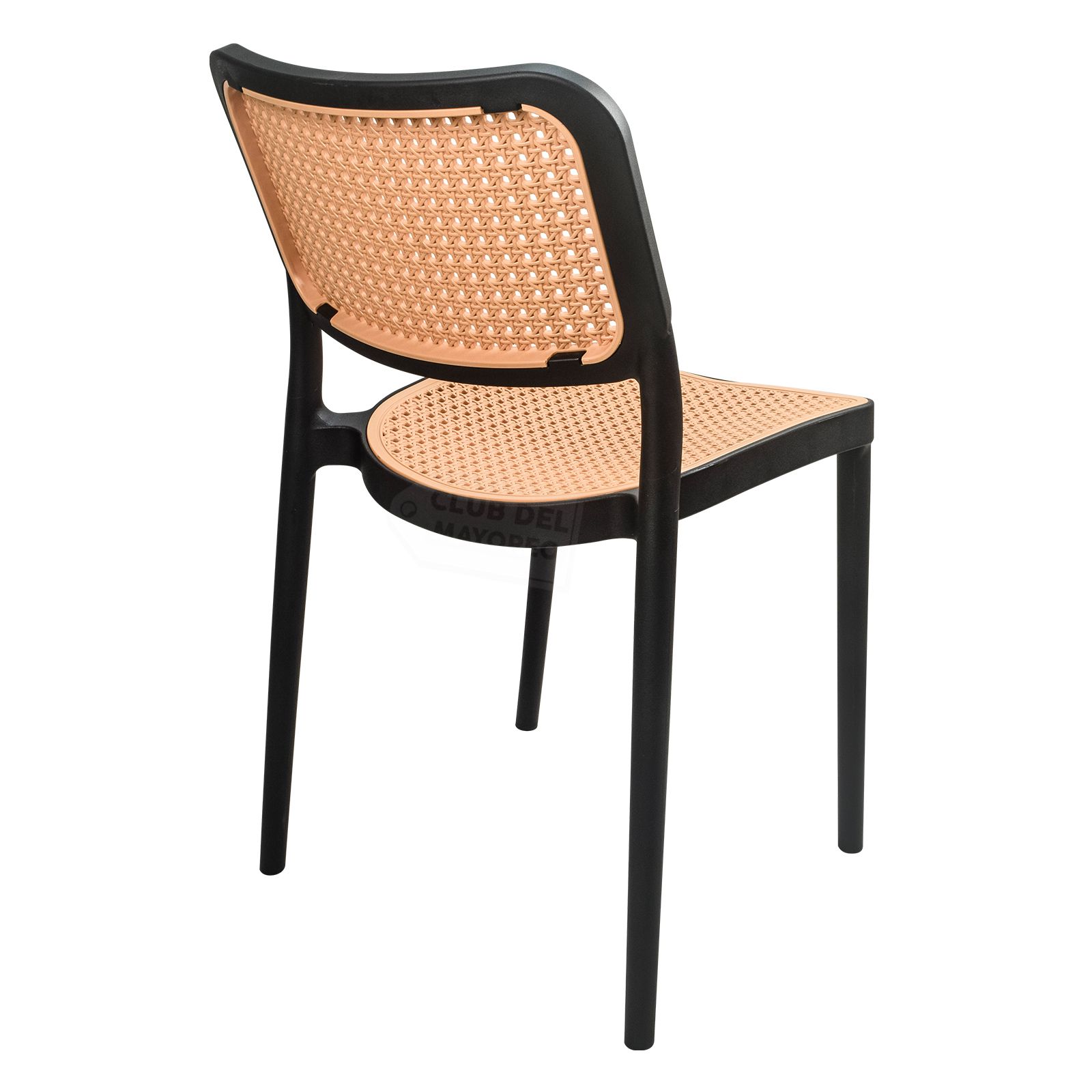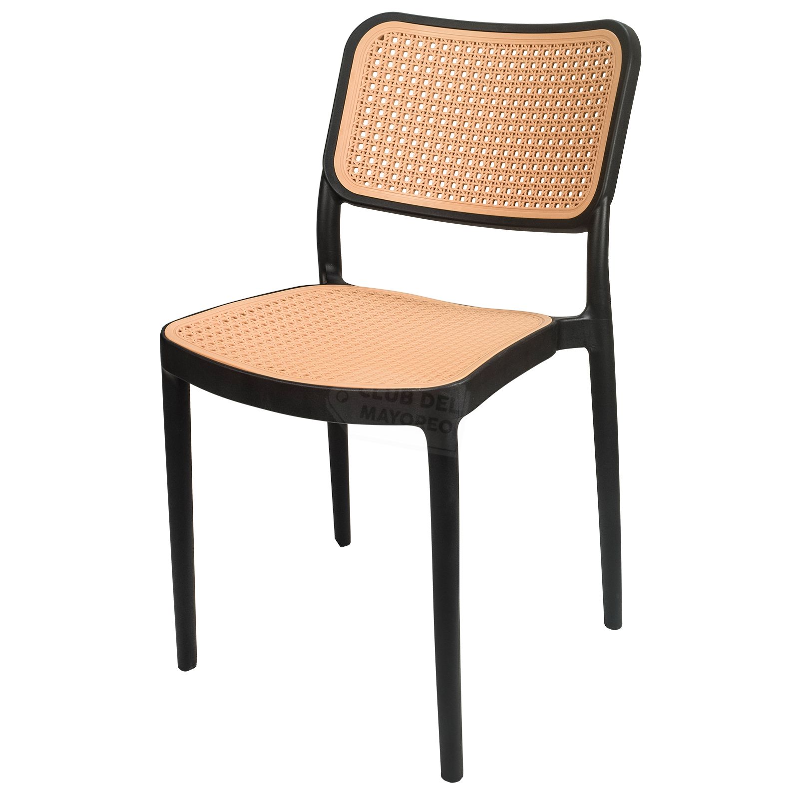 Práctica, funcional y ligera silla ideal para exteriores, cafeterías, restaurantes, fondas, jardín, patio, etc. Fabricadas en resistente plástico tipo polipropileno para convertirlas en sillas ligeras para fácil transporte. Estructura color negro mate y rejilla en asiento y respaldo estilo ratán tejido de polietileno color roble natural para mayor confort. Se pueden apilar para ahorrar espacio en el almacenaje. La silla puede soportar un peso de 125 Kgs.