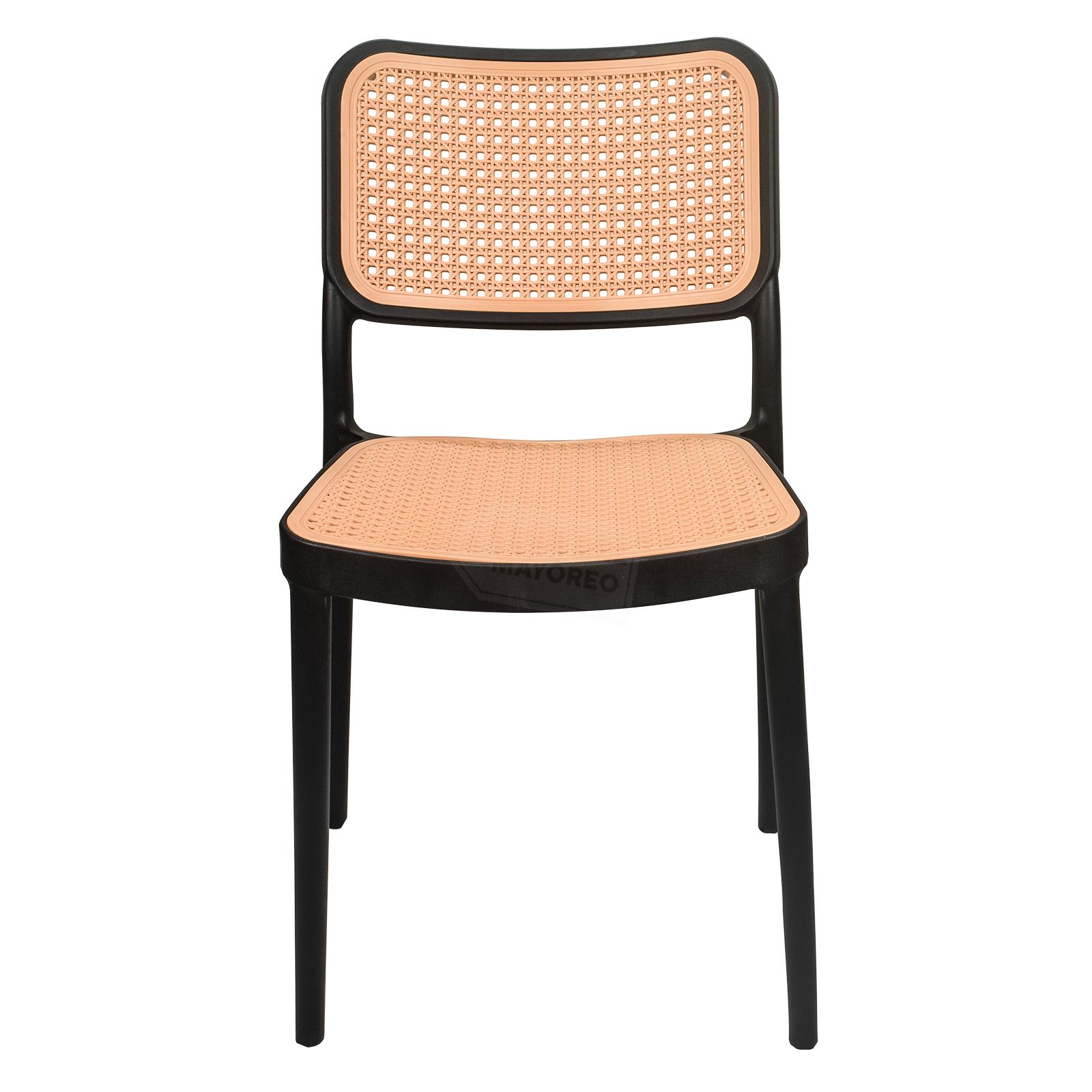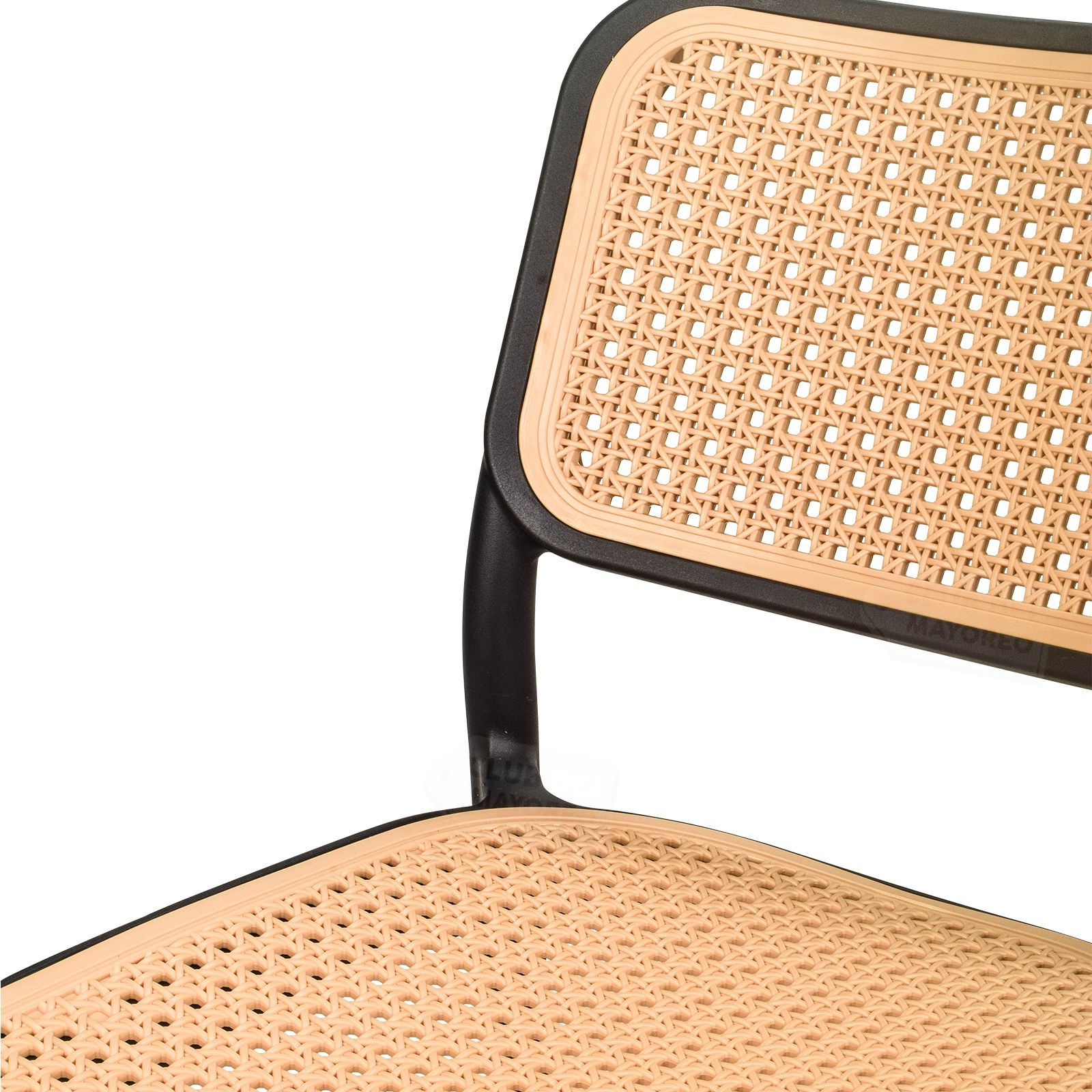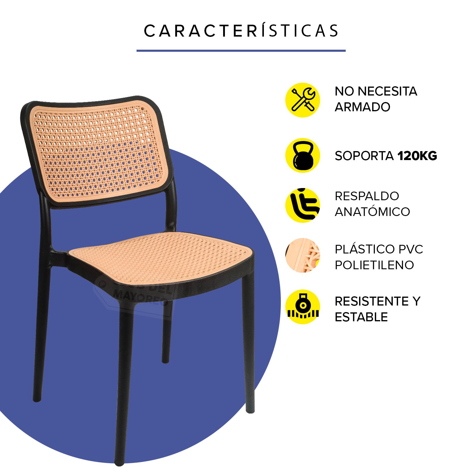 Práctica, funcional y ligera silla ideal para exteriores, cafeterías, restaurantes, fondas, jardín, patio, etc. Fabricadas en resistente plástico tipo polipropileno para convertirlas en sillas ligeras para fácil transporte. Estructura color negro mate y rejilla en asiento y respaldo estilo ratán tejido de polietileno color roble natural para mayor confort. Se pueden apilar para ahorrar espacio en el almacenaje. La silla puede soportar un peso de 125 Kgs.