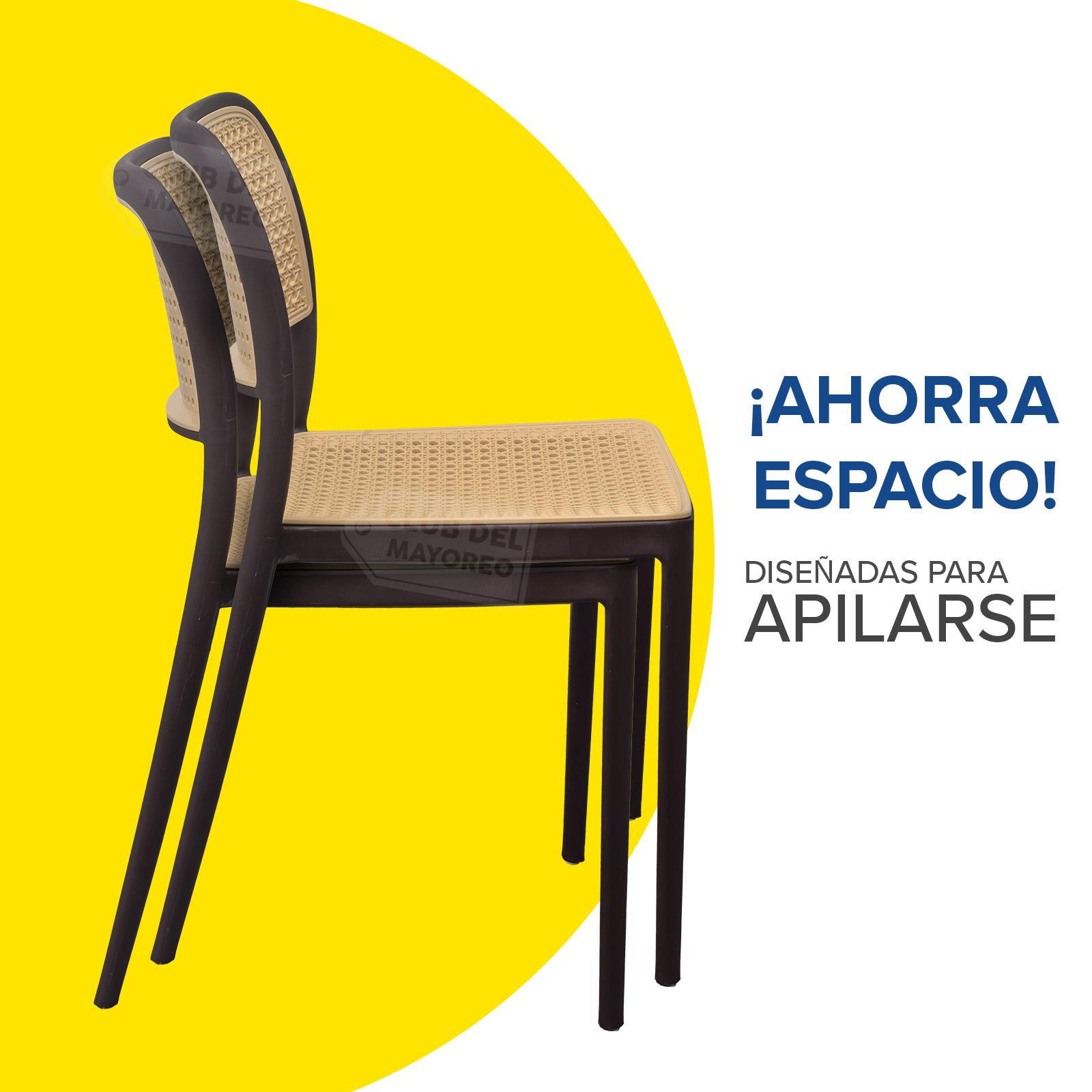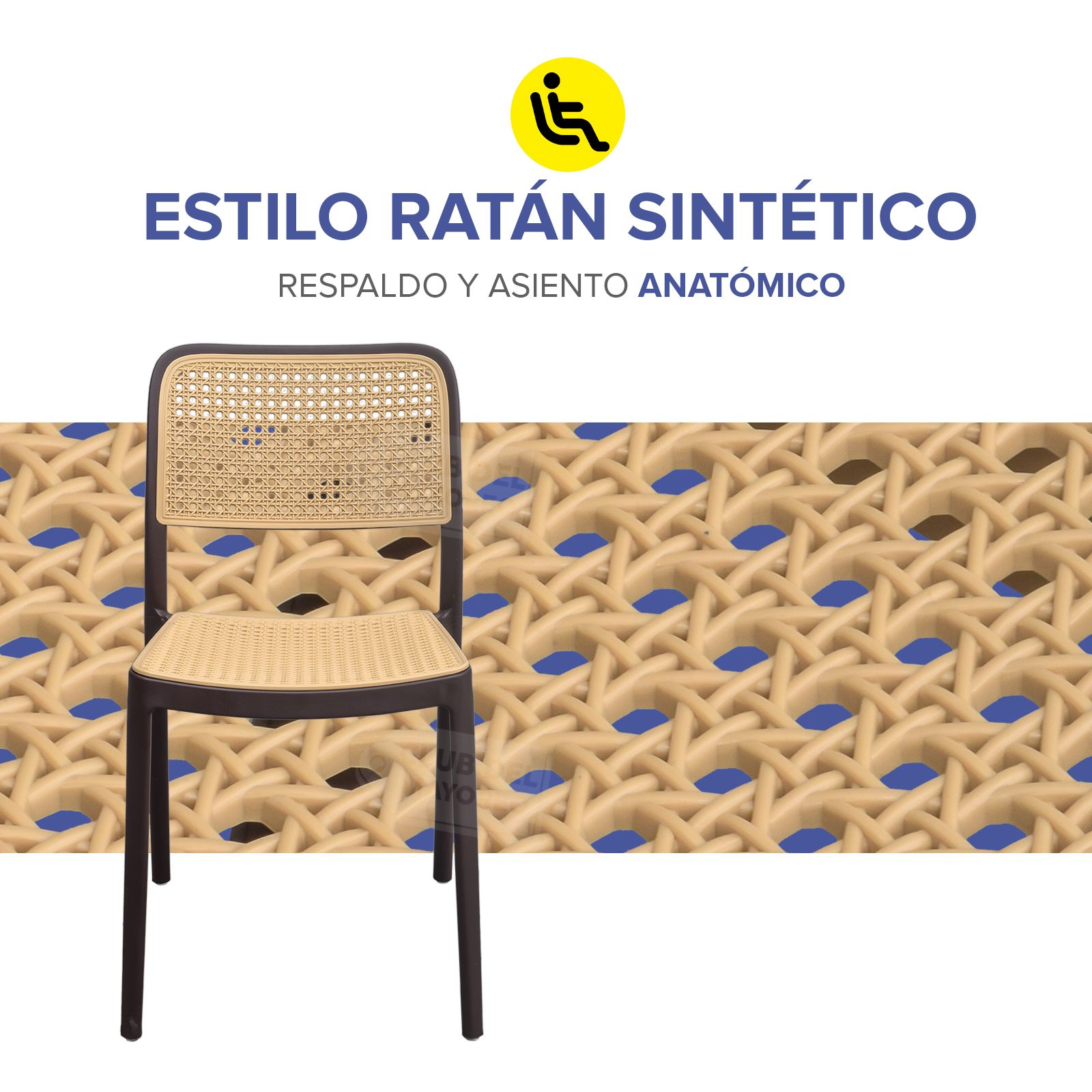 Práctica, funcional y ligera silla ideal para exteriores, cafeterías, restaurantes, fondas, jardín, patio, etc. Fabricadas en resistente plástico tipo polipropileno para convertirlas en sillas ligeras para fácil transporte. Estructura color cafe mate y rejilla en asiento y respaldo estilo ratán tejido de polietileno color roble natural para mayor confort. Se pueden apilar para ahorrar espacio en el almacenaje. La silla puede soportar un peso de 125 Kgs.