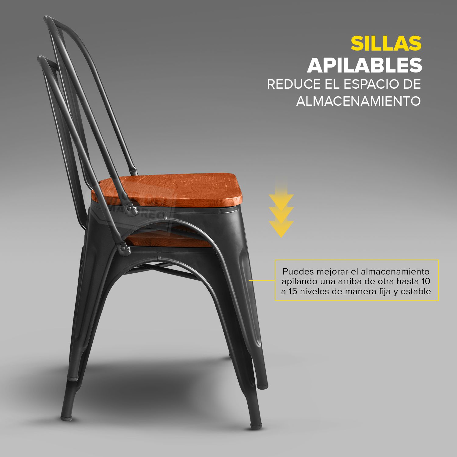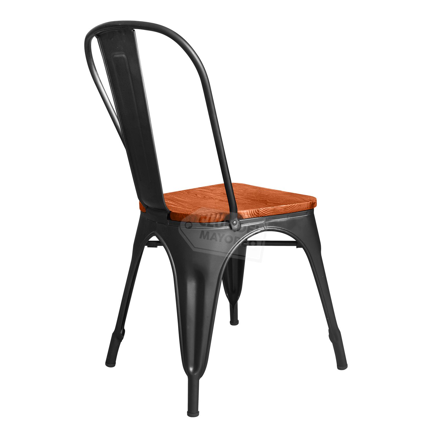 Silla metalica diseño tolix ideal para exteriores, cafeterías, restaurantes, fondas, jardín, patio, etc. Fabricadas en resistente material de metal ligeras para fácil transporte. Estructura color negro mate con asiento comodo en madera y respaldo anatómico curvo para mayor confort. Se pueden apilar para ahorrar espacio en el almacenaje. La silla puede soportar un peso de 150 Kgs.