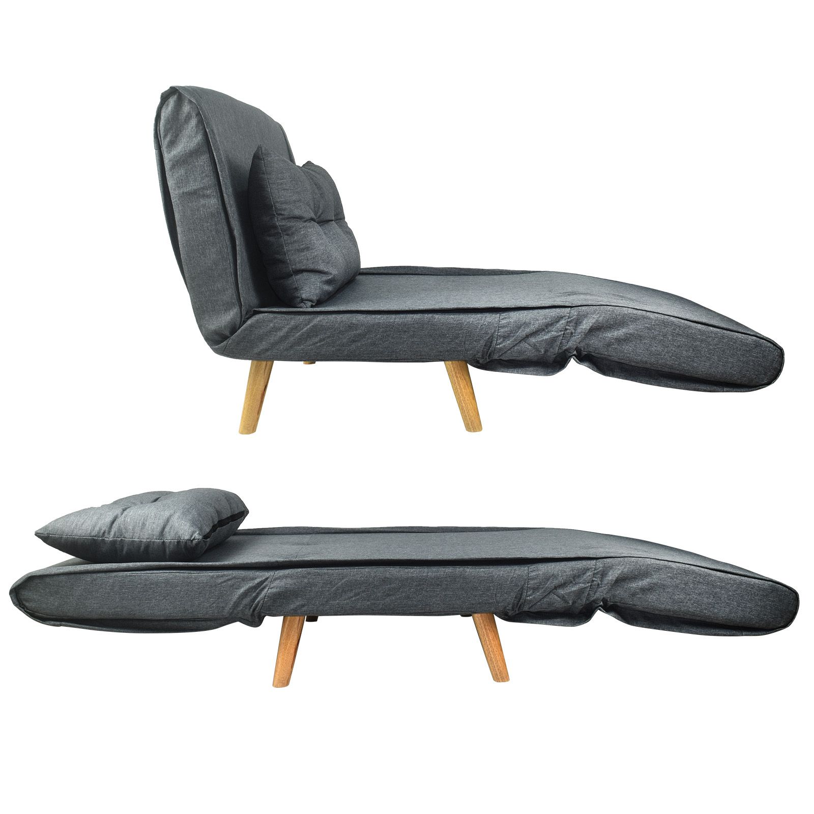 Sillon individual que se puede convertir en cama individual con solo desplegarse en 3 pasos. Forro en tela suave de lino color gris y relleno en esponja y foam moldeable. Cojin incluido para servir como almohada. Fabricado en estructura de madera y patas solidas en madera natural. Puede soportar un peso de 130 kg de manera uniforme.