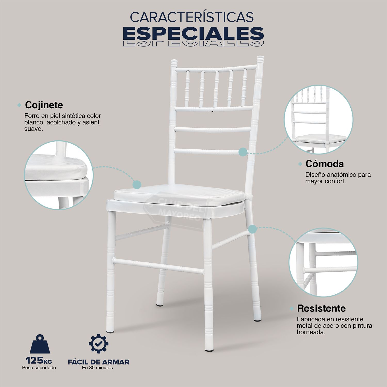 Cuenta con una estructura metálica resistente que brinda estabilidad y durabilidad, siendo adecuada para uso continuo. Es práctica para transportar, acomodar y almacenar, lo que la convierte en una excelente opción para salones de eventos y renta de mobiliario.