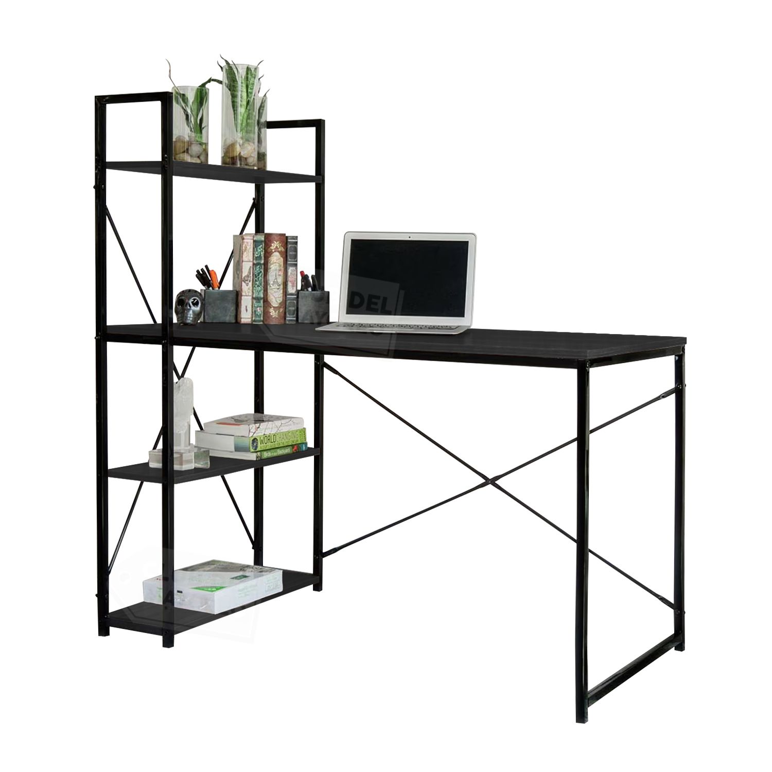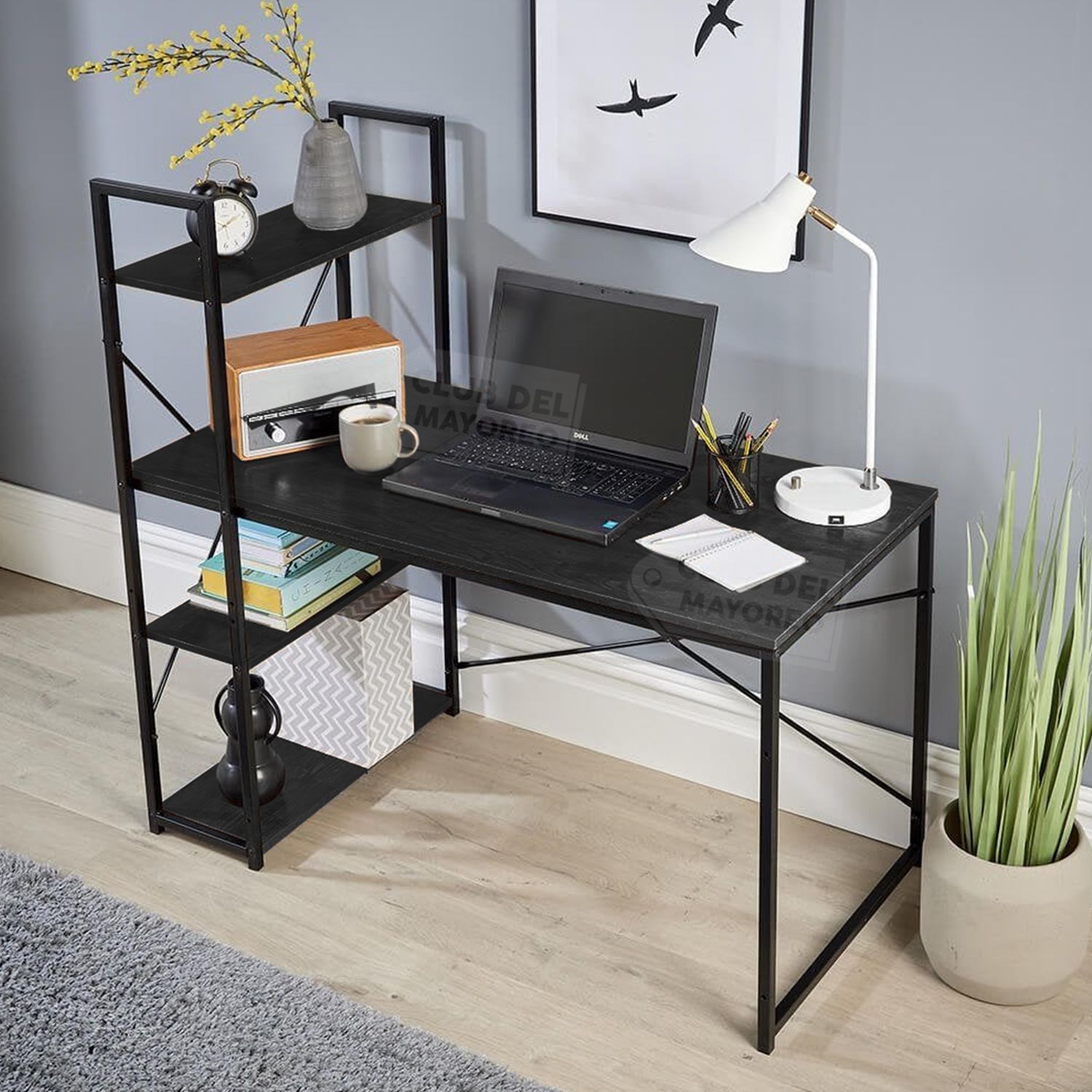 Práctico escritorio ideal para oficina, escuela, casa, etc. Su mesa mide un área de 120 x 60 cm, grande para realizar cualquier tarea administrativa. Cuenta con un estante lateral con una altura de hasta 122 cm, que se puede colocar en cualquier lado del escritorio que usted desee. Fabricado en material de acero color negro en su estructura, estable y duradero. La mesa esta fabricada en madera industrializada con melamina tipo madera natural color negro. La altura de la mesa es de 74 cm cabe perfectamente un silla de oficina.