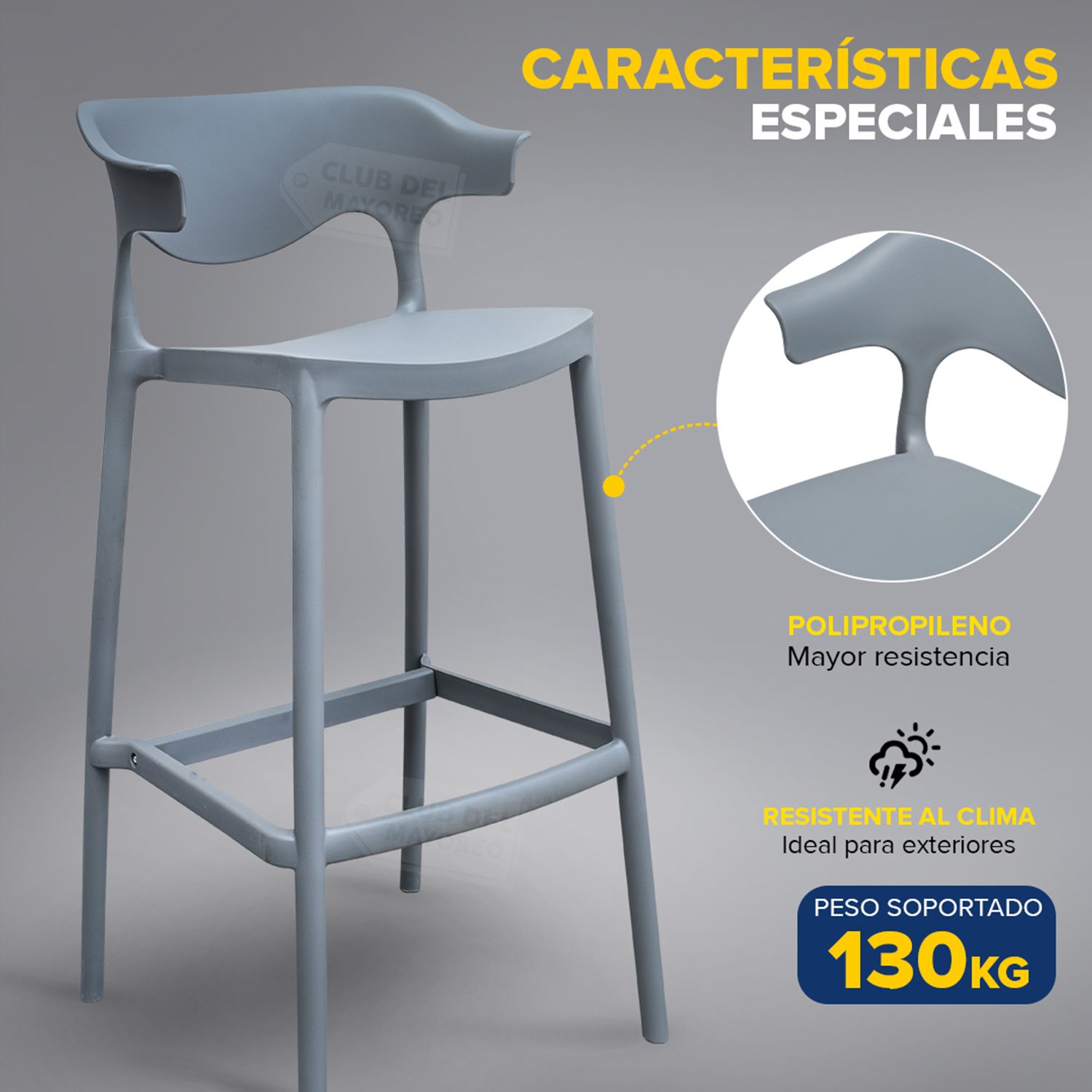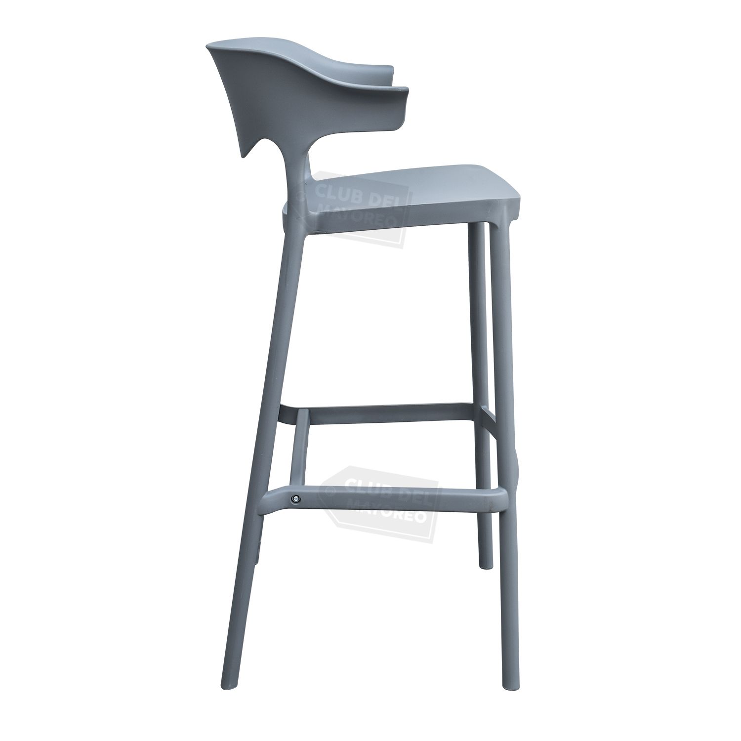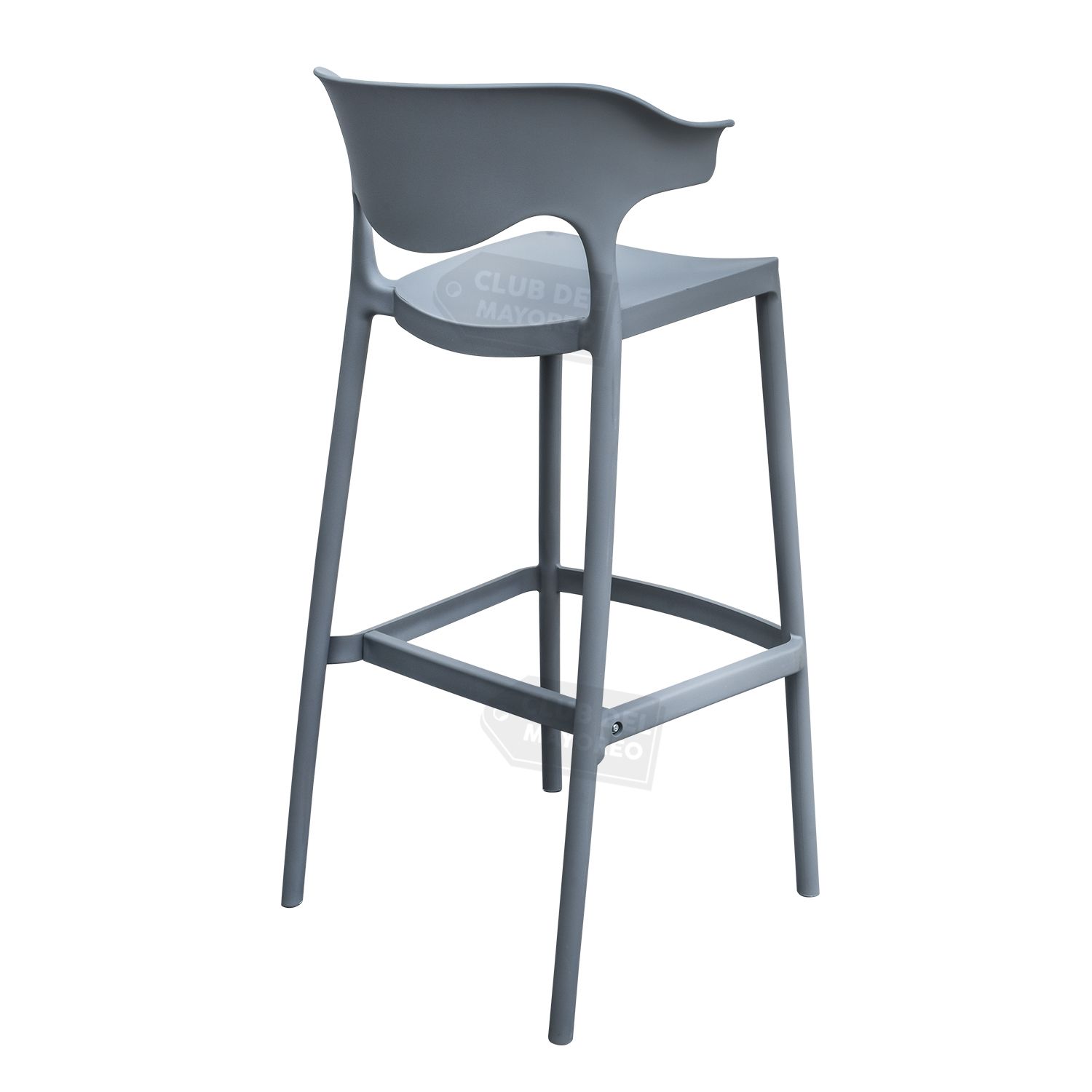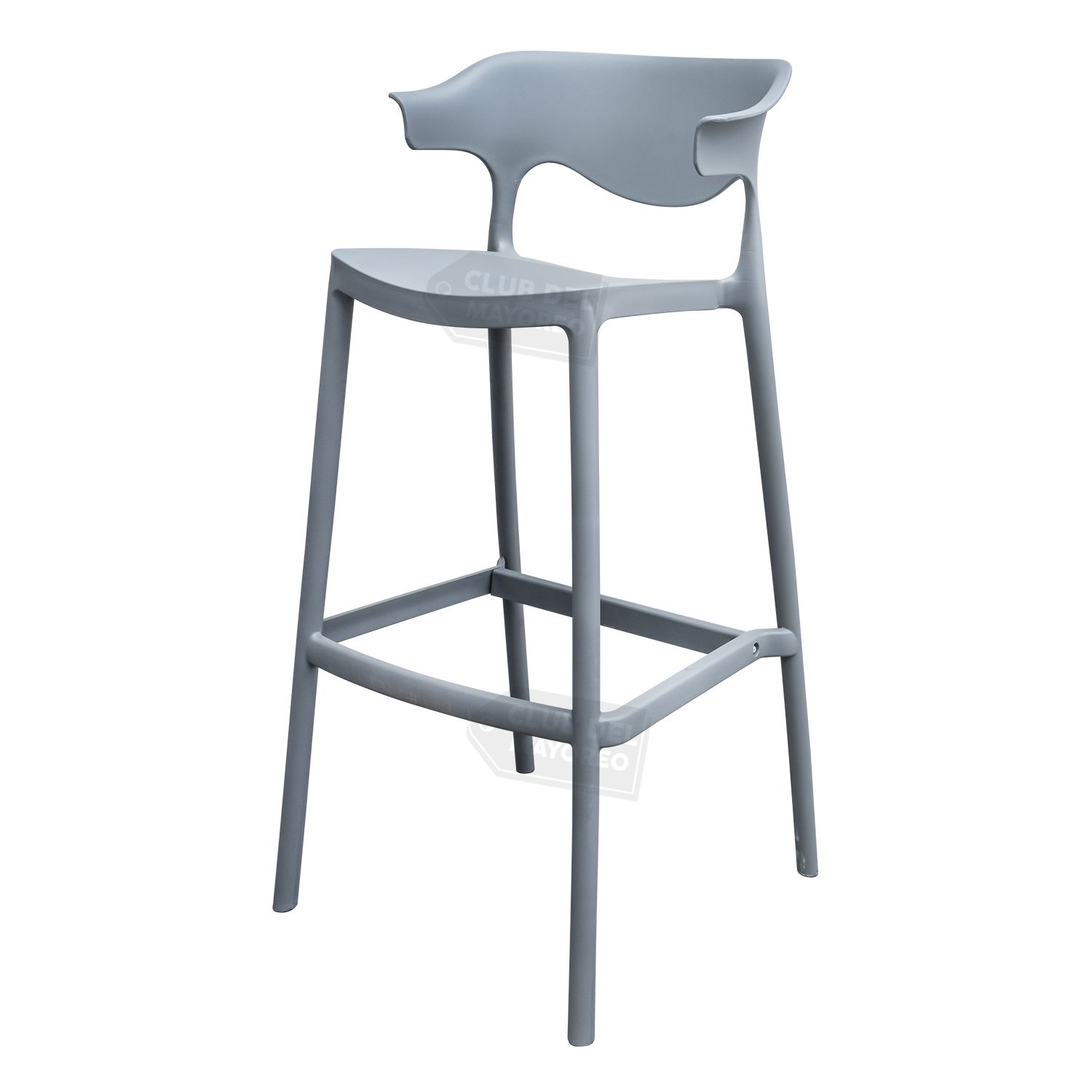 Banco alto para barra, bar, restaurante, comidas, etc. Estilo moderno minimalista color gris y asiento con respaldo moldeado curvo para mayor comodidad. Estructura en polimero resistente a golpes, caidas, etc, puede soportar un peso de hasta 100 kg.