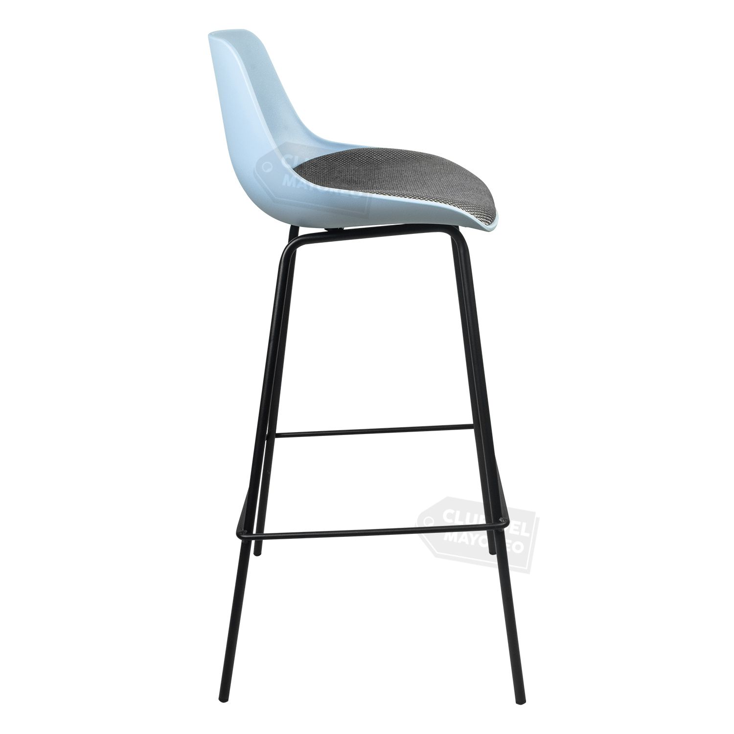 Banco alto para barra, bar, restaurante, comidas, etc. Moderno estilo eames color gris azulado con cojinete acolchado en asiento. Estructura metalica color negro, resistente que puede soportar un peso de hasta 100 kg.