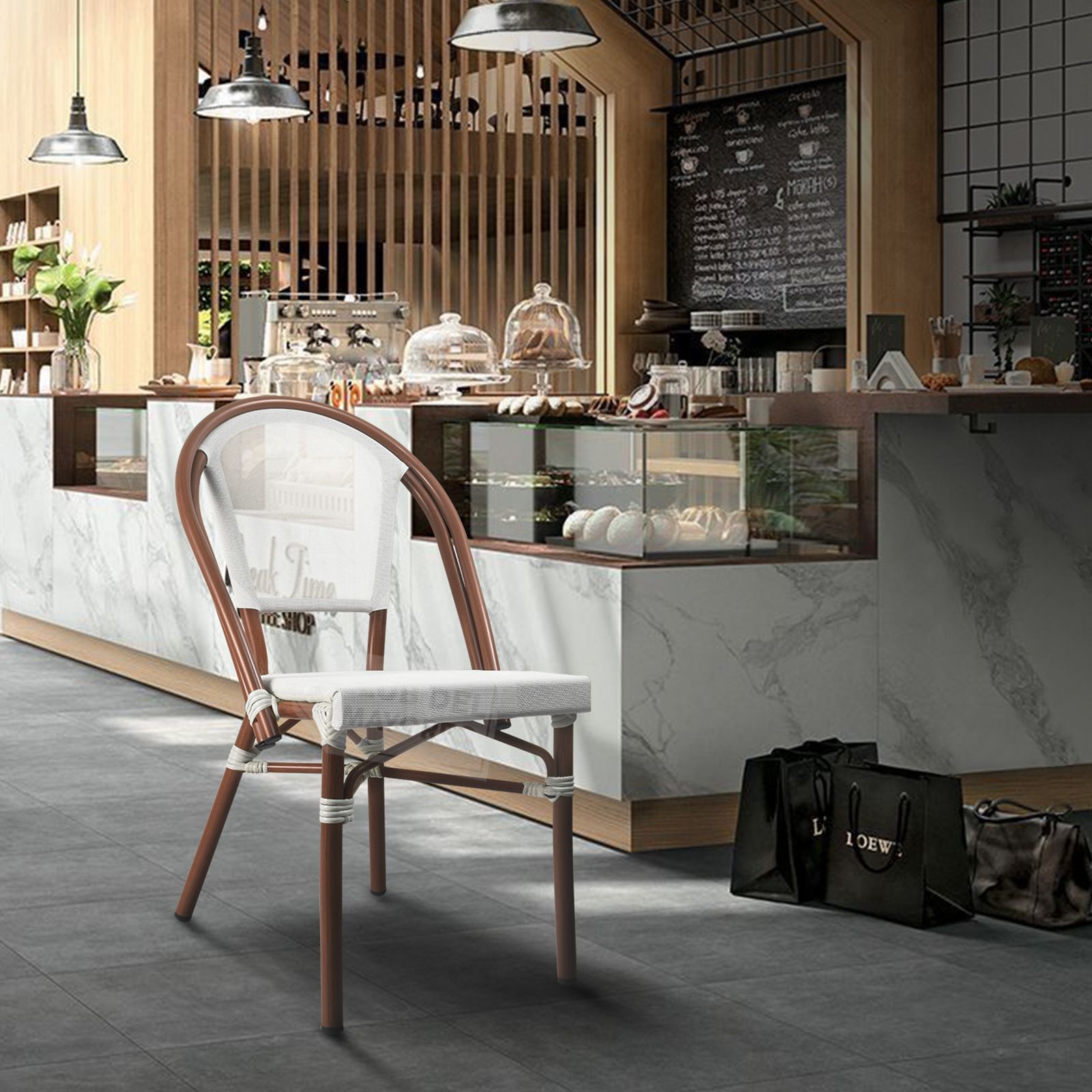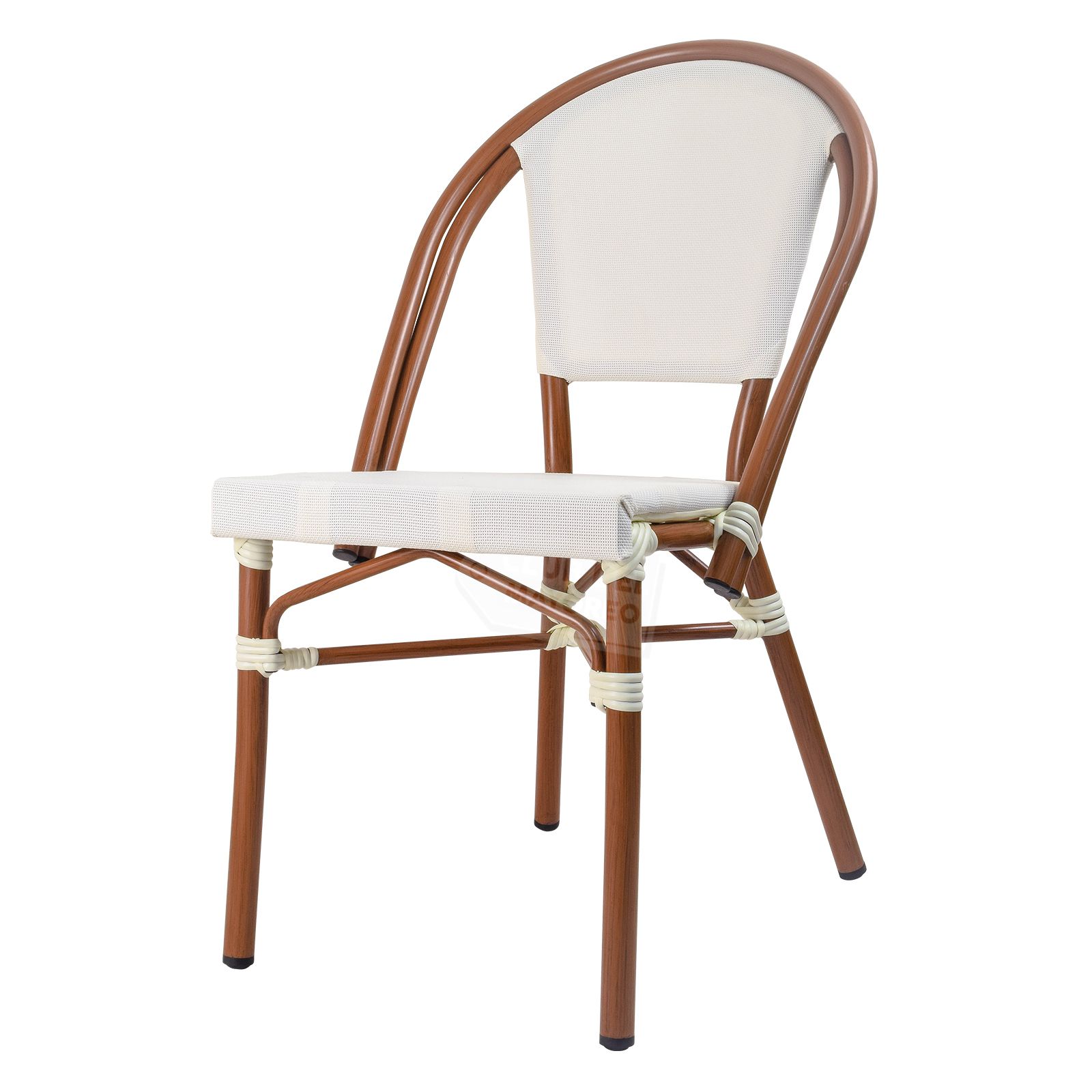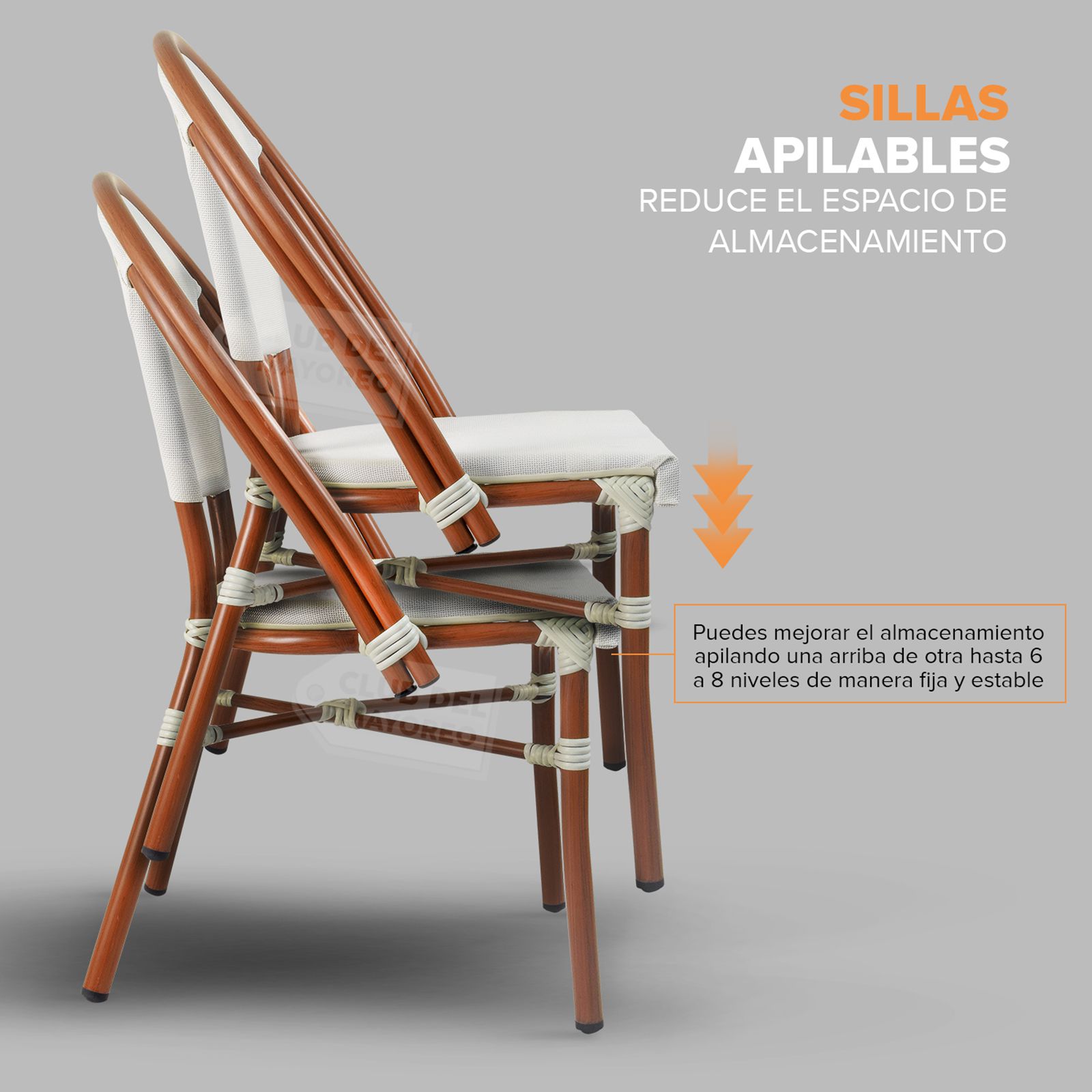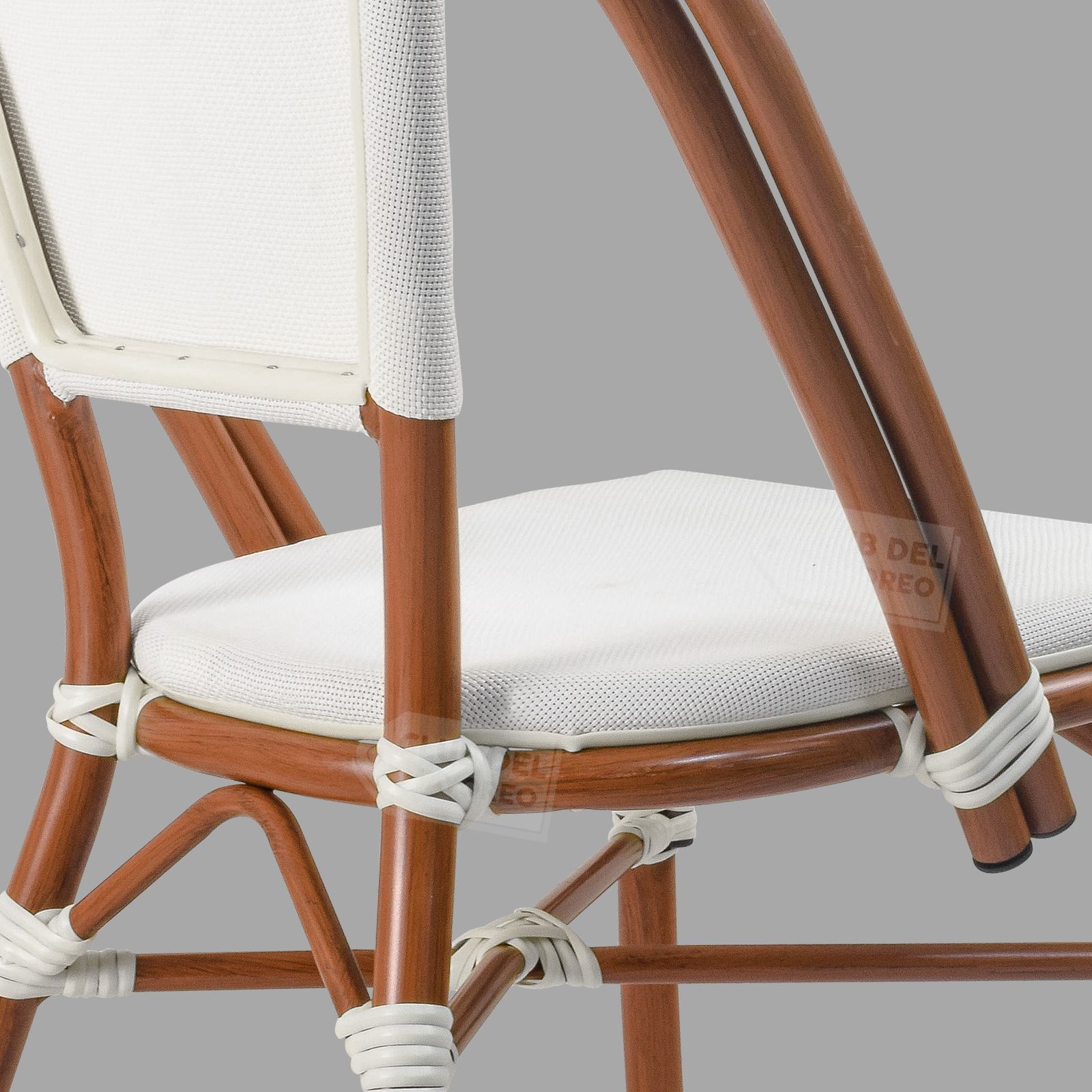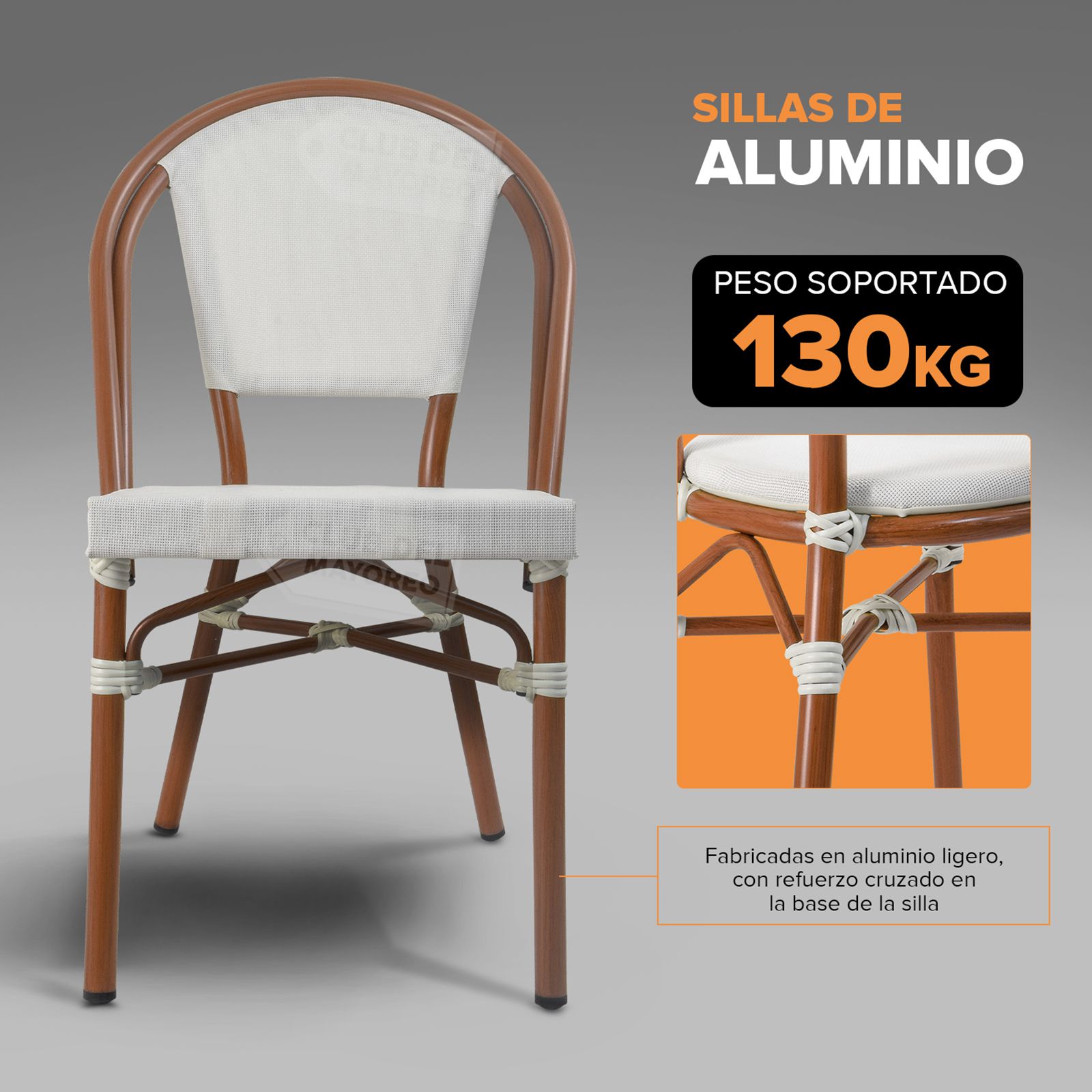 Inspirada en las cafeterías exteriores francesas pensadas en un ambiente al aire libre y en la calle, color sutil y elegante con diseño ovalado en respaldo para mejor comodidad y relajación. Fabricadas en estructura de aluminio las convierten en ligeras y nada pesadas. Texturizadas en tipo madera bambú oscuro con imitacion de amarre en cada estructura. Asiento y respaldo en malla entretejido estilo rattan sintético de gran durabilidad. La silla puede soportar un peso máximo de 130 kg.