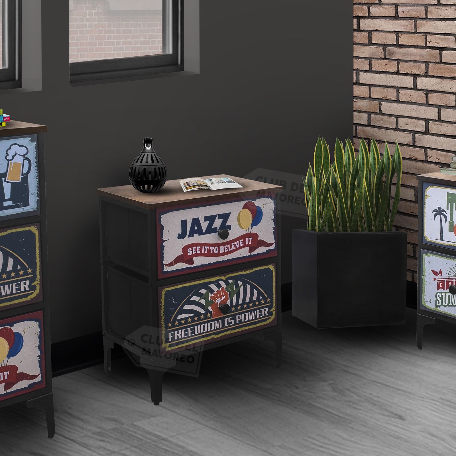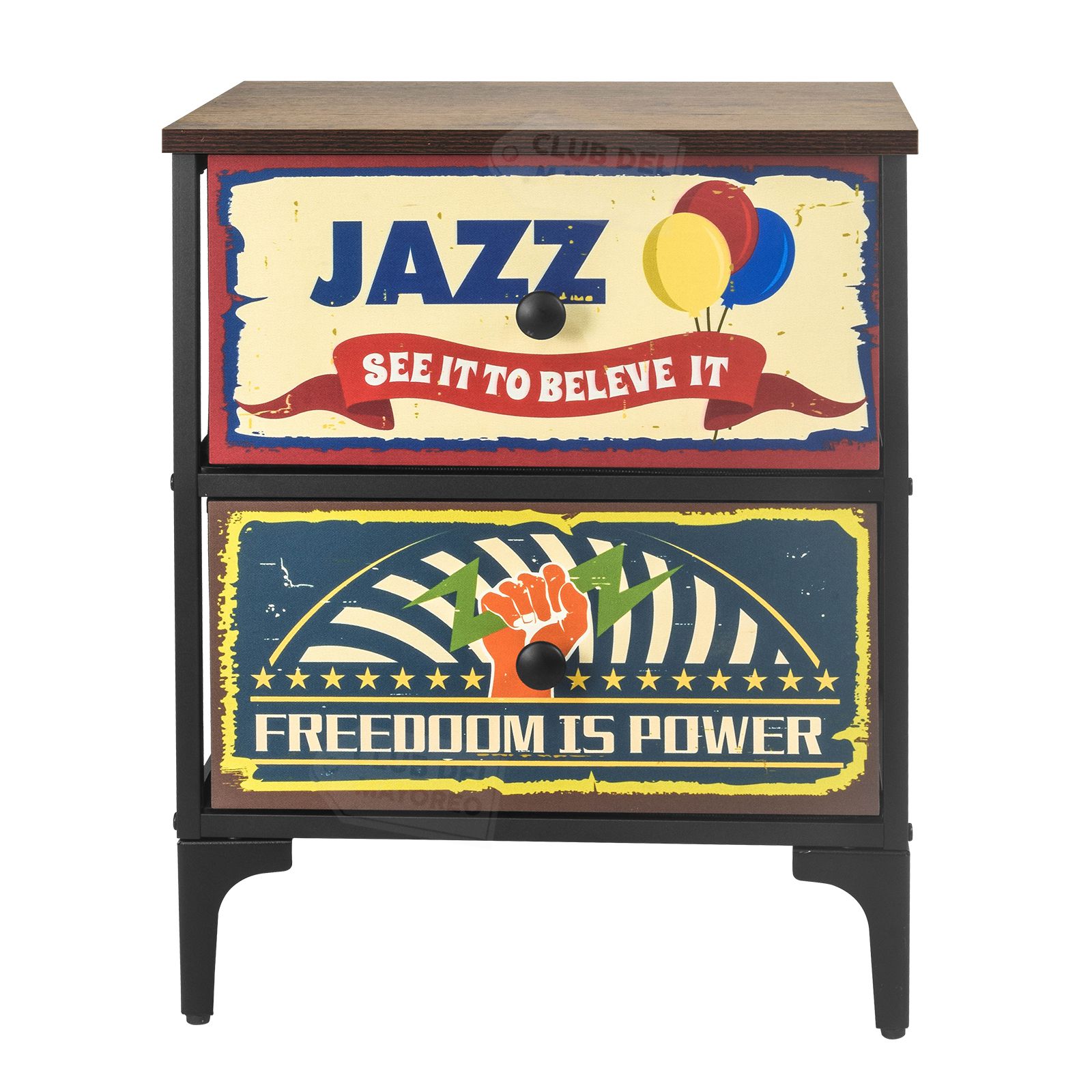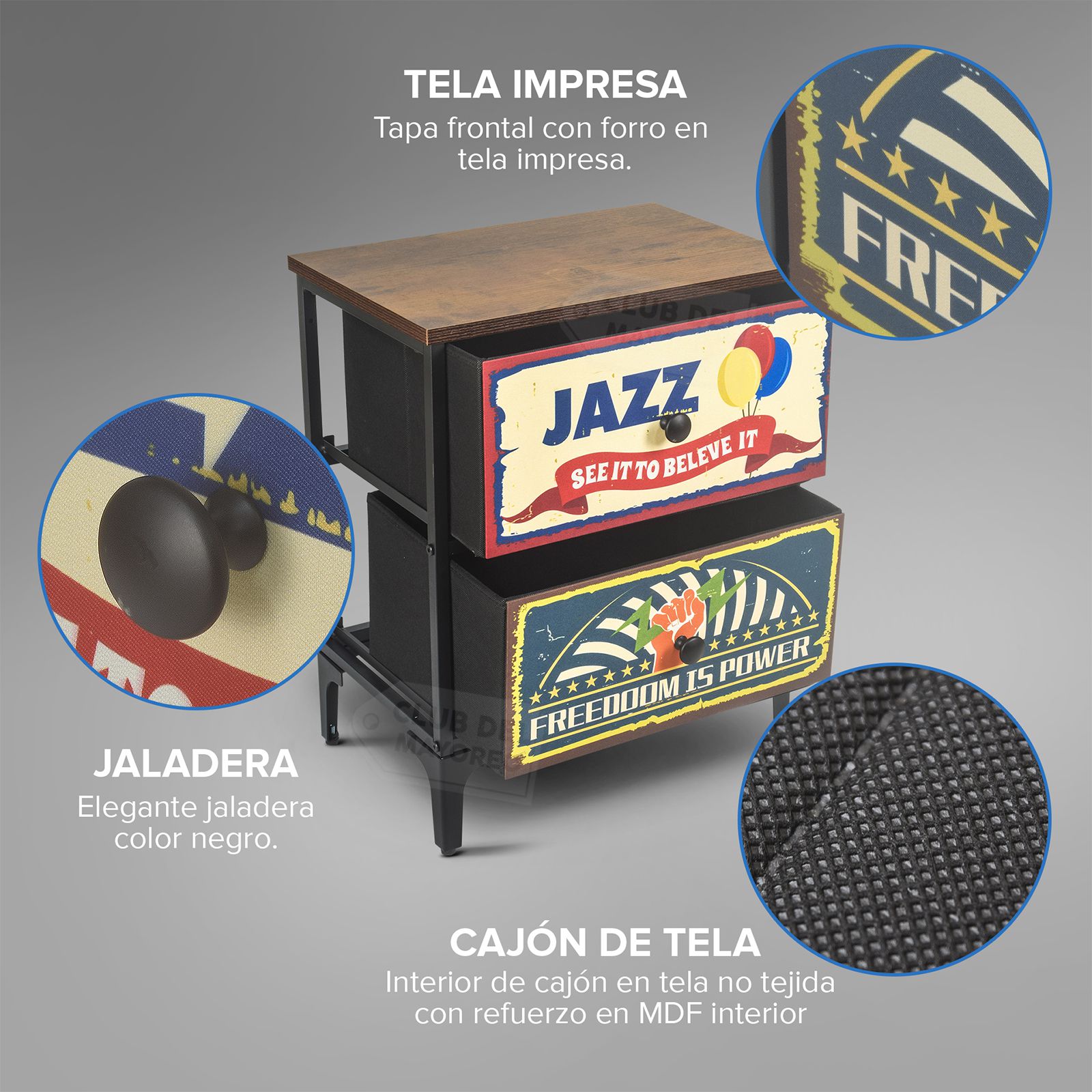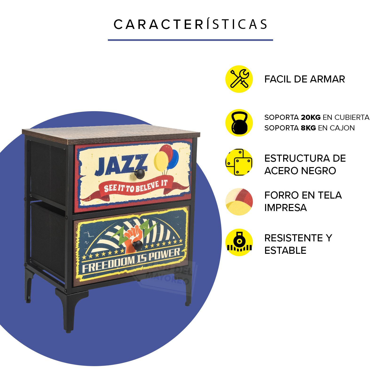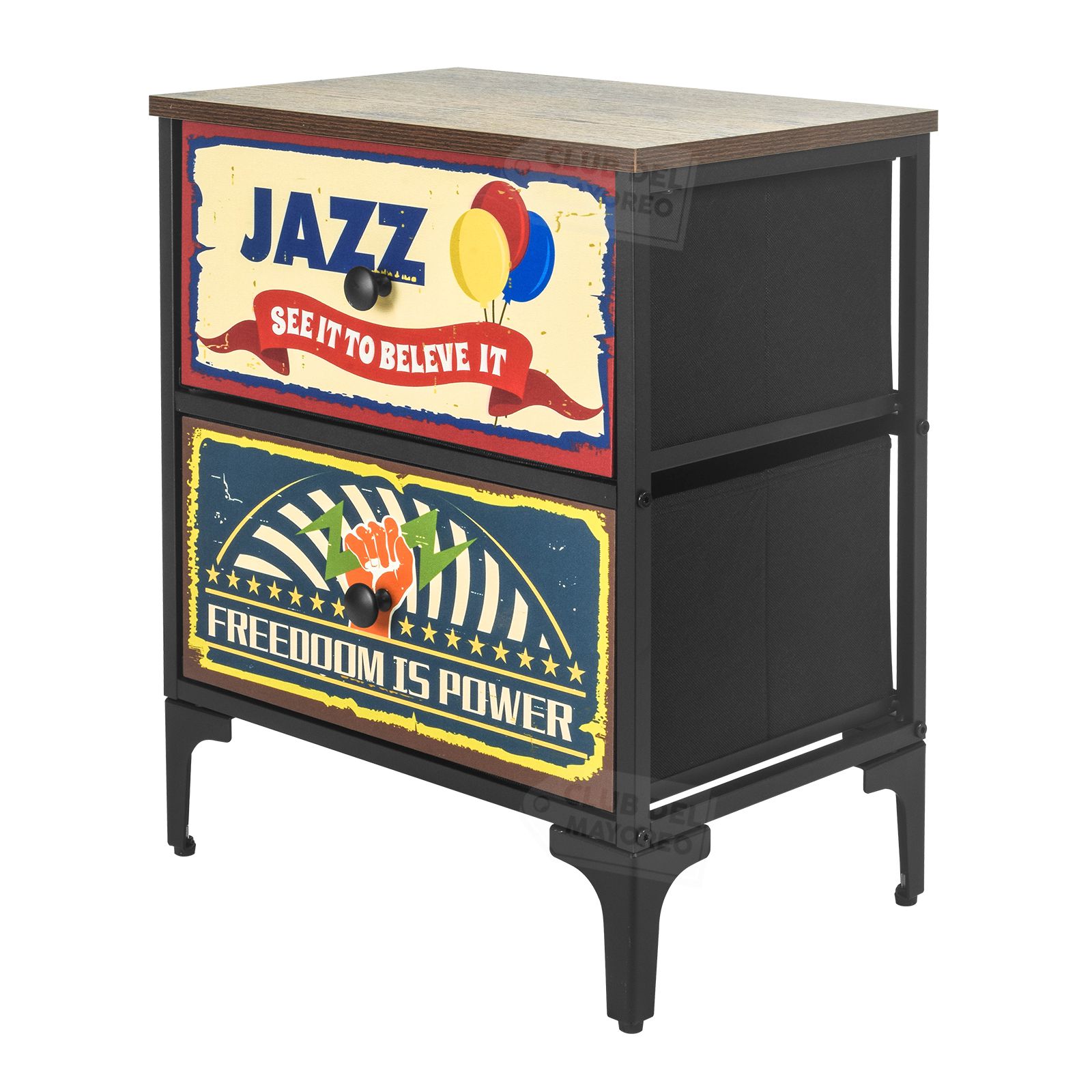 Moderno y sencillo buro de la coleccion New York con dos cajones en tela impresa con diseño diferentes, interior con tapas en MDF y tela no tejida color negro. Fabricado con estructura metálica resistente y repisa superior en madera industrializada con melamina tipo madera roble. Ideal para combinar con cualquier ambiente de tu recámara. Puede soportar hasta 30 kg en la repisa y entre 8 y 10 Kg en cada cajon. Fácil de armar en solo 20 minutos.