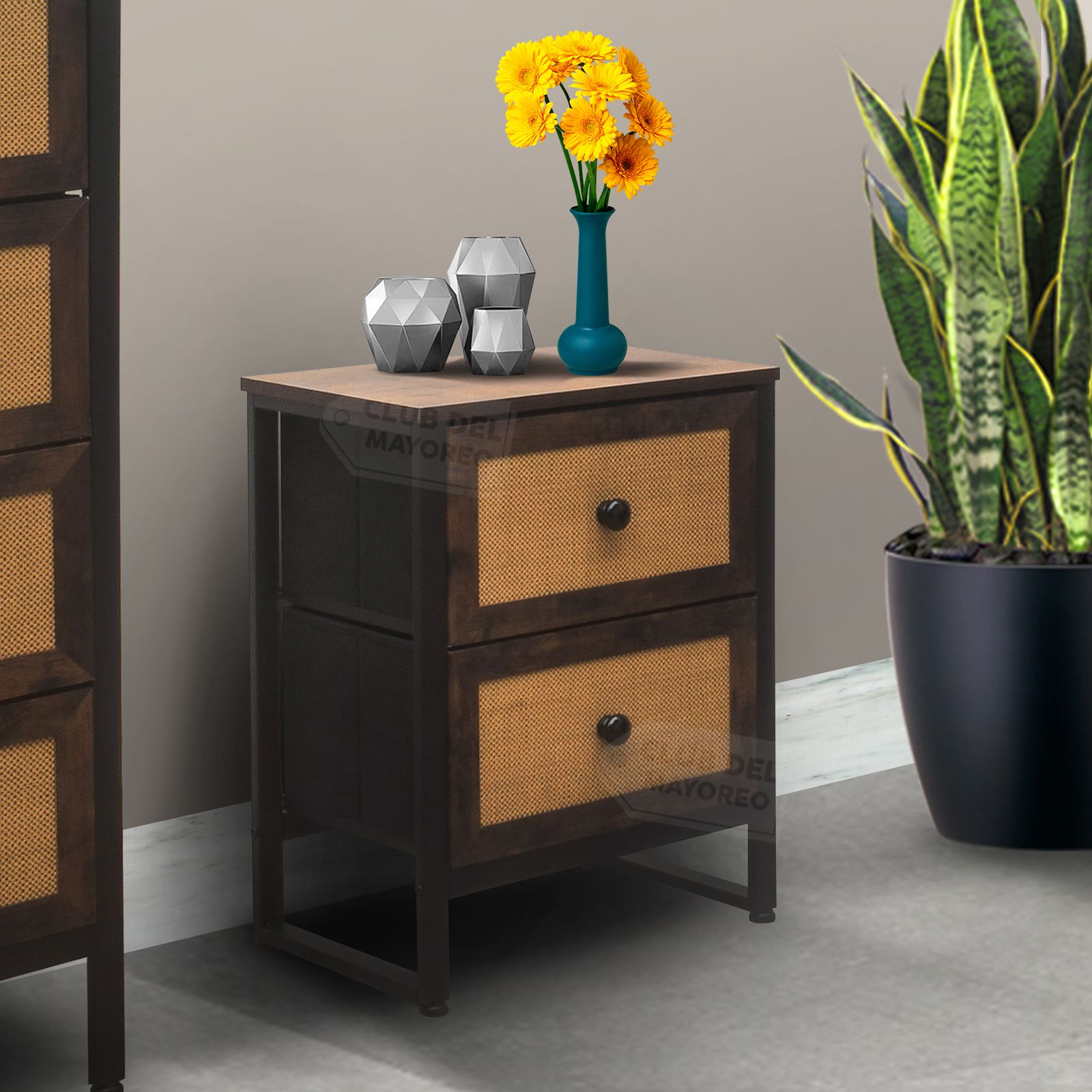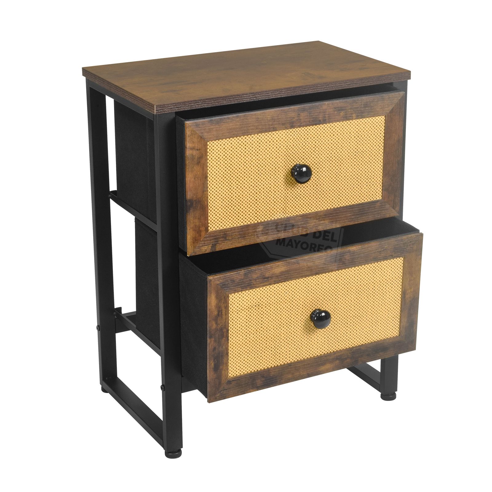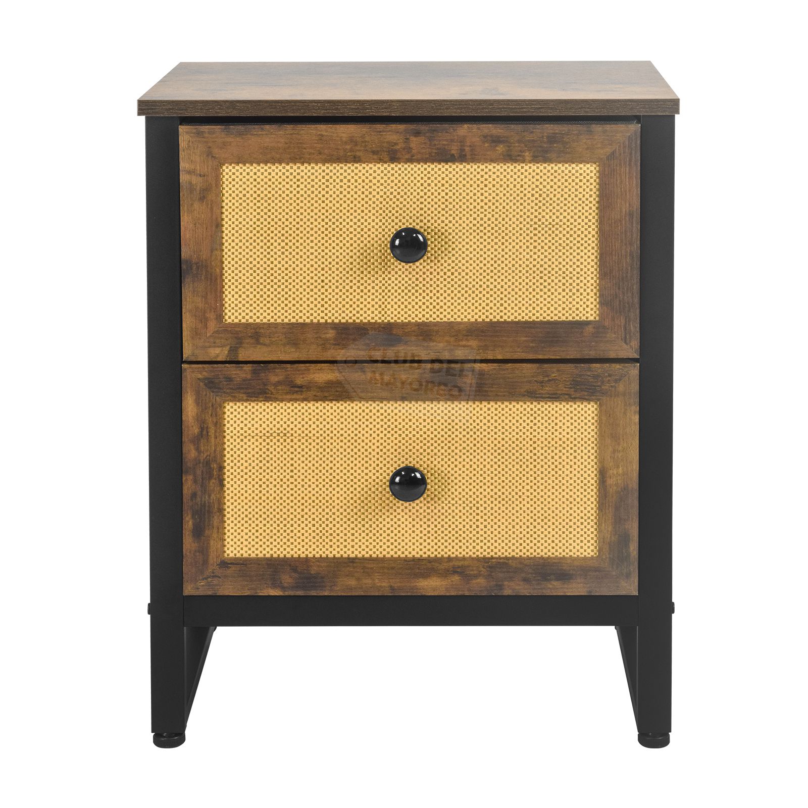 Moderno buro de la coleccion Budapest con dos cajones en marco de madera tipo roble y diseño estilo ratán color beige, interior con tapas en MDF y tela no tejida color negro. Fabricado con estructura metálica resistente y repisa superior en madera industrializada con melamina tipo madera roble. Ideal para combinar con cualquier ambiente de tu recámara. Puede soportar hasta 30 kg en la repisa y entre 8 y 10 Kg en cada cajon. Fácil de armar en solo 20 minutos.