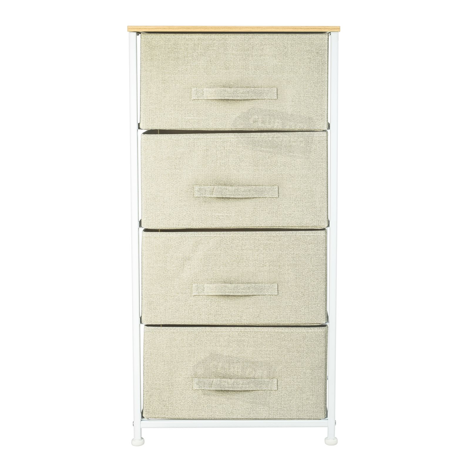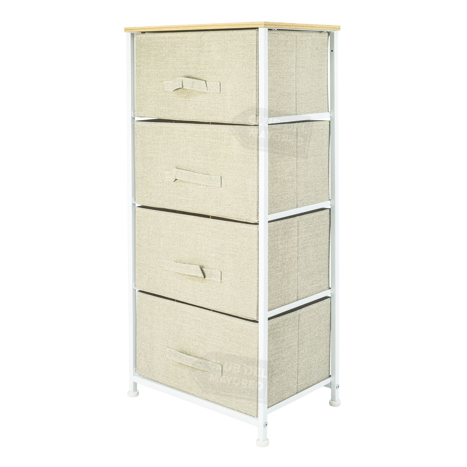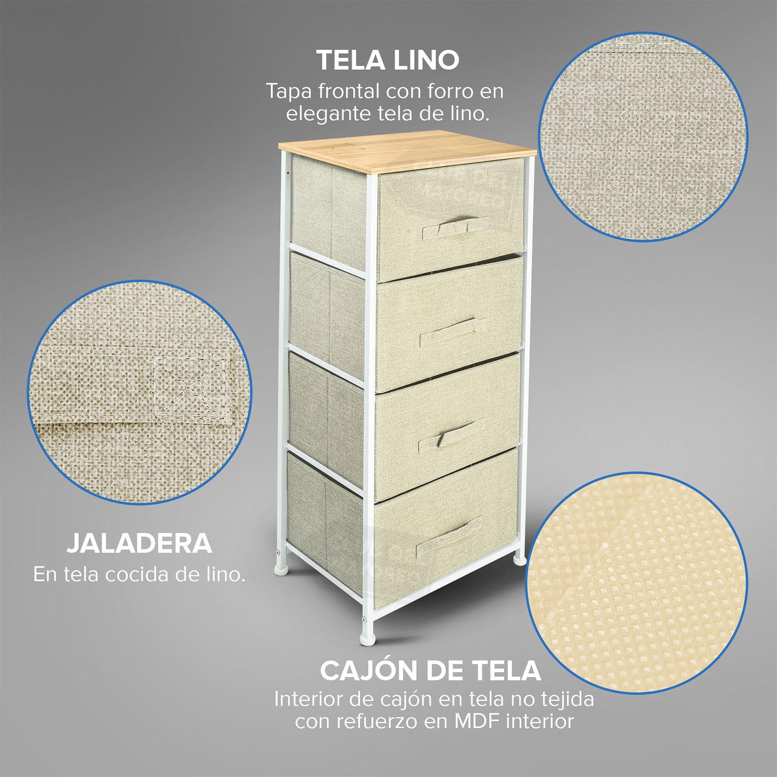 Moderna cajonera vertical de la coleccion Paris con cuatro cajones en tela de lino color beige, interior con tapas en MDF y tela no tejida color beige. Fabricado con estructura metálica resistente y repisa superior en madera industrializada con melamina tipo madera natural. Idea para combinar con cualquier ambiente de tu recámara. Puede soportar hasta 30 kg en la repisa y entre 8 y 10 Kg en cada cajon. Fácil de armar en solo 20 minutos.