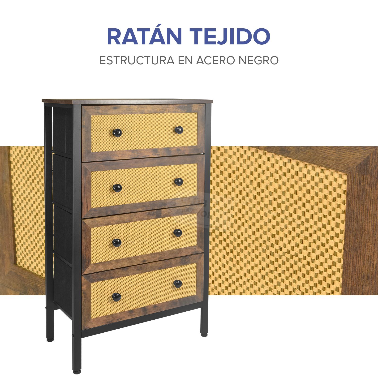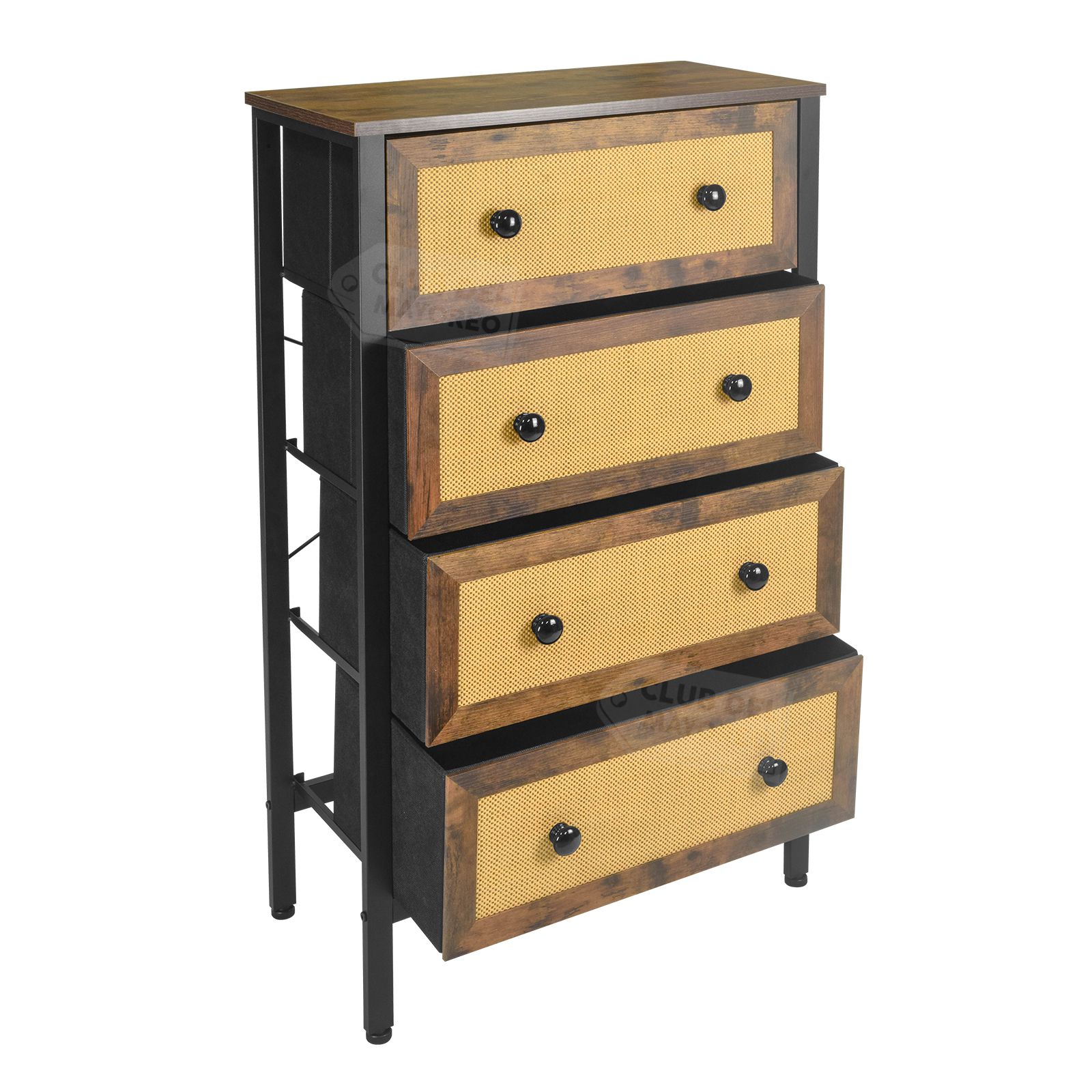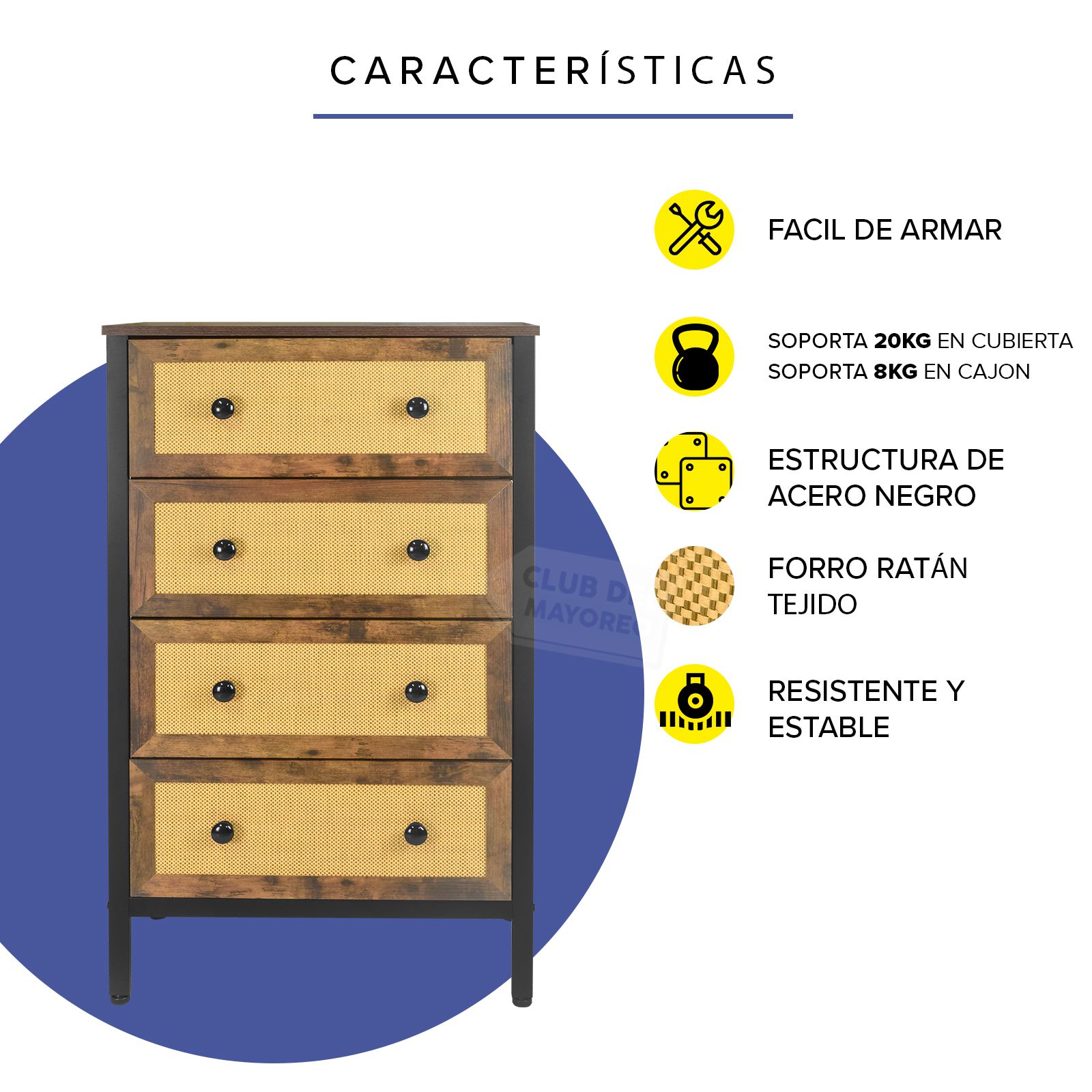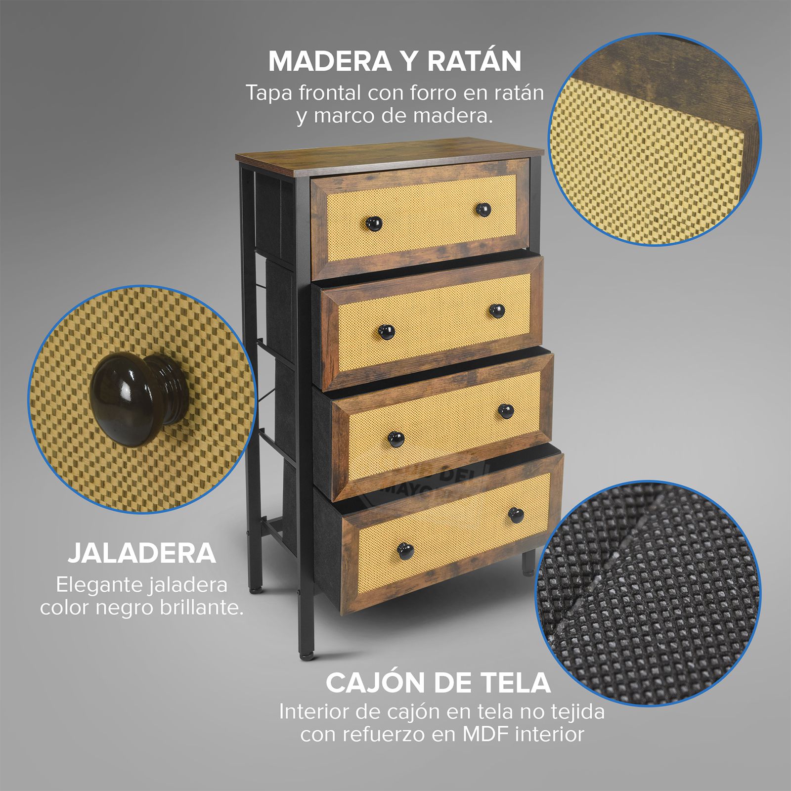 Gran cajonera vertical ancha de la coleccion Budapest con cuatro cajones en marco de madera tipo roble y diseño estilo ratán color beige, interior con tapas en MDF y tela no tejida color negro. Fabricado con estructura metálica resistente y repisa superior en madera industrializada con melamina tipo madera roble. Ideal para combinar con cualquier ambiente de tu recámara. Puede soportar hasta 50 kg en la repisa y entre 8 y 10 Kg en cada cajon. Fácil de armar en solo 20 minutos.