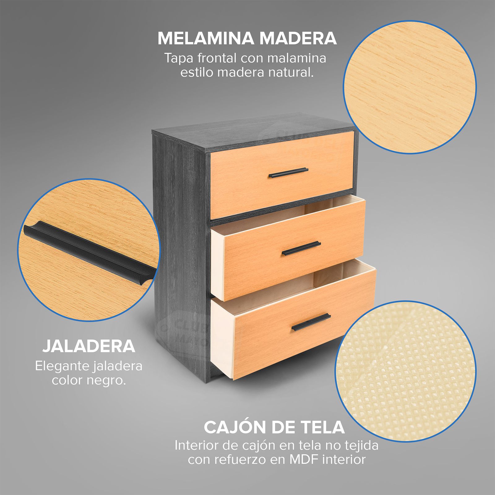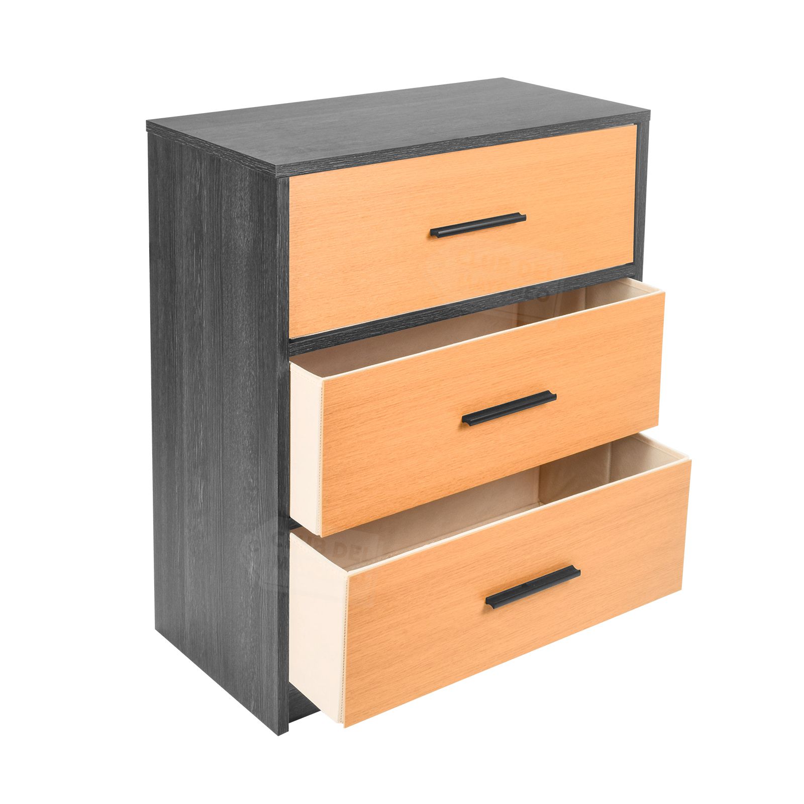 Moderna cajonera vertical de la coleccion Oslo con 3 cajones en tela con tapa frontal en MDF y melamina tipo madera de pino natural, interior con tapas en MDF y tela no tejida color beige. Fabricado con estructura en madera industrializada resistente y con melamina tipo madera gris. Ideal para combinar con cualquier ambiente de tu recámara. Puede soportar hasta 40 kg en la repisa y entre 10 y 15 Kg en cada cajon. Fácil de armar en solo 30 minutos.