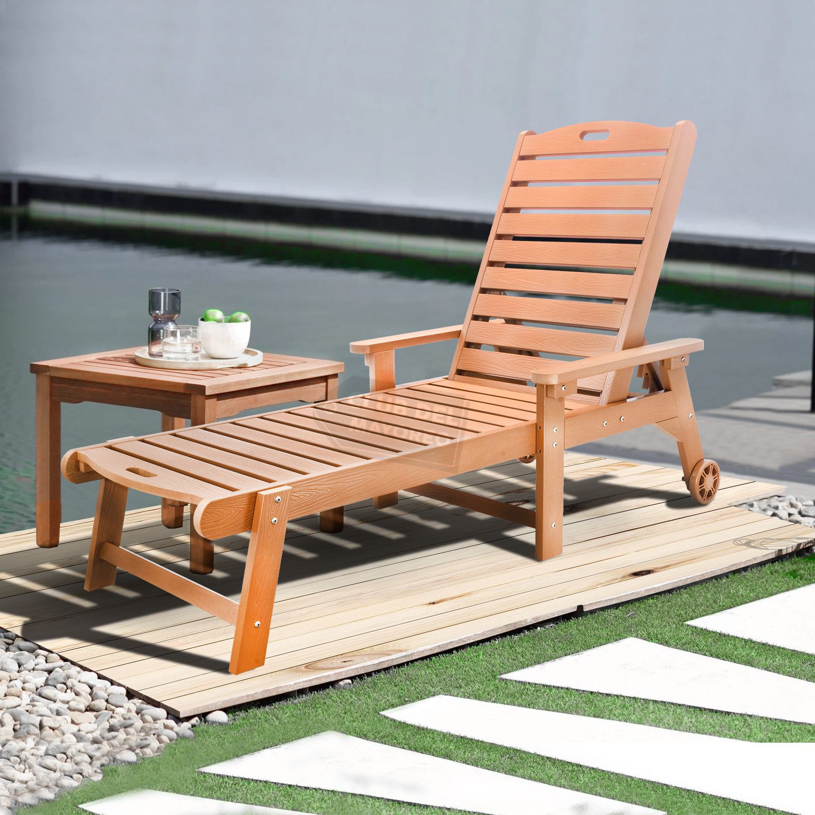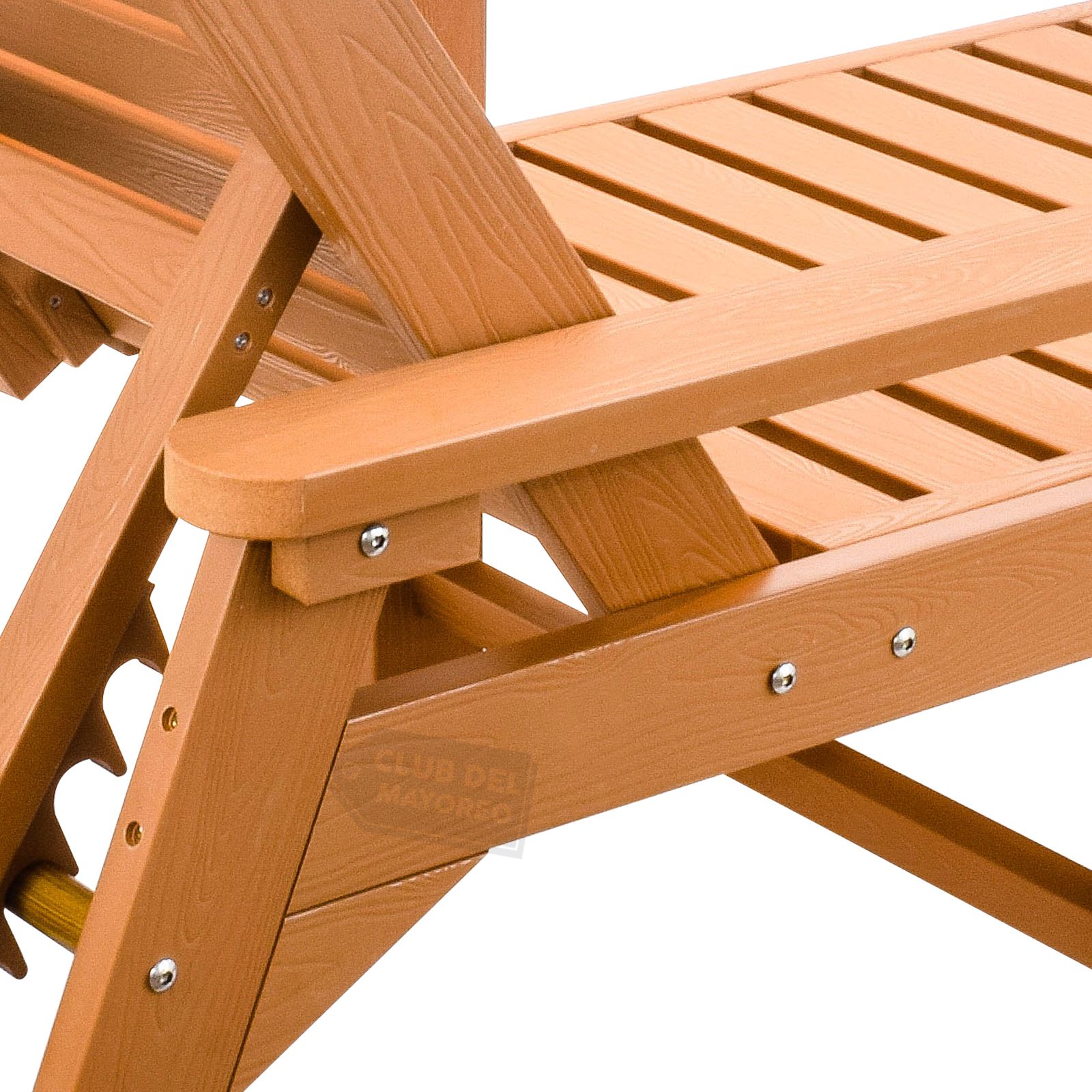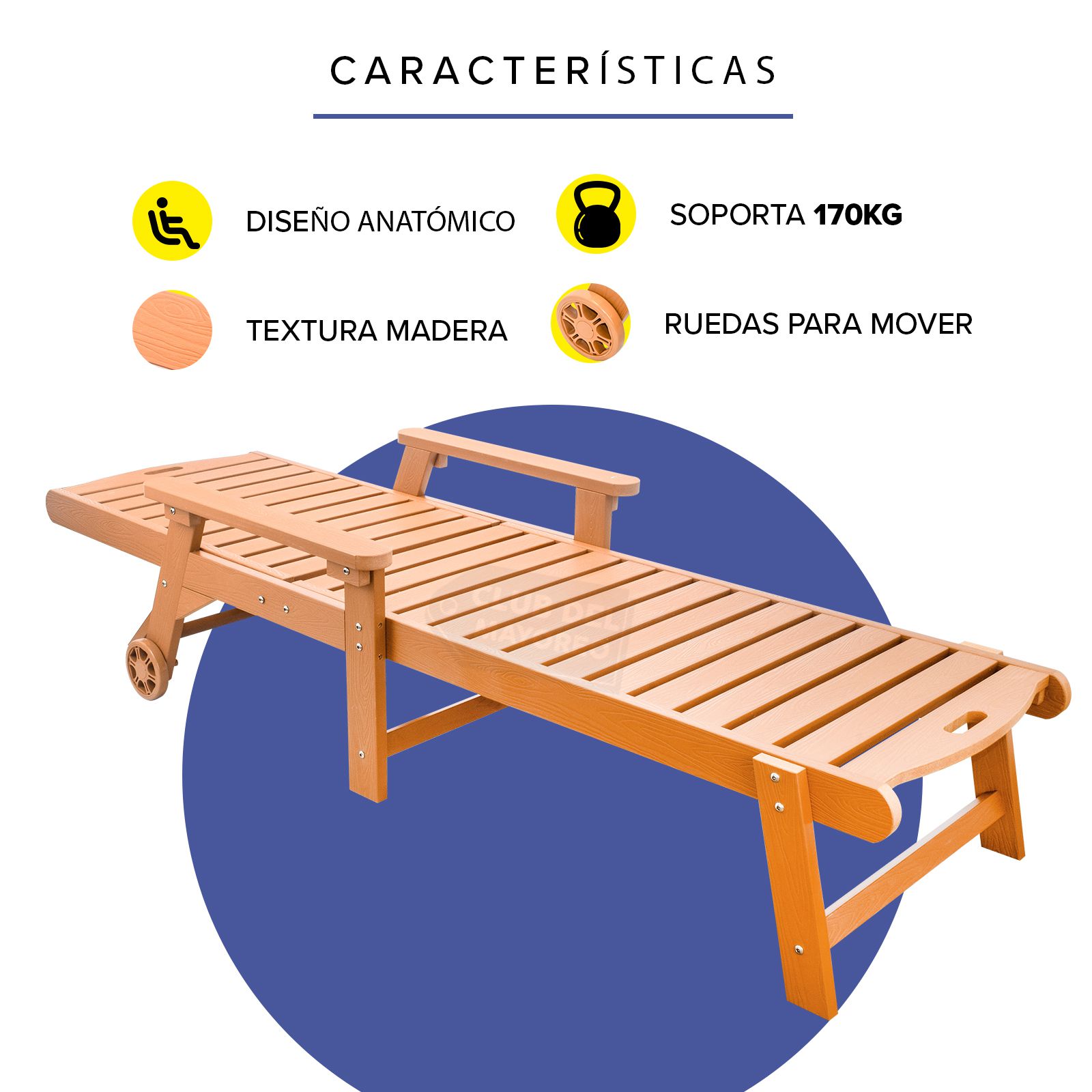 Relajese completamente y disfrute de un día soleado al exterior de una piscina, playa, jardin u hotel, ya que tiene un resplado reclinable en hasta 5 posiciones para disfrutar del ángulo perfecto para descansar. Fabricado en resina de polietileno resistente a cualquier clima por periodos prolongados y con diseño tipo de madera en roble natural. Es ligero y fácil de mover gracias a sus ruedas. Puede soportar hasta un peso máximo de 170 kg. Fácil de limpiar y libre de mantenimiento.