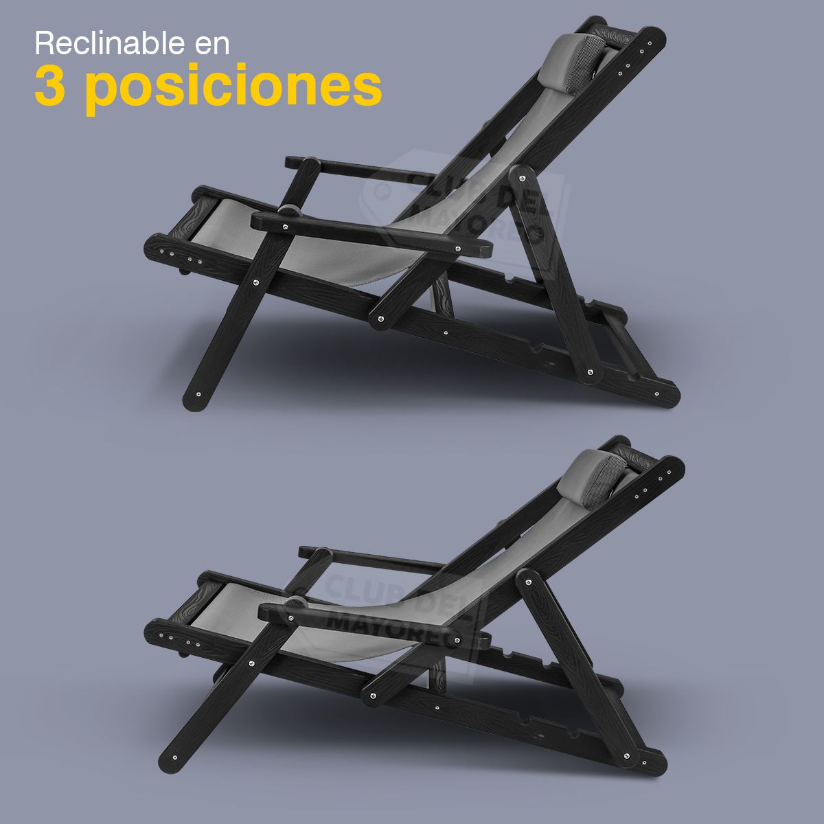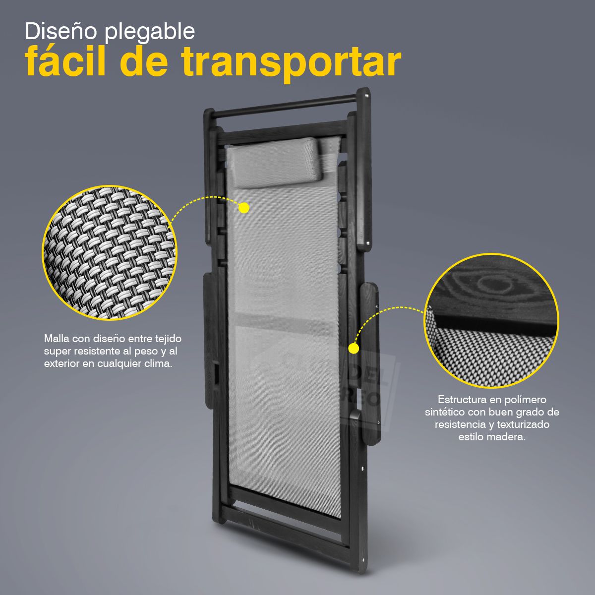 Práctico y moderno camastro individual plegable, con respaldo en malla que se ajusta a la posicion del cuerpo. Cuenta con tres niveles de inclinación. Fabricado en madera sintética resistente capaz de soportar climas calidos, lluviosos, frio, etc. Se pliega facilmente para guardarse en cualquier lugar y ahorrar espacio. Puede soportar un peso de hasta 120 Kg.