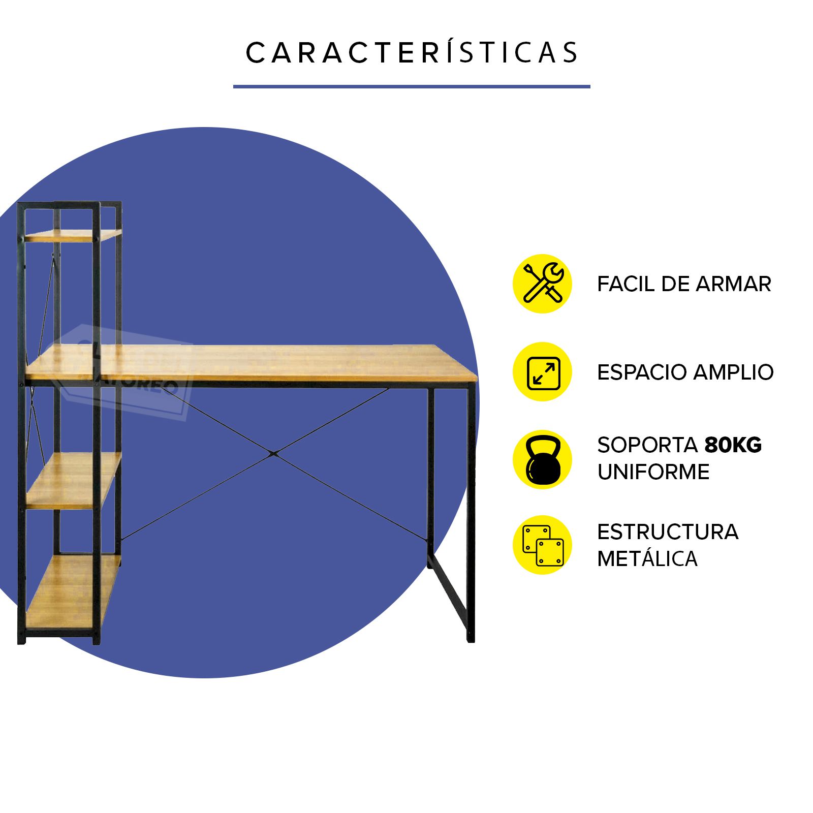 Práctico y funcional escritorio ideal para oficina, escuela, casa, etc. Su mesa mide un área de 120 x 60 cm, amplio para realizar cualquier tarea administrativa. Cuenta con un estante lateral con una altura de hasta 121 cm, que se puede colocar en cualquier lado del escritorio que usted desee. Fabricado en material de acero color negro en su estructura, estable y duradero. La mesa esta fabricada en madera industrializada con melamina tipo madera natural. La altura de la mesa es de 75 cm cabe perfectamente un silla de oficina.