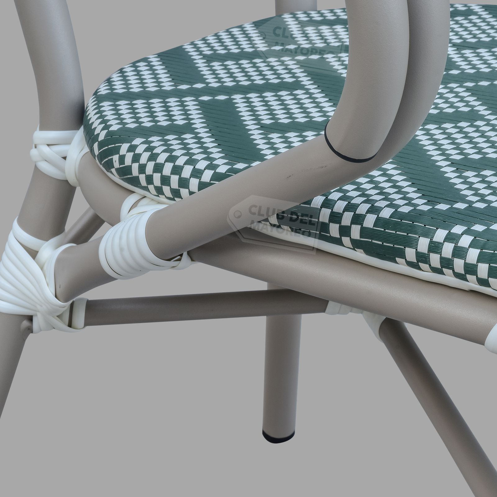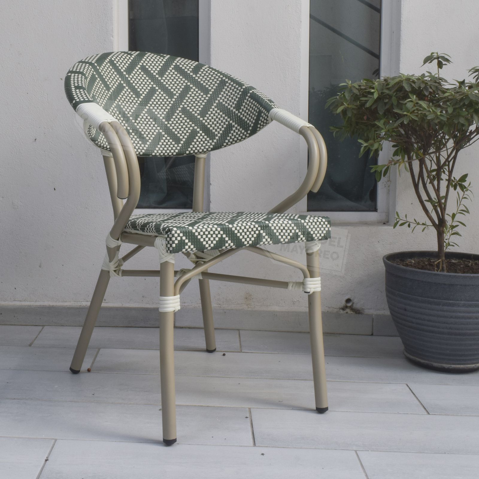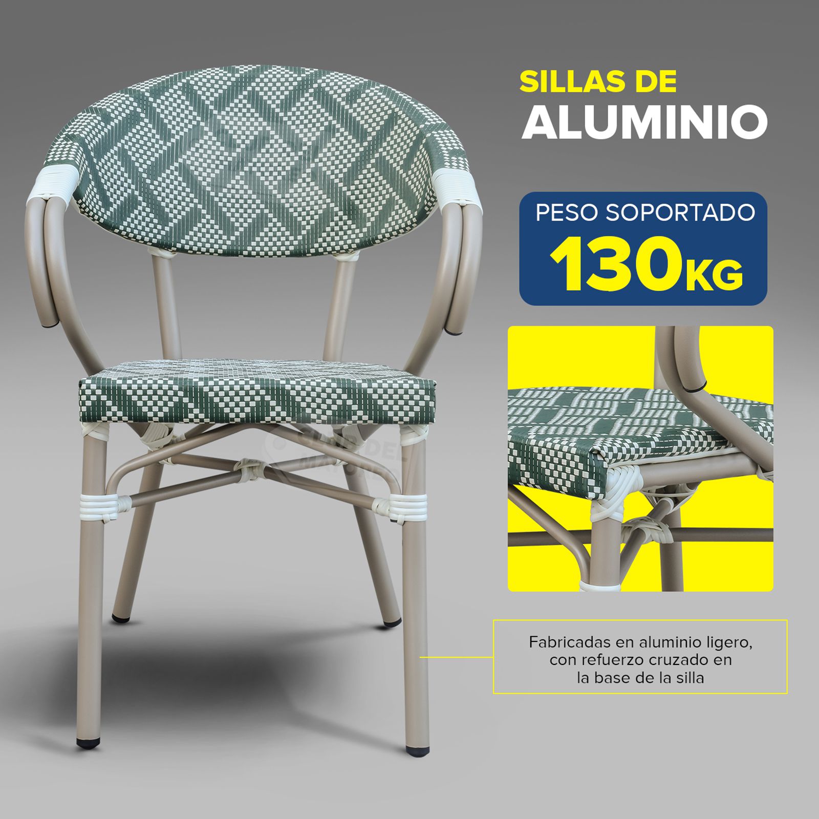 Inspirada en las cafeterías exteriores francesas pensadas en un ambiente al aire libre y en la calle, color sutil y elegante con diseño ovalado y curvo en respaldo para mejor comodidad y relajación. Fabricadas en estructura de aluminio las convierten en ligeras y nada pesadas. Con imitacion de amarre en cada estructura. Asiento y respaldo en malla entretejido estilo rattan sintético de gran durabilidad. La silla puede soportar un peso máximo de 130 kg.