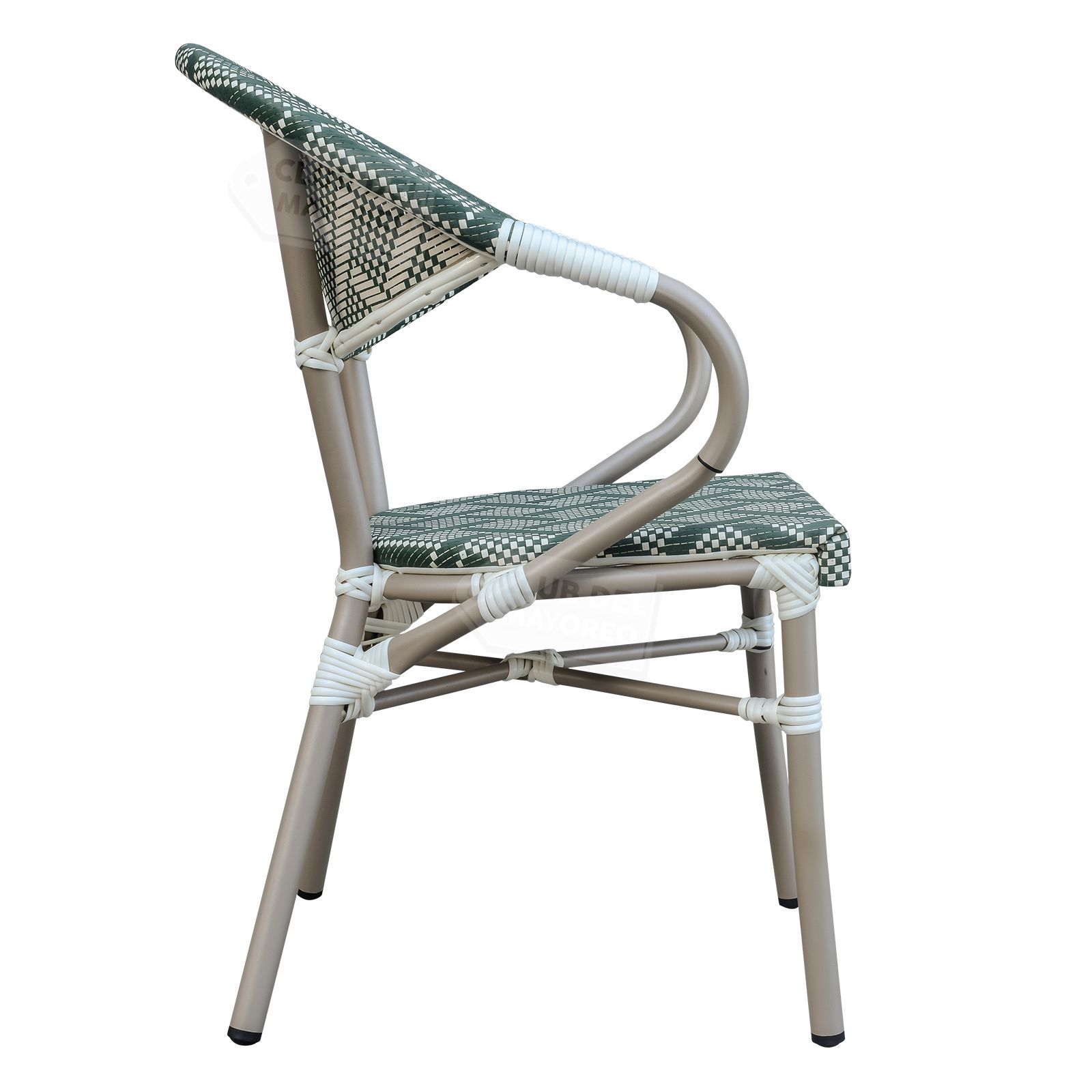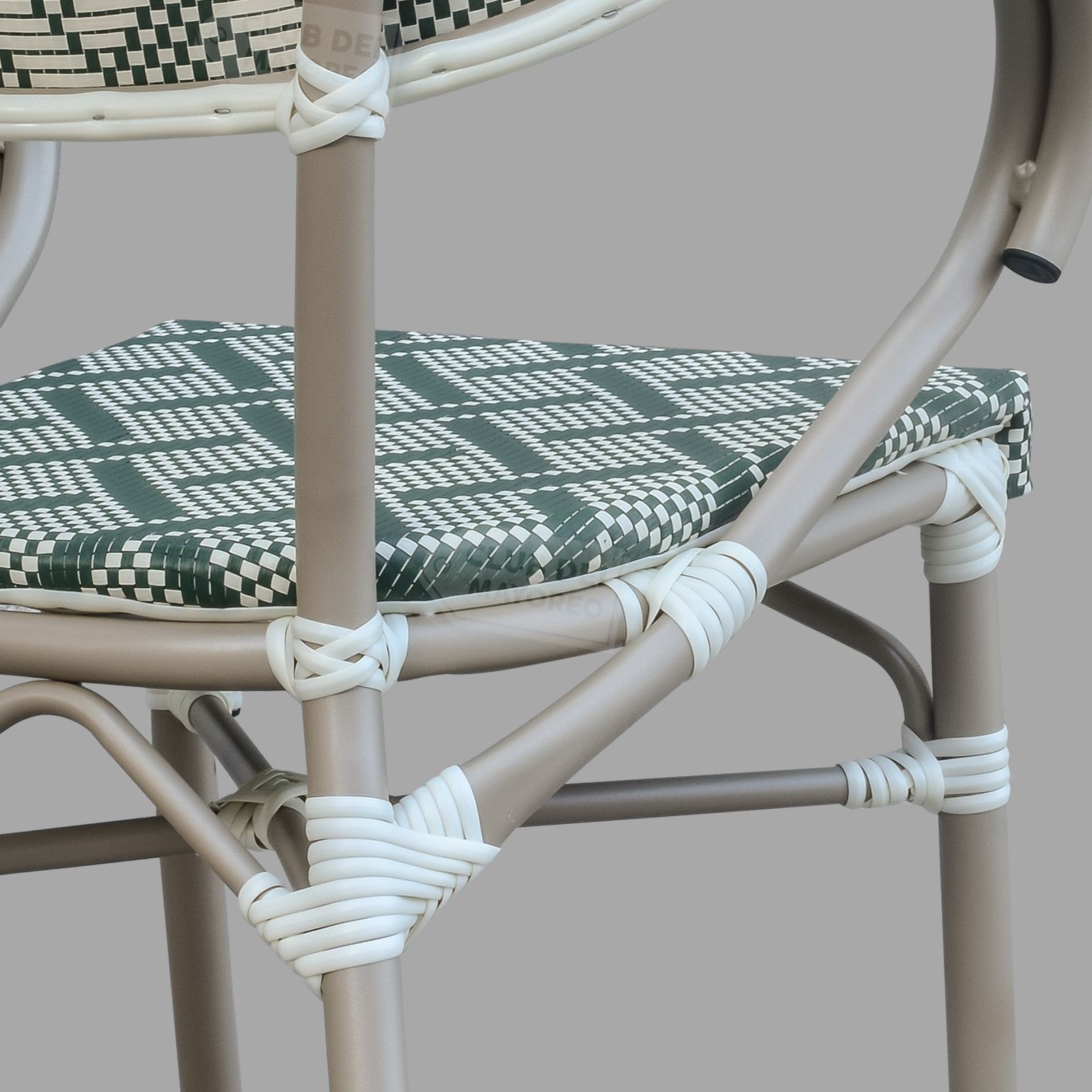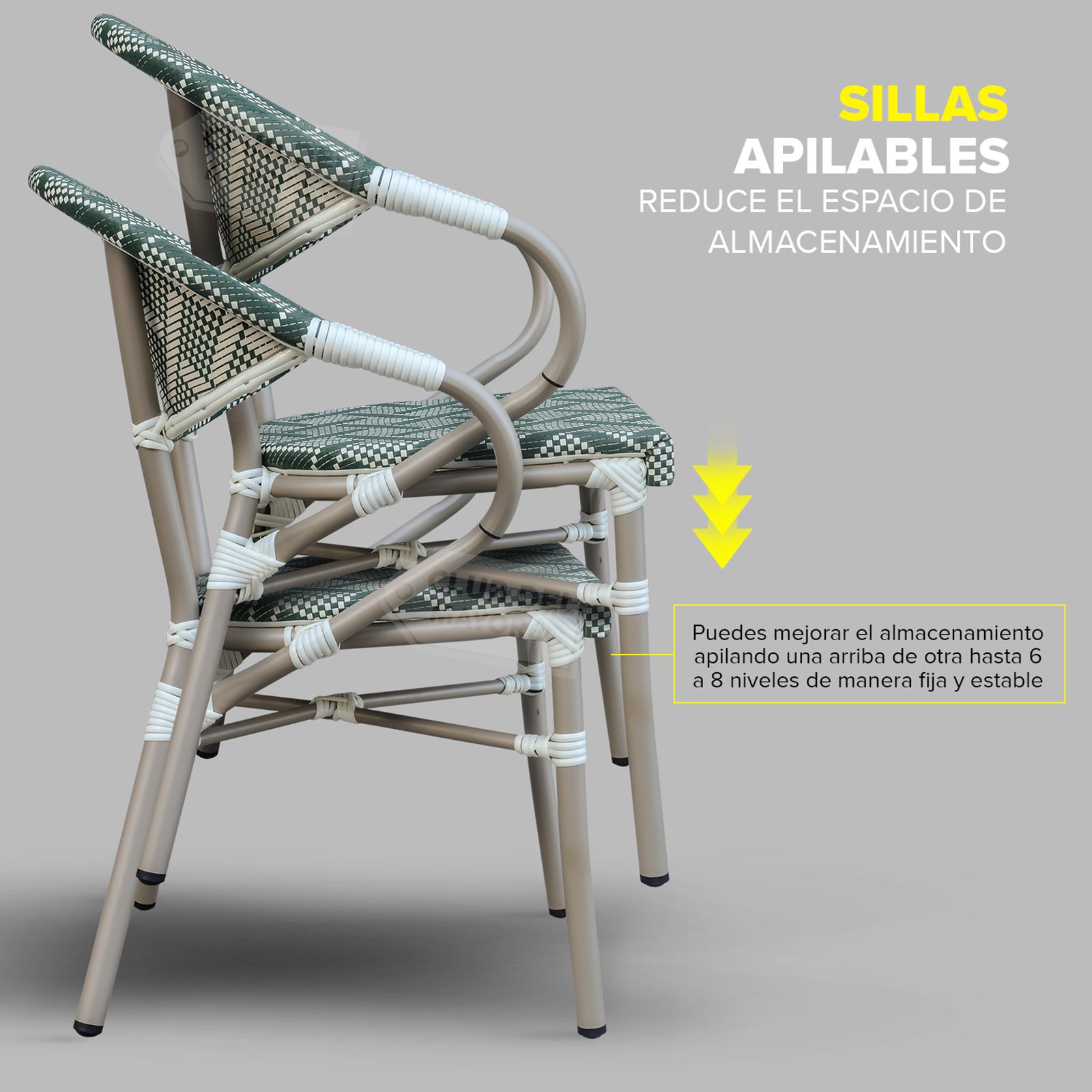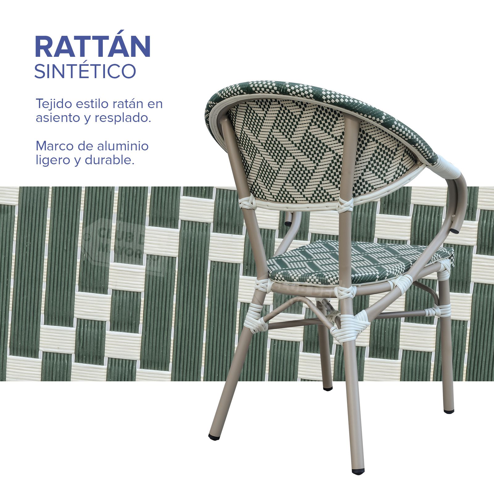 Inspirada en las cafeterías exteriores francesas pensadas en un ambiente al aire libre y en la calle, color sutil y elegante con diseño ovalado y curvo en respaldo para mejor comodidad y relajación. Fabricadas en estructura de aluminio las convierten en ligeras y nada pesadas. Con imitacion de amarre en cada estructura. Asiento y respaldo en malla entretejido estilo rattan sintético de gran durabilidad. La silla puede soportar un peso máximo de 130 kg.