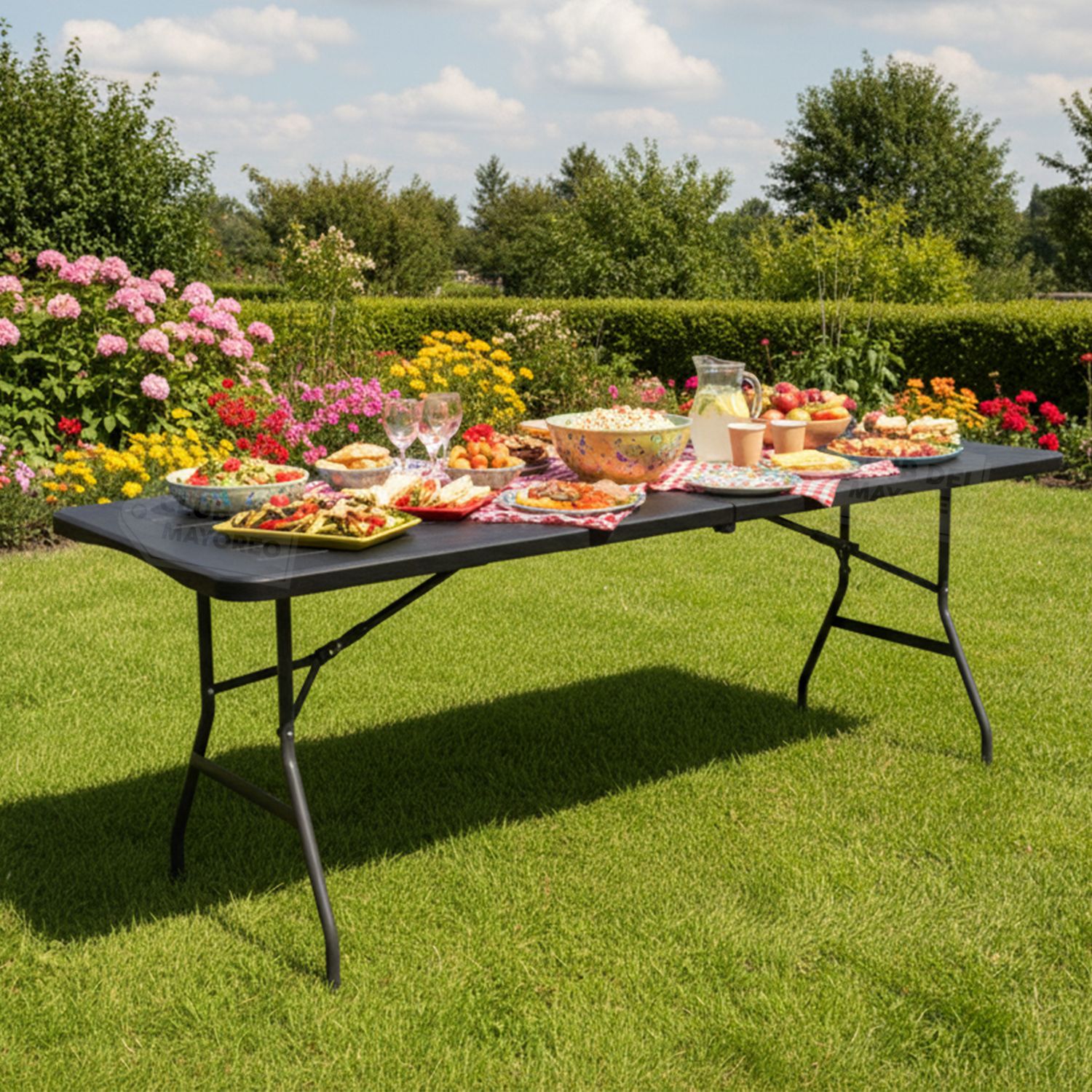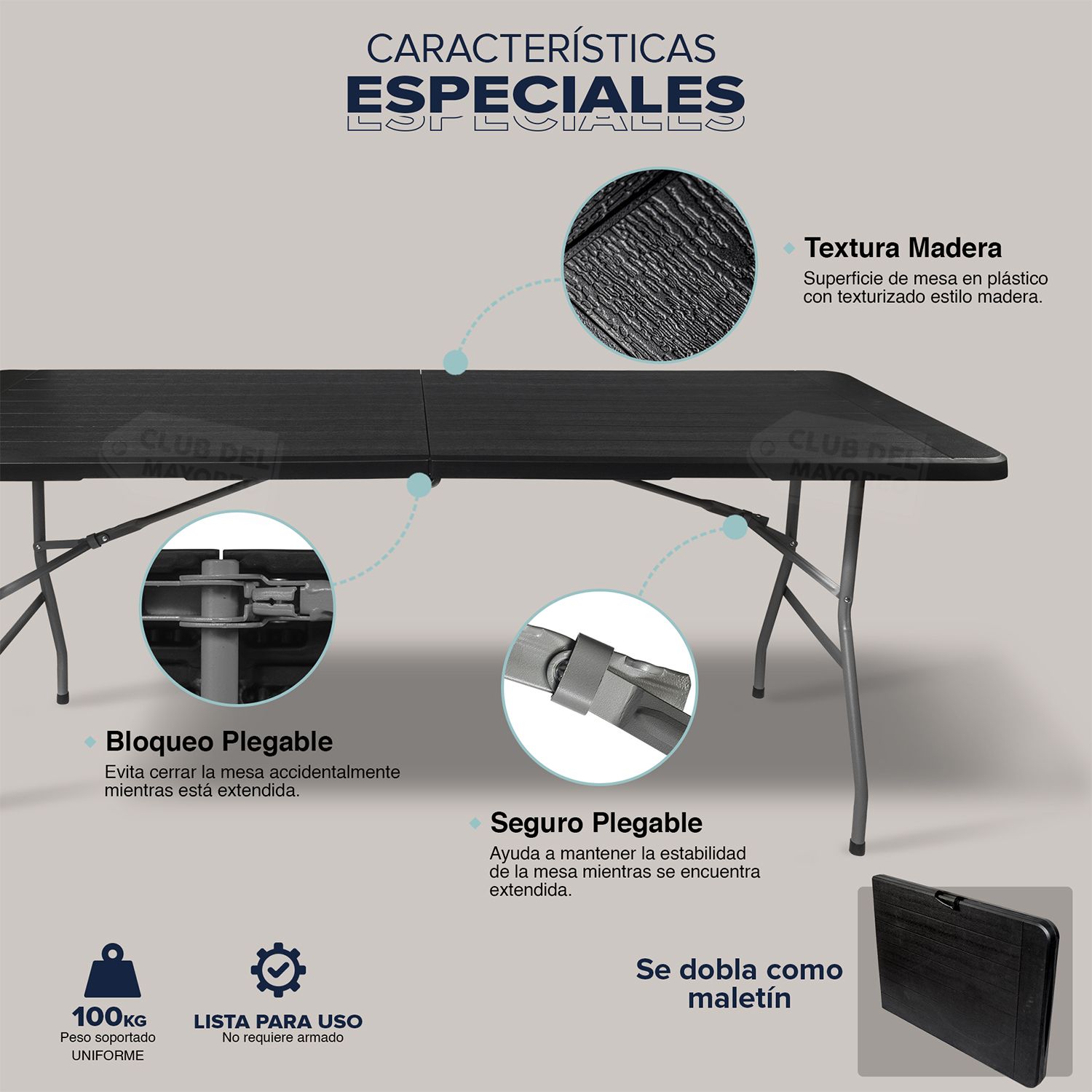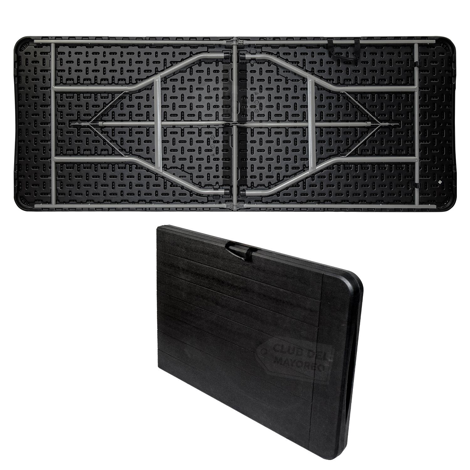 Cuenta con estructura resistente y sistema plegable, lo que facilita su armado, transporte y almacenamiento. Es una excelente opción para quienes buscan una mesa amplia, funcional y fácil de guardar cuando no está en uso.