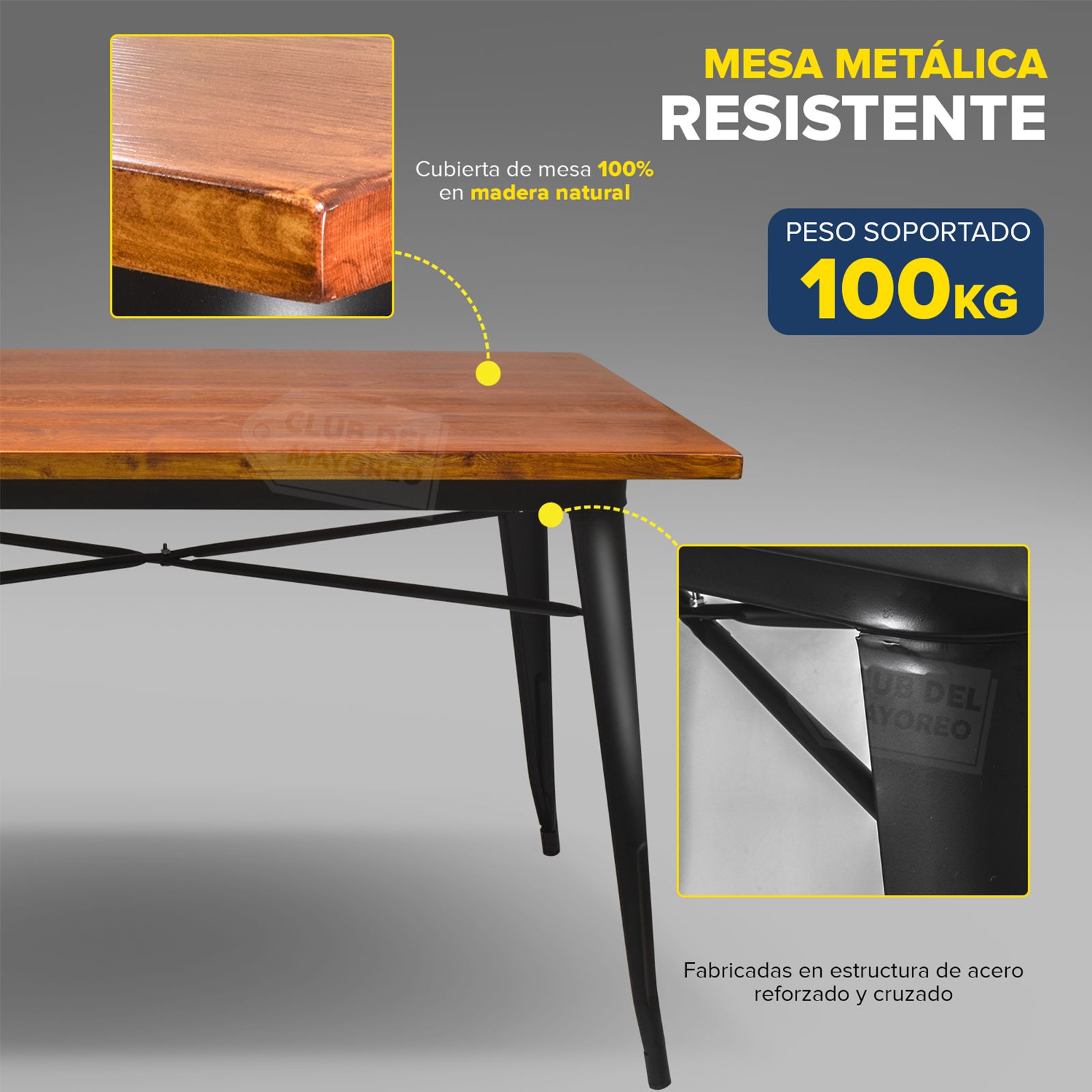 Su estructura robusta de metal y superficie de madera de alta calidad le dan un aspecto único que combina perfectamente con una variedad de estilos decorativos, desde el industrial hasta el contemporáneo. Esta mesa no solo es visualmente atractiva, sino también duradera y resistente, diseñada para resistir el paso del tiempo.